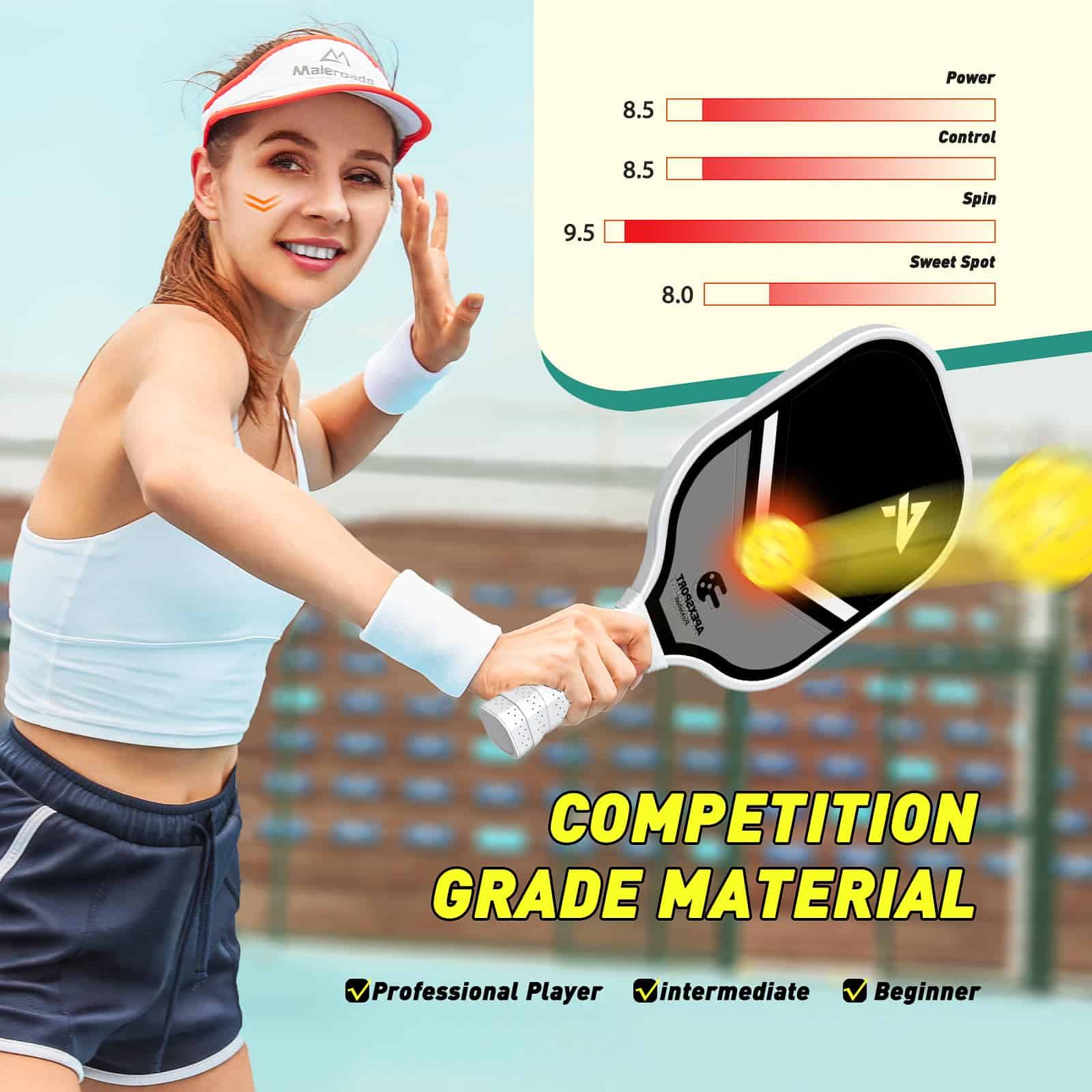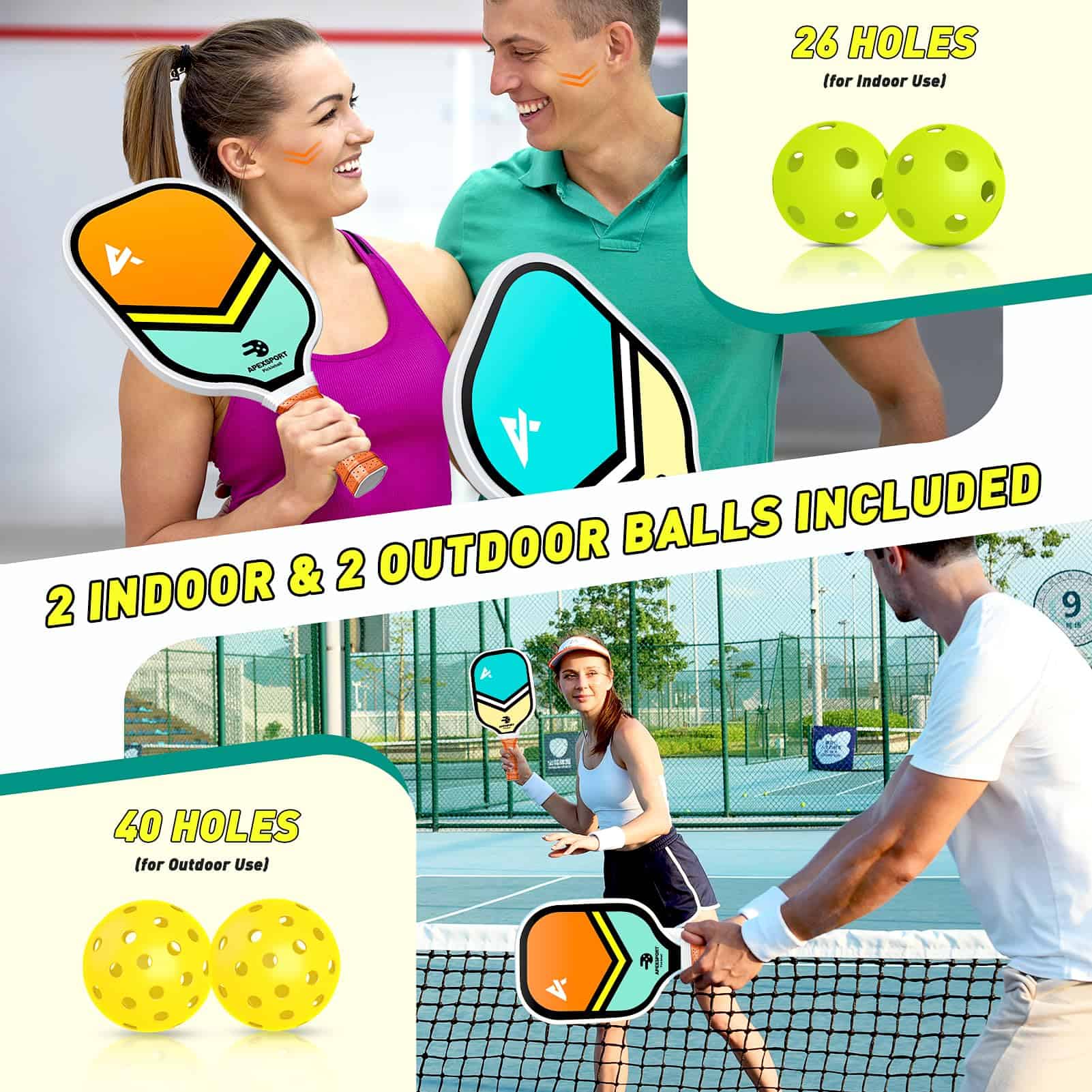 1. Diseño increíblemente elegante y genial: ¡El diseño único, genial y artístico de la paleta de pickleball de ApexSport dejará asombrado al público! Con ella, no solo disfrutarás de su combinación óptimamente equilibrada de potencia, giro, perdón y maniobrabilidad para ayudarte a rendir al máximo, sino que también estarás listo para recibir cumplidos por su patrón único. ¡Serás una superestrella del pickleball!. 2. ¡Experimenta más tiros ganadores! – El conjunto de pickleball de ApexSport está meticulosamente diseñado con la máxima comodidad al golpear la pelota en mente. La cara más ancha (10.63″L x 8.07″W x 0.47″H) ofrece un punto dulce más espacioso para que incluso como principiante, puedas controlar la pelota y golpear tiros predecibles incluso cuando la pelota está descentrada, ¡dándote más oportunidades para ganar tu juego!. 3. ¡Swing con satisfacción y confianza! – Las paletas de pickleball de ApexSport (set de 2) proporcionan el mejor agarre para cada usuario. El agarre (4.92 pulgadas de largo) cuenta con hilos y perforaciones amortiguadores para absorber eficazmente el impacto y el sudor, permitiéndote balancear y golpear la pelota de forma más ágil y cómoda sin fatiga incluso después de largas horas de juego. ¡Un buen agarre te ayudará a ganar el juego!. 4. Diseñado para principiantes y profesionales: la raqueta de pickleball de ApexSport cuenta con la aprobación oficial de USA Pickleball para uso en torneos. Cada raqueta cuenta con una construcción robusta elaborada a partir de fibra de vidrio resistente, combinada con un núcleo de panal de polímero. Esta combinación no solo mantiene las raquetas de pickleball livianas (solo 7.8 oz) sino que también les confiere un impacto potente, permitiendo incluso a los adultos mayores jugar cómodamente durante periodos prolongados. 5. Regalo perfecto de Pickleball – El conjunto de paletas de pickleball de ApexSport incluye: 4 paletas de pickleball livianas, 2 bolas de pickleball para exteriores, 2 bolas de pickleball para interiores y 1 bolsa de transporte de pickleball. Genial para escuelas, centros comunitarios, clubes deportivos, también perfecto como regalo. Añade más diversión a tu familia y amigos.