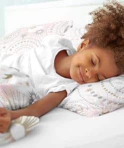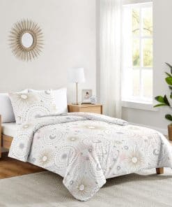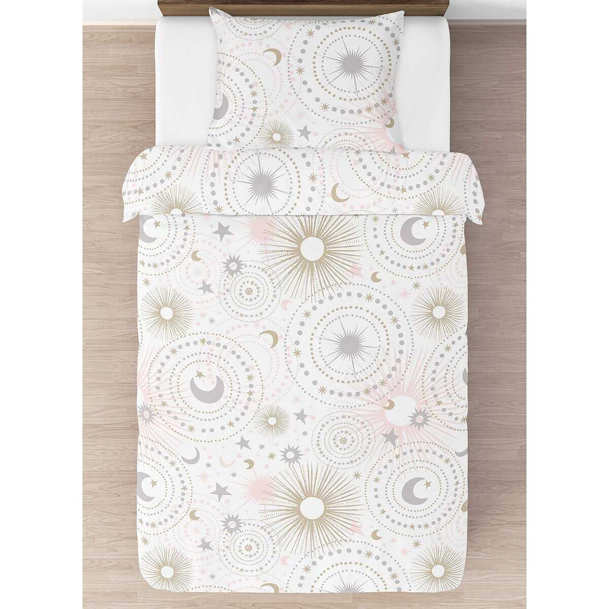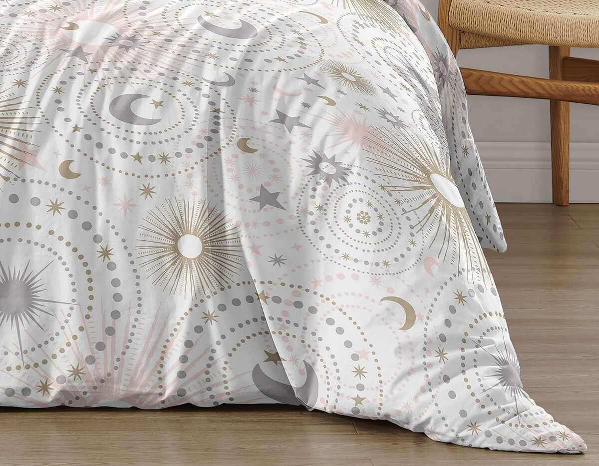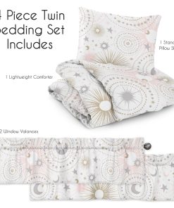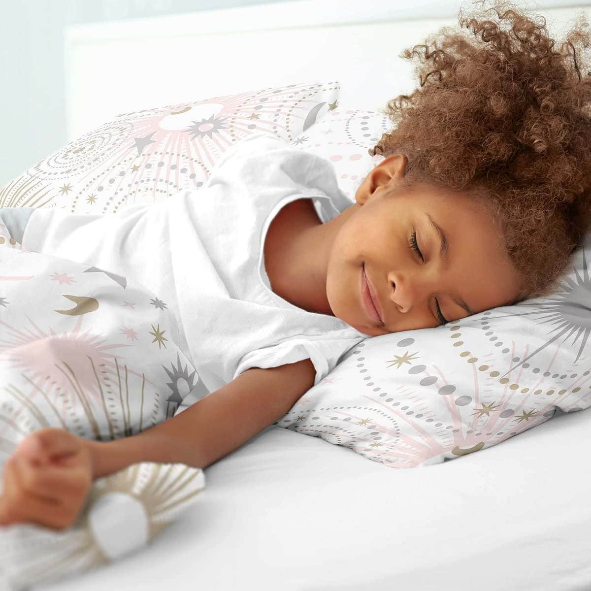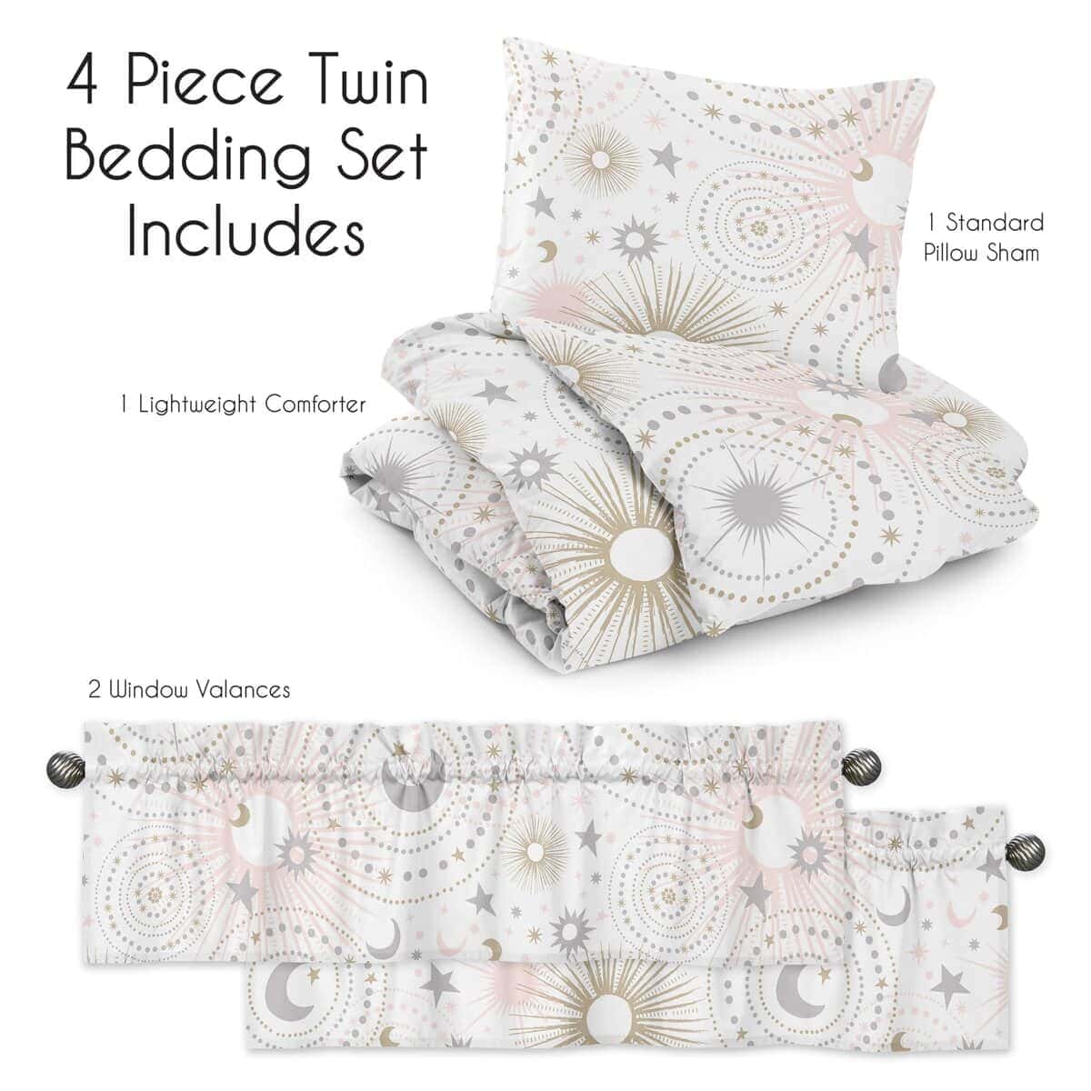 Con el set de ropa de cama para niños Sweet Jojo Designs, tu pequeño tendrá un dormitorio lleno de magia y encanto. Con un diseño exclusivo de estrellas y lunas en tonos rosa rubor, oro metálico, gris y blanco, este set de 4 piezas incluye un edredón ligero, una funda de almohada estándar y dos cortinas para ventanas. La tela de microfibra cepillada garantiza confort y durabilidad, además de ser fácil de lavar a máquina. Completa la decoración con los accesorios a juego como tratamientos para ventanas, cestos, cortinas de baño y almohadas para lograr un look celestial en la habitación de tu hijo.