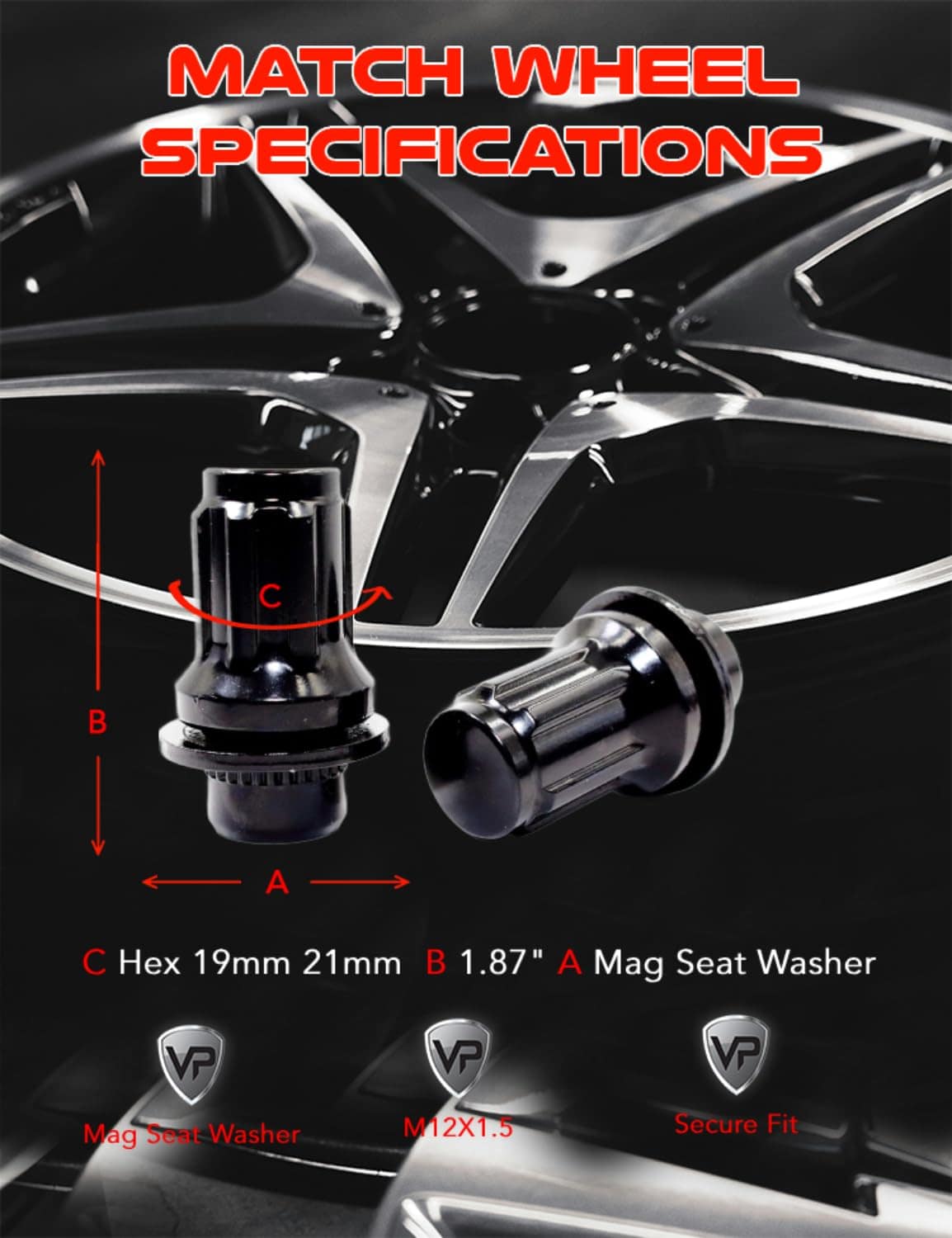 Juego de 4 Bloqueos de Rueda de Estilo Mag Negro de Fábrica OEM de Veritek para Toyota Tacoma 4Runner FJ Cruiser Lexus GX. Este juego incluye 4 bloqueos de rueda fabricados con material de acero de grado 10.9 tratado térmicamente para mayor resistencia y durabilidad. Con rosca de 12×1.5mm y llave hexagonal de 19mm y 21mm. Asiento mag con acabado negro. La longitud total es de 1.87 pulgadas. Estos bloqueos de rueda son forjados en frío para cumplir o superar los estándares de fábrica OEM y proporcionar seguridad adicional a tus ruedas.
