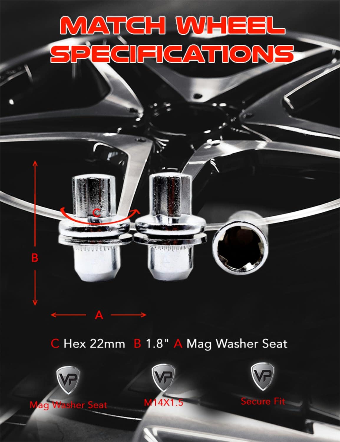 Set de 4 seguros de ruedas de seguridad cromados Veritek para Land Rover Range Rover Discovery LR3 LR4 HSE Sport Factory Wheels. Estos seguros de ruedas están diseñados con una llave hexagonal de 19mm tratada térmicamente para adaptarse a las ruedas de fábrica OEM de Range Rover. Con una rosca de 14×1.5mm, un ancho de vástago de 0.90» y una altura de vástago de 0.90», su longitud total es de 1.85». Fabricados con acero de grado 10.9 tratado térmicamente, estos seguros de ruedas están templados para una máxima durabilidad y resistencia a la tracción, cumpliendo o superando los estándares de fábrica OEM. Protege tus ruedas con estos seguros de alta calidad.
