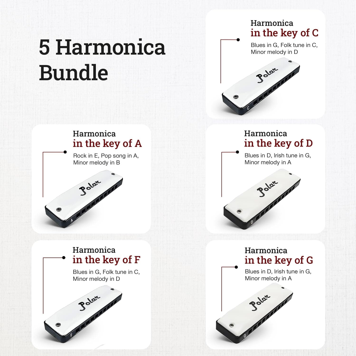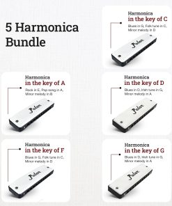 Conjunto de 5 armónicas de la marca Harmo, en los tonos de Do, Re, Fa, Sol y La, diseñadas y verificadas en los Estados Unidos. Esta marca de armónicas es propiedad de músicos, lo que garantiza una calidad profesional ideal para diferentes estilos musicales como Blues, Country, Folk, Pop y Rock. Las armónicas son muy potentes y sensibles, con bordes redondeados suaves para una experiencia de uso cómoda. Además, este set viene con una garantía de satisfacción de 30 días para tu tranquilidad.
