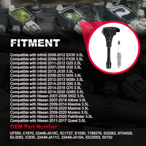 Este set de bobinas de encendido y bujías de iridio es compatible con una amplia gama de modelos Nissan e Infiniti. Incluye las OEM PART NUMBERS UF550, C1670, 22448-JA10C, IC630, C1670, 1788376, 522082, 5C1727, E1050, 52-2082, 6734029, 22448-JA11C, 22448-JA10A, IGC0003, 50150. Con estos componentes, puedes eliminar problemas comunes de fallos y funcionamiento irregular en tu vehículo. Ofrecemos una garantía de 12 meses y servicio al cliente de por vida. Si tienes alguna pregunta sobre el producto, contáctanos a través de mensaje en el fabricante.