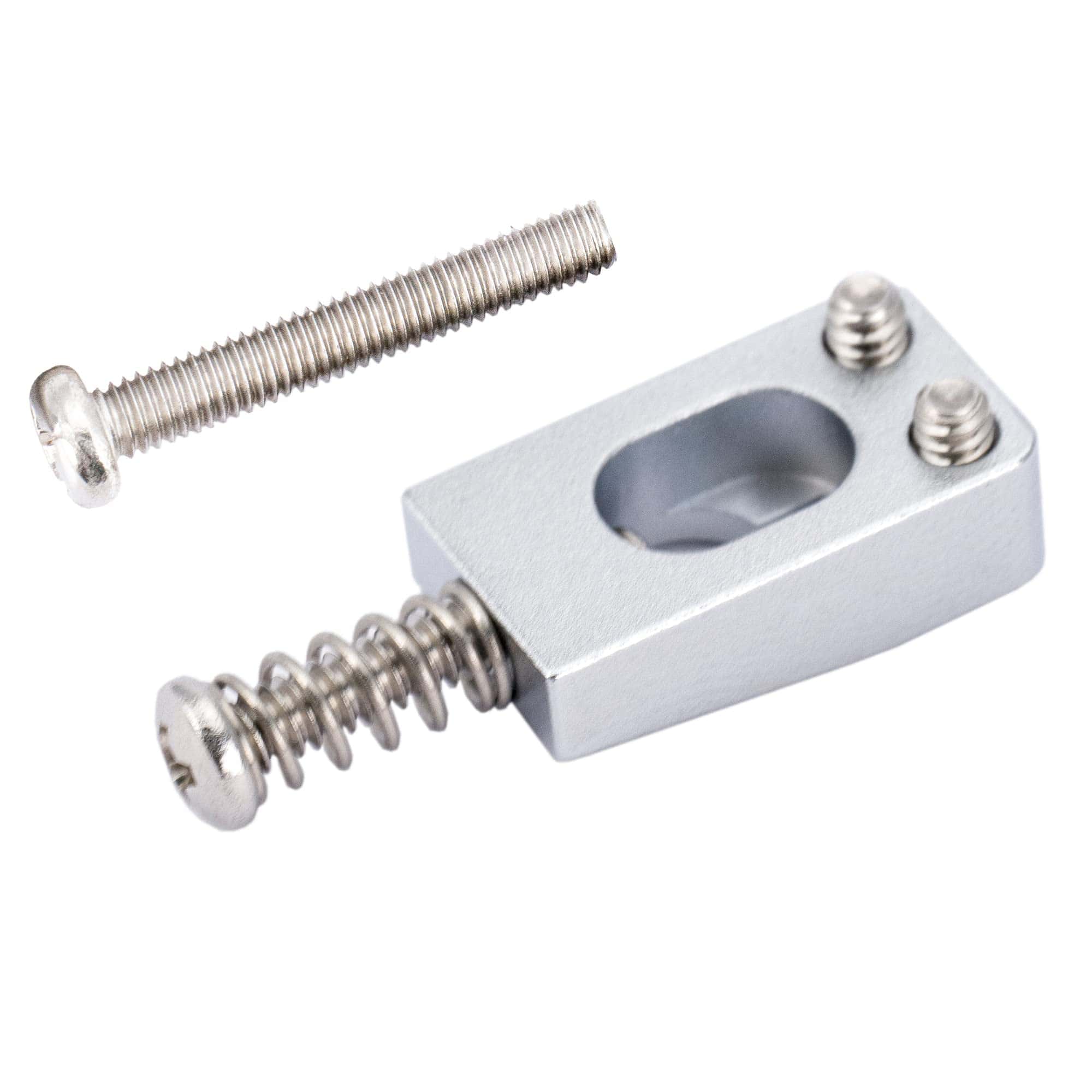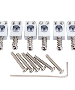 Set de 6 Selletas de Puente de Tremolo Estilo PRS de 10.5mm de Latón para Guitarra Eléctrica Estilo Strat, Cromado. Este set de selletas de puente de tremolo está diseñado para ser un buen reemplazo para las selletas de puente de tremolo estilo PRS originales. Son compatibles con puentes de tremolo de guitarras eléctricas estilo Strat fabricadas en Asia/México con un espaciado de cuerda de 52.5mm (2-1/16 pulgadas), como Fender Mexican, Squier Strat. Las selletas están hechas de latón puro, mecanizadas con precisión para garantizar durabilidad y estabilidad, lo que proporciona una mejor entonación. El diseño moderno con bisel garantiza que no haya bordes ásperos, lo que ayuda a reducir la rotura de las cuerdas. Este set incluye 6 selletas y todos los accesorios de montaje necesarios para su instalación.