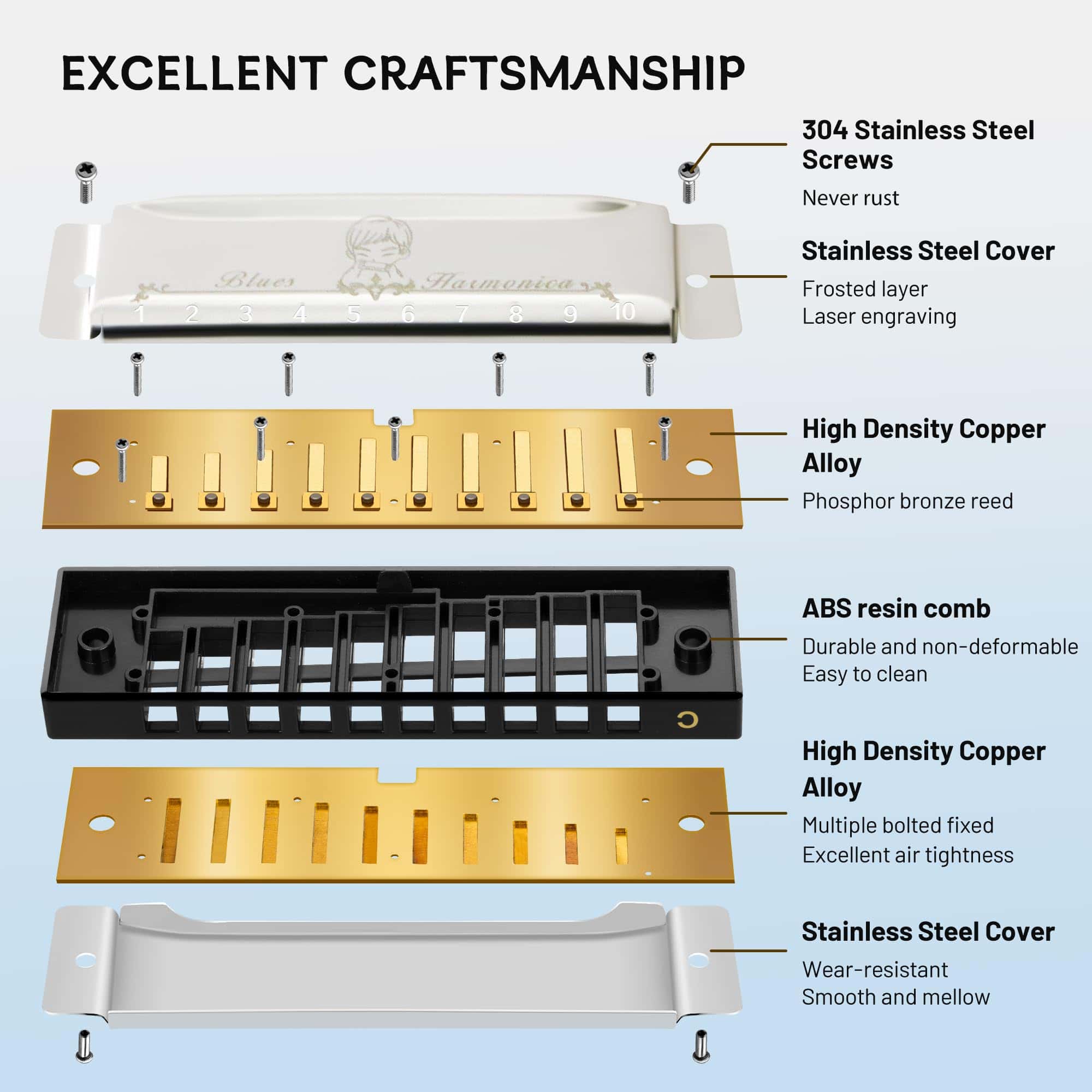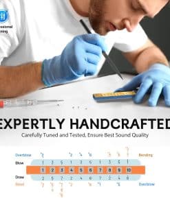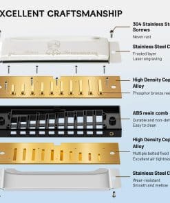 Somos el fabricante de armónicas de la marca EASTTOP. Esta es una armónica de blues de 10 agujeros. Material: placa de cobre, carcasa de acero inoxidable, peine de ABS con logotipo láser de Easttop. Claves: A, Bb, C, D, G, F, G. Empaque: cada armónica en una caja de plástico. Contenido: armónica + paño pequeño + caja de plástico. Color de la armónica: plateado con logotipo láser de Easttop. Material: lengüetas de bronce de fósforo con remache, placa de lengüetas de latón, cubierta de acero inoxidable, peine de ABS. Mantenimiento y limpieza: Use alcohol etílico al 70% y rocíe sobre la cubierta y el peine, luego limpie la superficie con un paño. No aplique calor, secador de cabello, luz solar, simplemente deje secar al aire. Si hay algunas cosas pequeñas en el peine, puede cepillar ligeramente con un cepillo muy suave. No use herramientas afiladas, dañará las lengüetas. Si desea abrir la cubierta, tenga cuidado para guardar los tornillos.