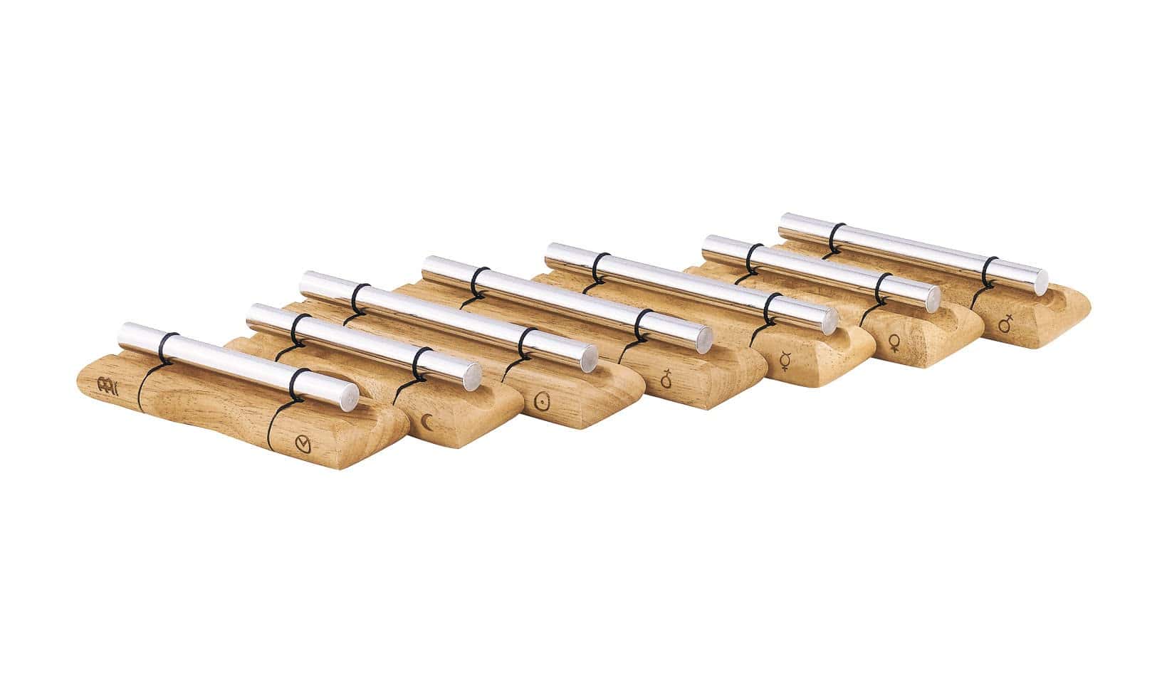 Los Chimes de Energía Sintonizados Planetariamente de Meinl se crean utilizando los cálculos de Hans Cousto (La Octava Cósmica) para que coincidan con las frecuencias del Sol, la luna y los planetas. Cada chime está afinado para crear la frecuencia coincidente del cuerpo celestial. Hechos con aleación de aluminio anodizado en plata para obtener una frecuencia exacta. La base de madera decorativa está terminada con un logo grabado y un símbolo de ajuste, y cada chime viene con un martillo de madera que produce una nota clara y definida para llenar fácilmente tu espacio (pequeño o grande) con un sonido tranquilizador. Este martillo se puede guardar cómodamente en la base de madera al meterlo debajo del chime. Estos chimes de energía de alta calidad son ideales para fines terapéuticos y meditativos, pero también pueden ser utilizados en aulas o como señal de sonido. Los chimes incluidos en este Set de 7 Chakras son: Año Platónico (Chakra de la Corona), Venus (Chakra Frontal), Mercurio (Chakra de la Garganta), Año de la Tierra/Om (Chakra del Corazón), Sol (Chakra del Plexo Solar), Luna Sinódica (Chakra Sacro) y Día Sinódico (Chakra Raíz).