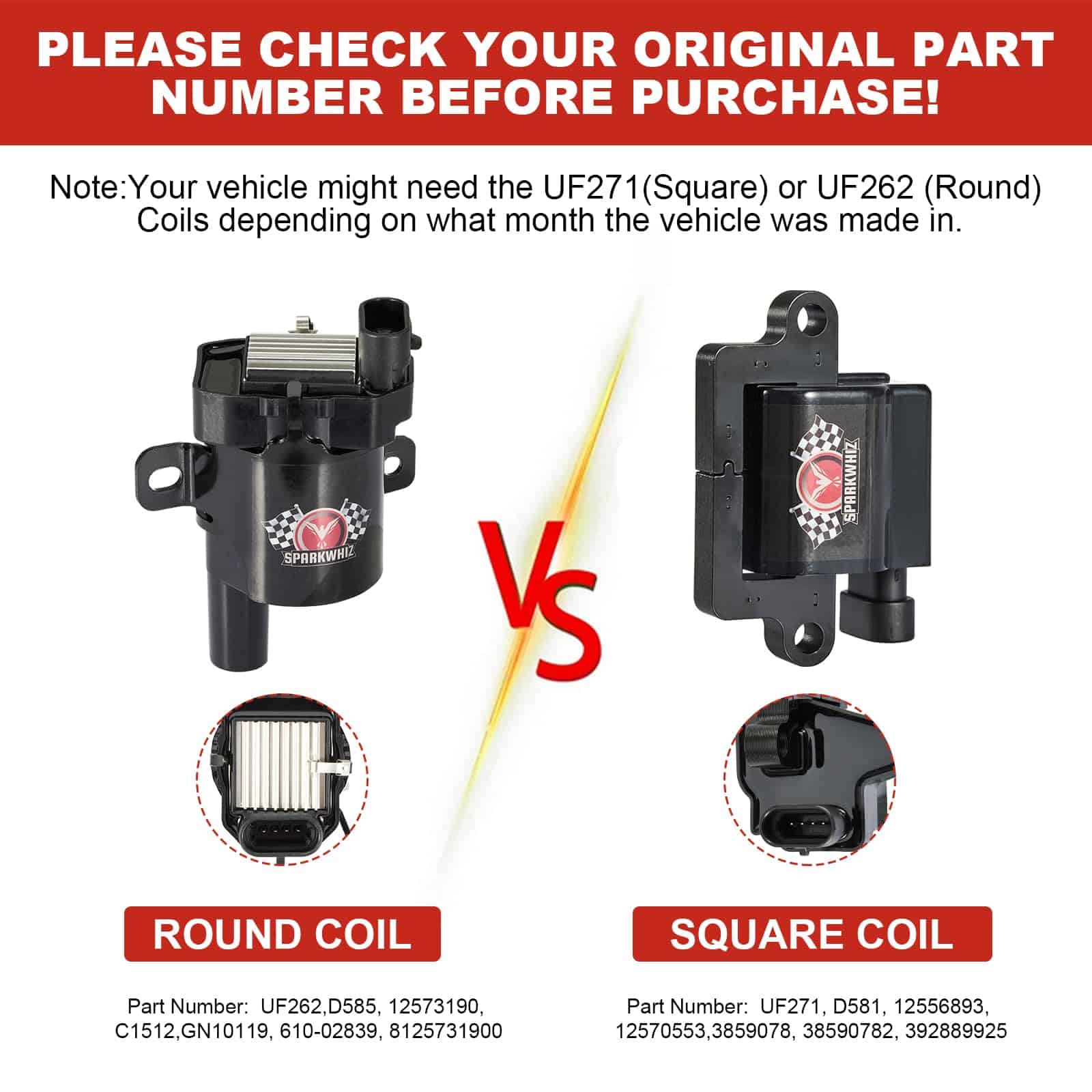 1. ¡Precaución!: El mismo tipo de vehículo puede utilizar diferentes formas de bobina, REDONDA (UF262/D585) o CUADRADA (UF271/D581). Para evitar problemas de instalación, también debes buscar en el compartimiento del motor para verificar la forma de la bobina. Este ASIN es para bobinas REDONDAS (UF262/D585).