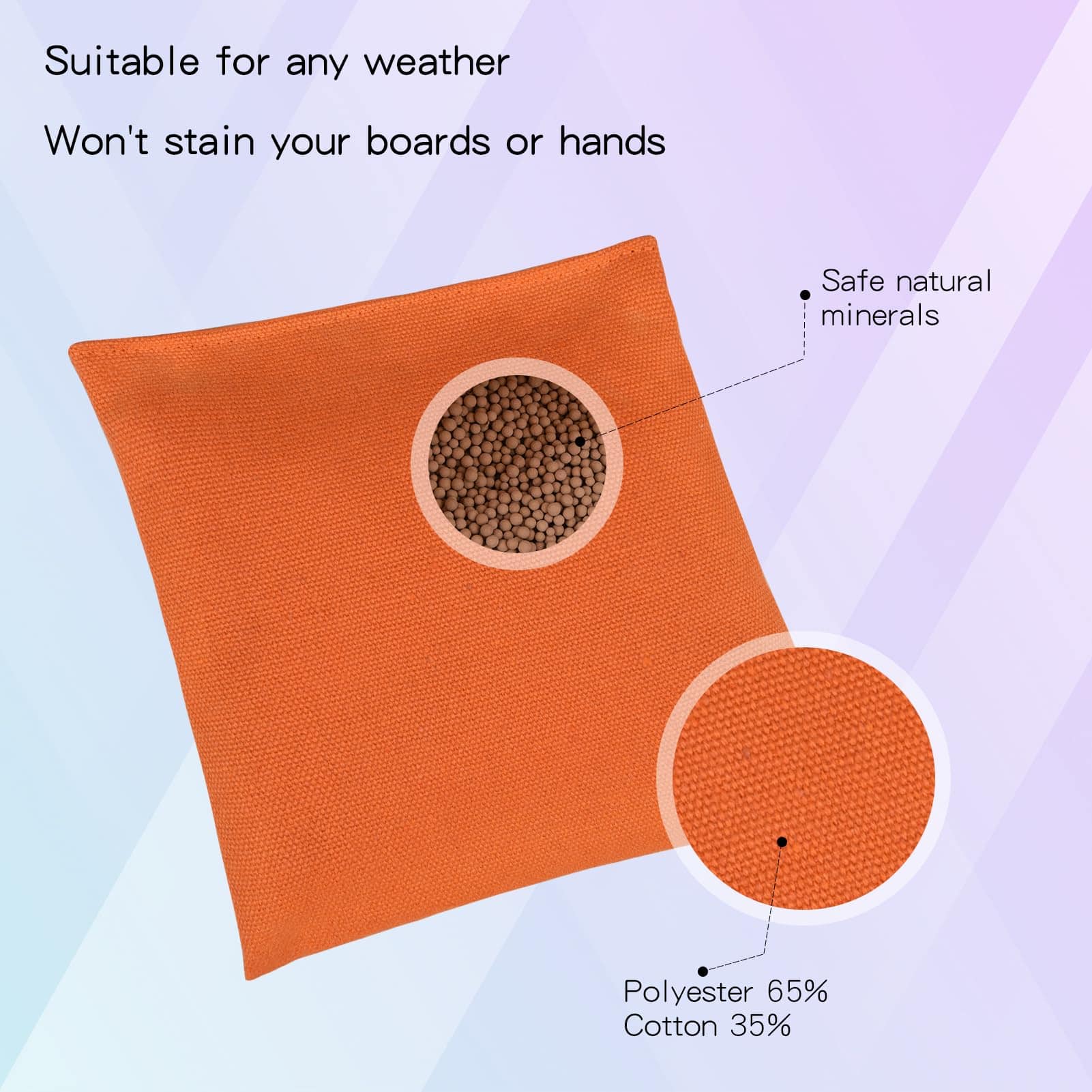 65% Poliéster, 35% Algodón. Importado. Material Duradero: Fabricado con poliéster y algodón duraderos que tienen un buen tacto y agarre en la mano. Perfecto para cualquier tipo de juego en césped, grava o concreto. Set Completo: Cuando compras nuestras bolsas profesionales de cornhole, recibes un set de 8 que son duraderas, resistentes a la intemperie y vienen en una variedad de colores y diseños. Además, vienen con una bolsa de transporte para un fácil transporte, para que las puedas llevar contigo donde sea que vayas. Perfecto para Todas las Edades: Nuestras bolsas de frijol para lanzar son perfectas para todas las edades. Ya seas un niño o un adulto, puedes disfrutar de un juego de cornhole con nuestras bolsas. El material está diseñado para ser seguro y cómodo para todas las edades, así que puedes divertirte sin preocuparte por la seguridad.