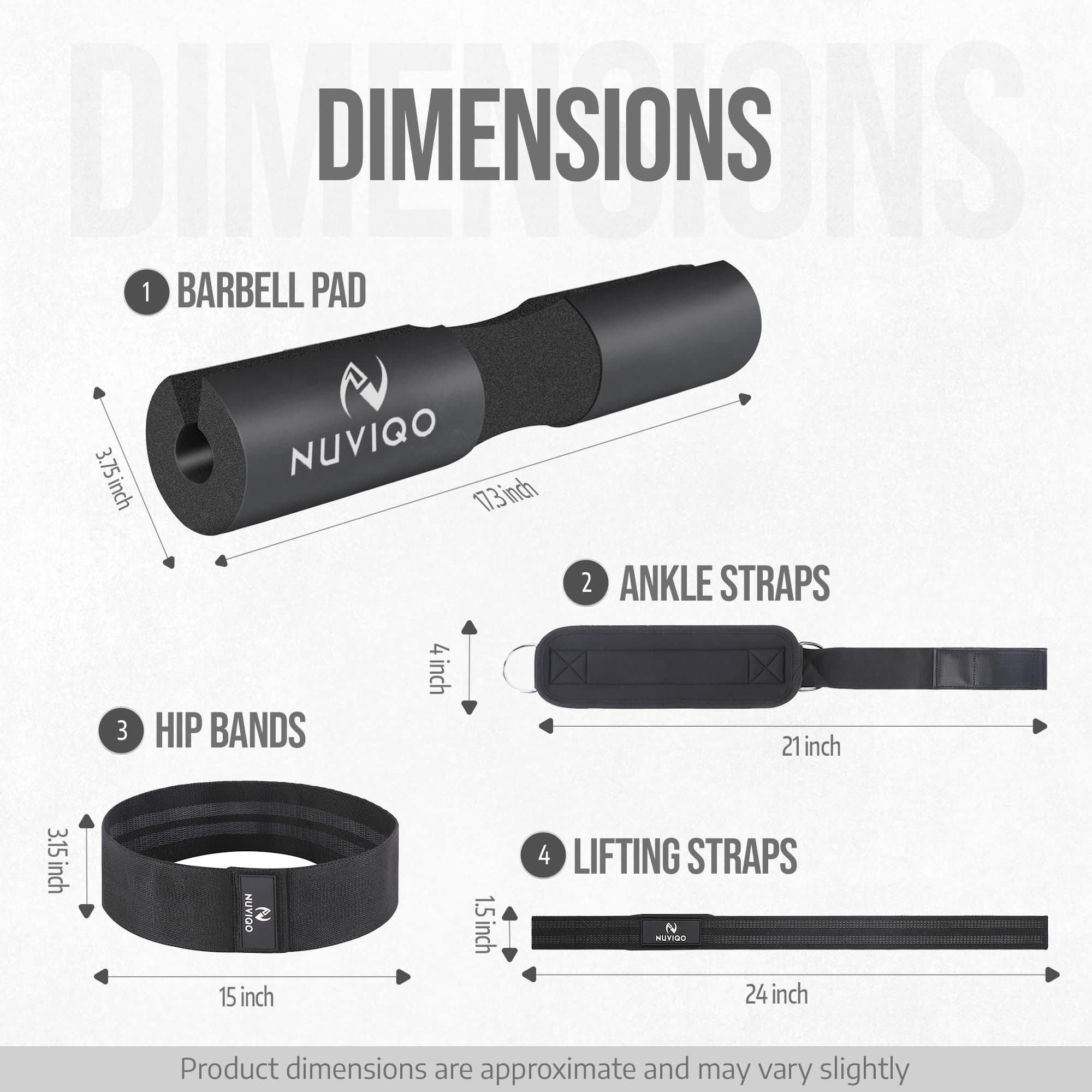 1. ¡TODO EN UNO! Almohadilla para barra, correas para tobillo, correas para levantamiento de pesas y banda de resistencia para cadera, ¡todo en un juego de accesorios de gimnasio! Prepararte para esculpir esas piernas, glúteos y core como un profesional. ¡Tus nuevos accesorios de gimnasio favoritos!