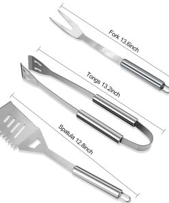 2. ACERO INOXIDABLE DE CALIDAD SUPERIOR – Nuestro set de utensilios para parrilla está hecho de acero inoxidable premium de grado alimenticio, que es libre de BPA. El set de utilidades para parrilla es resistente a la corrosión, resistente al calor y apto para lavavajillas. Los mangos alargados y cómodos te mantienen alejado del calor con un diseño de bucles colgantes que te permiten colgarlos fácilmente de los ganchos de tu parrilla o estante de parrilla. Definitivamente disfrutarás usándolos para cocinar en la cocina y cocinas exteriores.