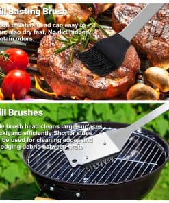 1. SET DE PARRILLA COMPLETO Y VERSÁTIL – Este set de utensilios de parrilla profesional de 11 piezas incluye casi todo lo que necesitas para una barbacoa. Incluye 1 espátula ranurada, 1 tenedor, 1 pinzas, 1 cuchillo, 1 cepillo de untar, 1 cepillo para parrilla, 1 cabezal de limpieza extra, 4 pinchos y un estuche de almacenamiento portátil. Es un gran regalo de barbacoa para cualquier ocasión, perfecto para el día del padre, cumpleaños, Navidad y regalos de San Valentín para él.