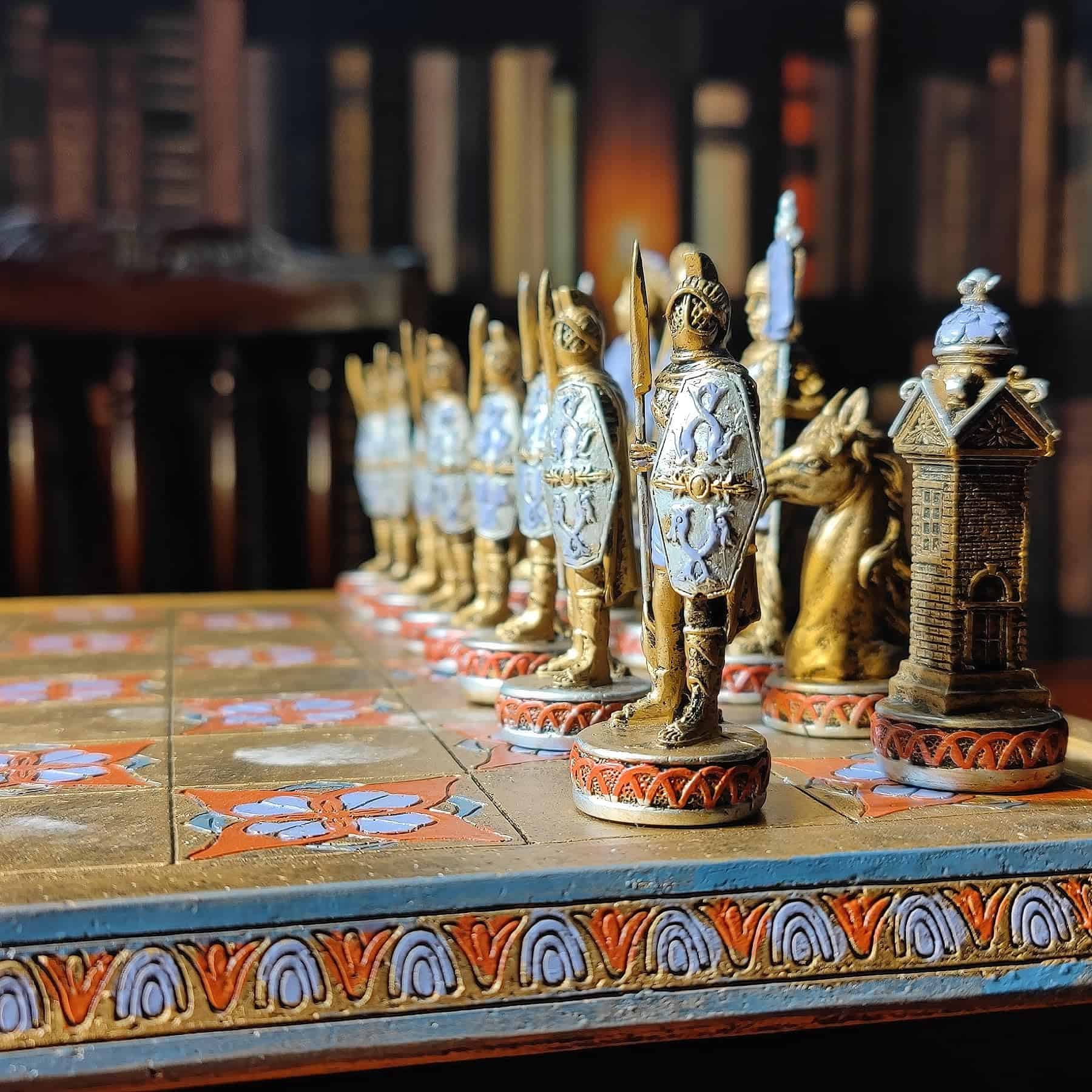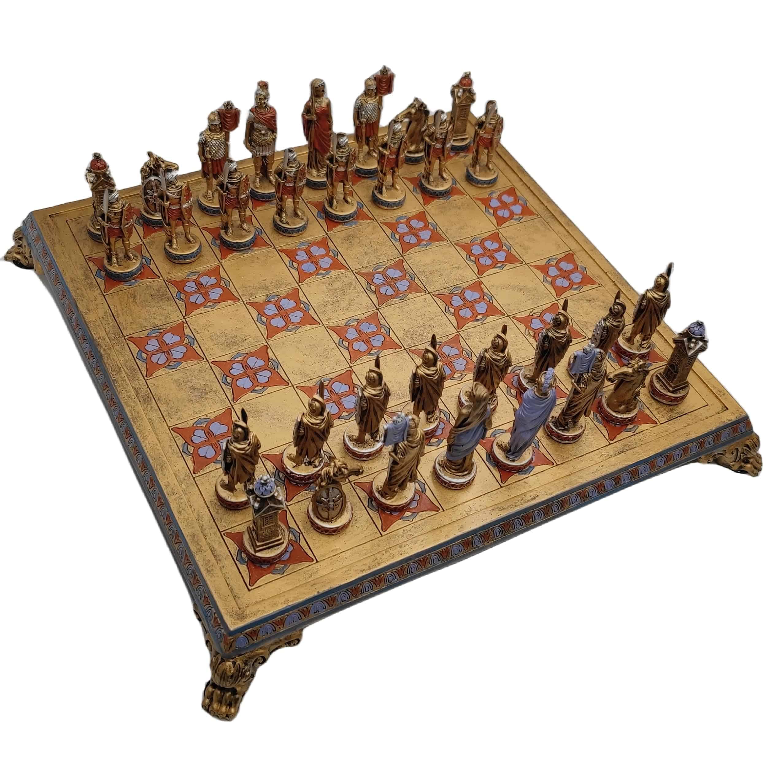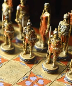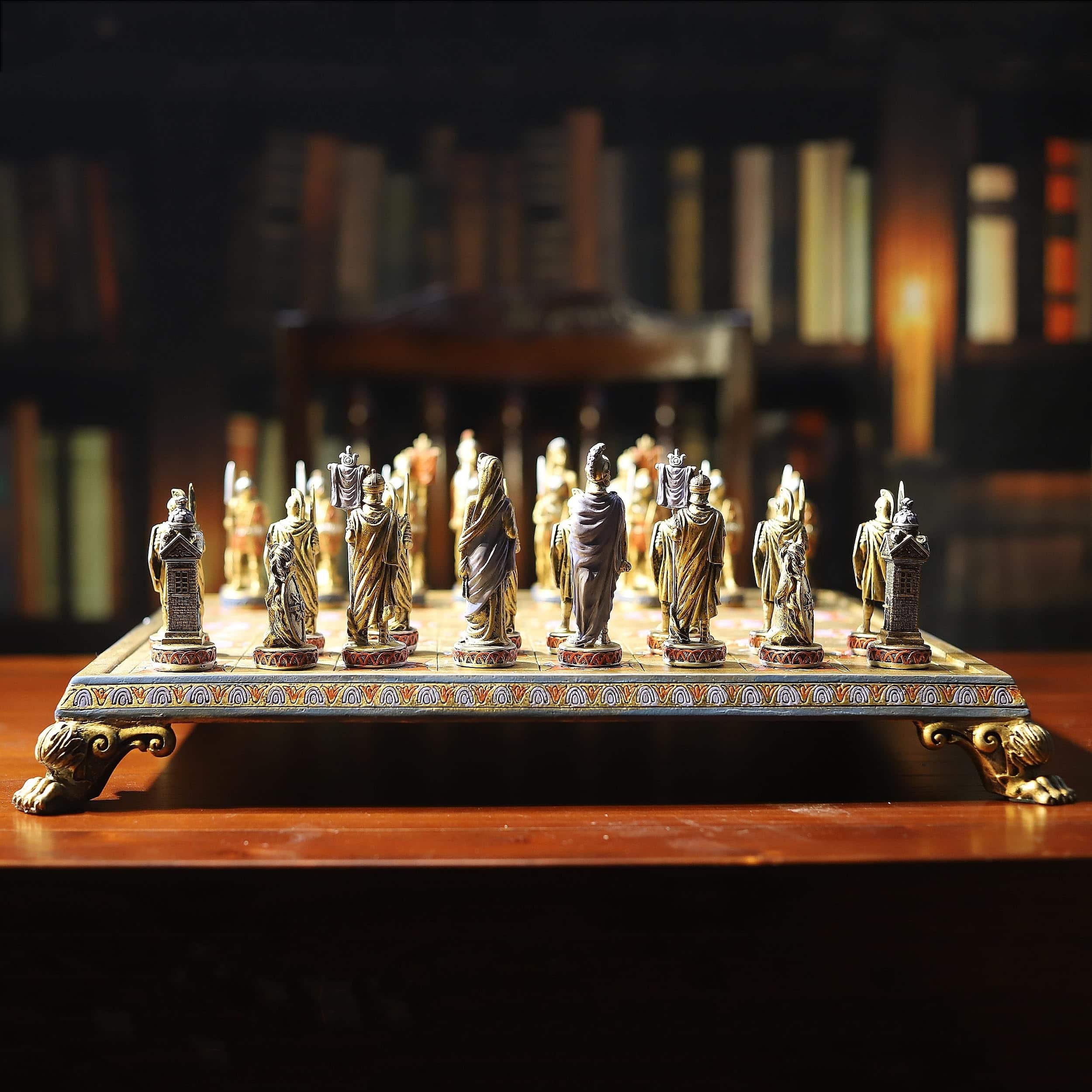 GENUINQ presenta su impresionante set de ajedrez que representa a los guerreros de legión romana antiguos. Cada detalle de este tablero y piezas de ajedrez es cuidadosamente elaborado con una artesanía excepcional. El tablero está meticulosamente pintado a mano con un diseño intrincado que lo hace destacar entre otros sets de ajedrez. Las piezas de ajedrez son verdaderas obras de arte, cada una destacando colores y texturas únicas que muestran una atención meticulosa al detalle.