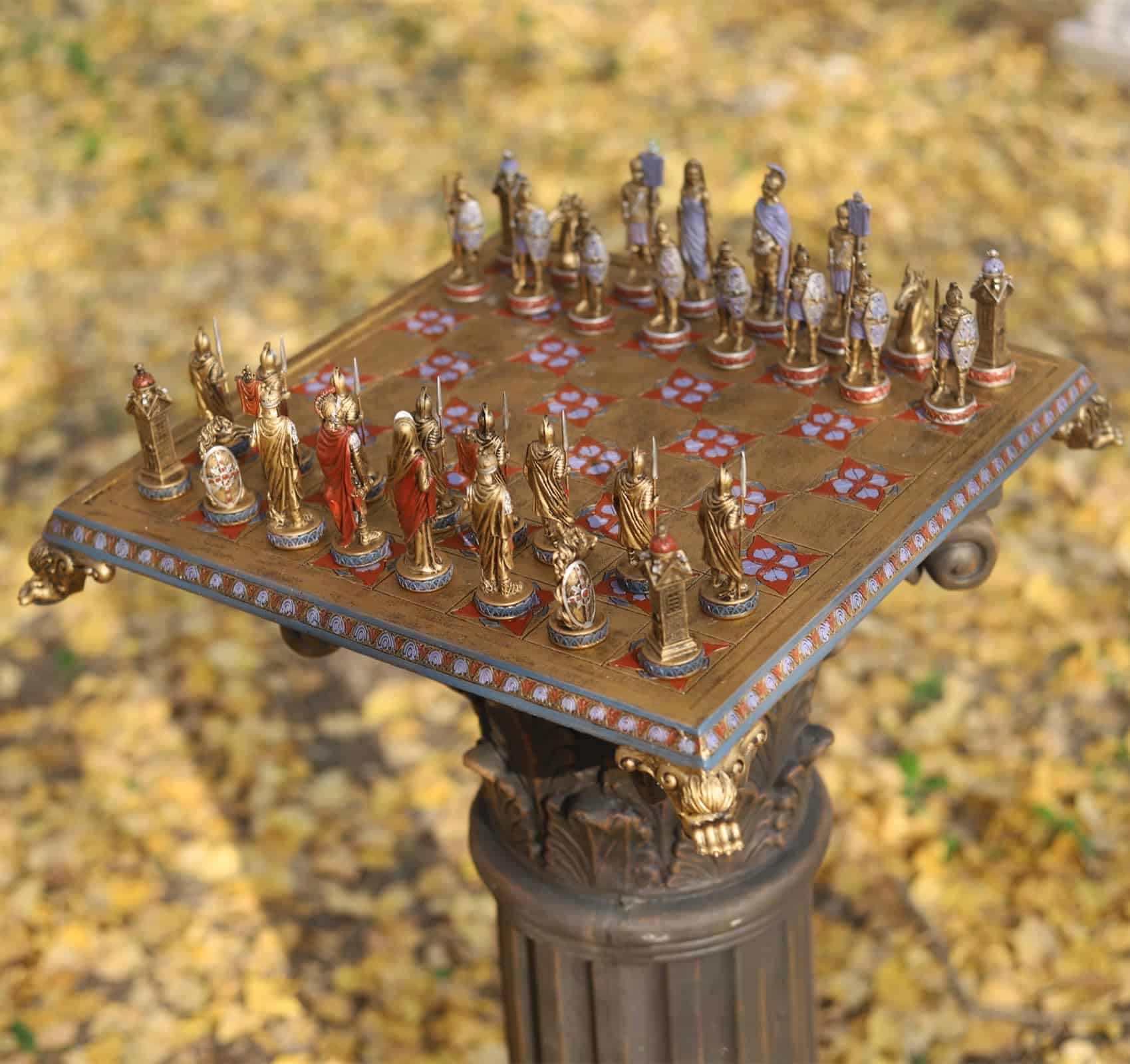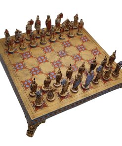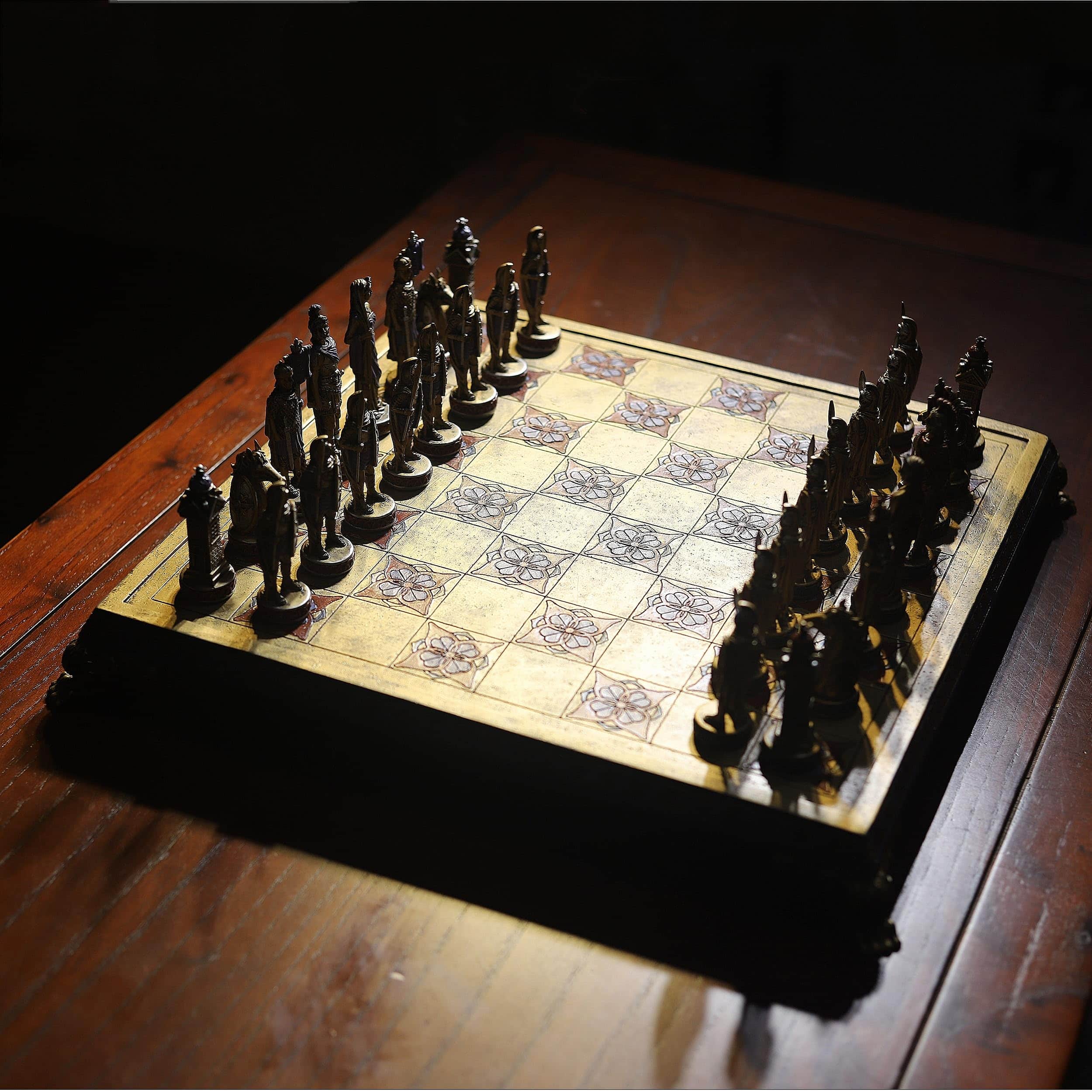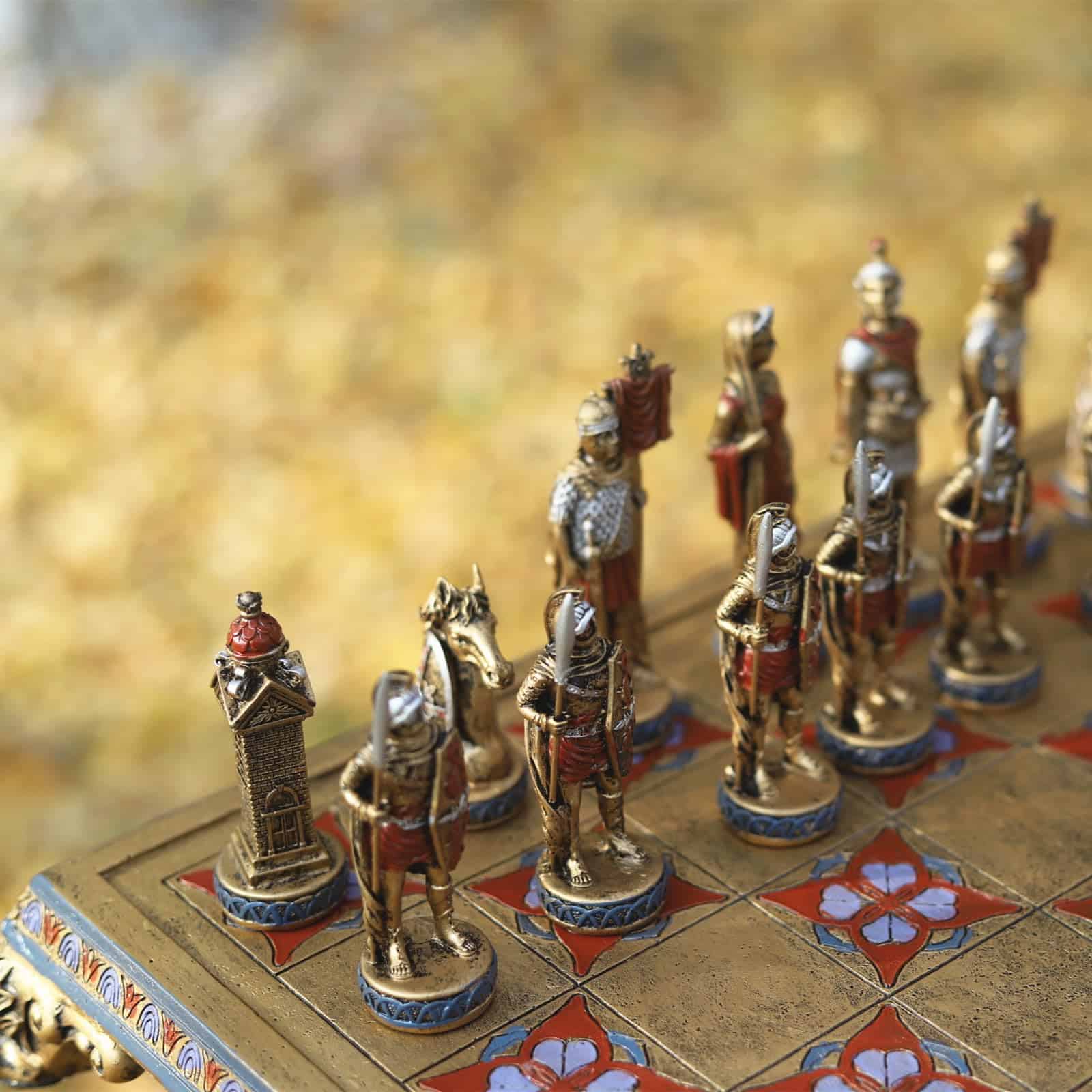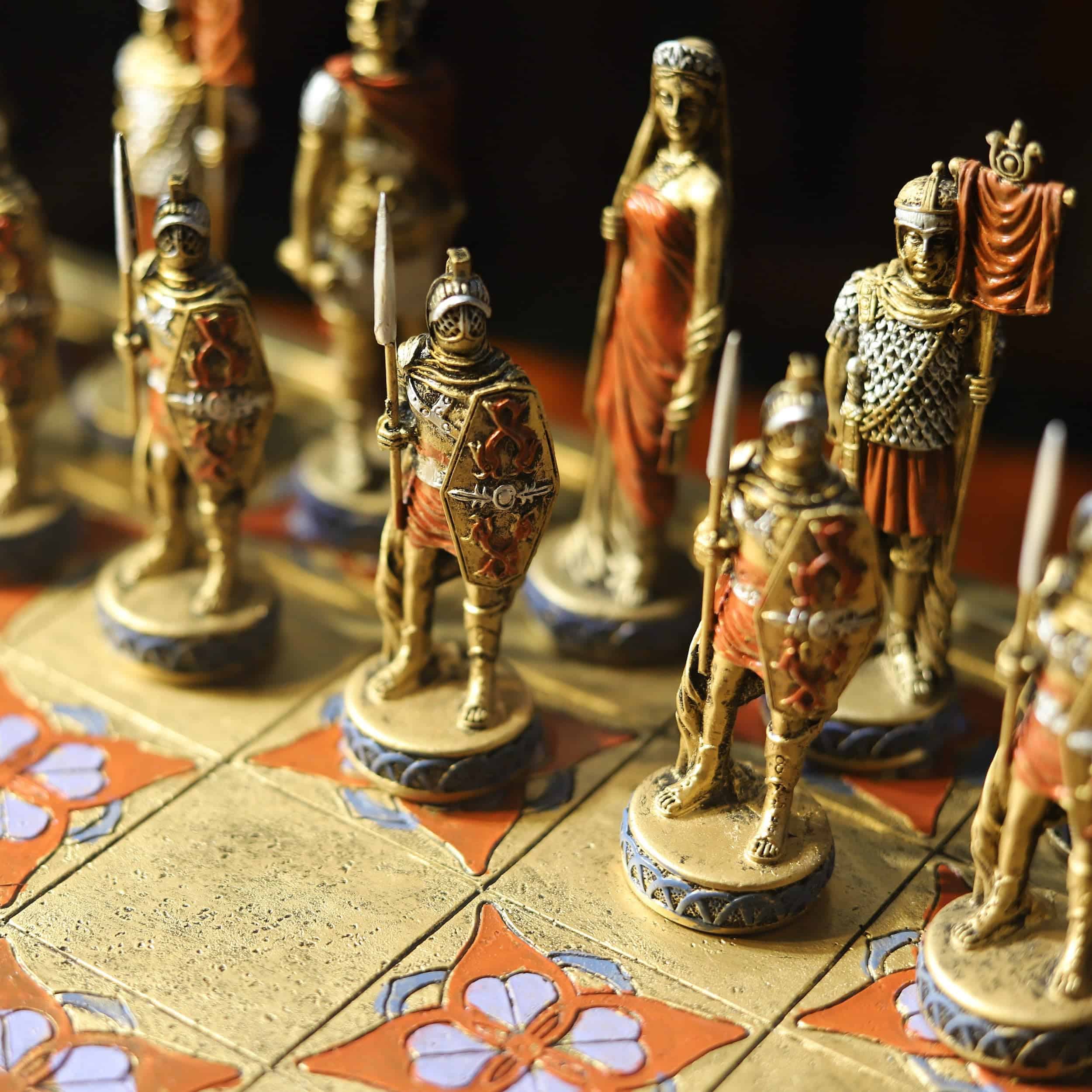GENUINQ presenta su impresionante set de ajedrez que representa a los guerreros de legión romana antiguos. Cada detalle de este tablero y piezas de ajedrez es cuidadosamente elaborado con una artesanía excepcional. El tablero está meticulosamente pintado a mano con un diseño intrincado que lo hace destacar entre otros sets de ajedrez. Las piezas de ajedrez son verdaderas obras de arte, cada una destacando colores y texturas únicas que muestran una atención meticulosa al detalle.