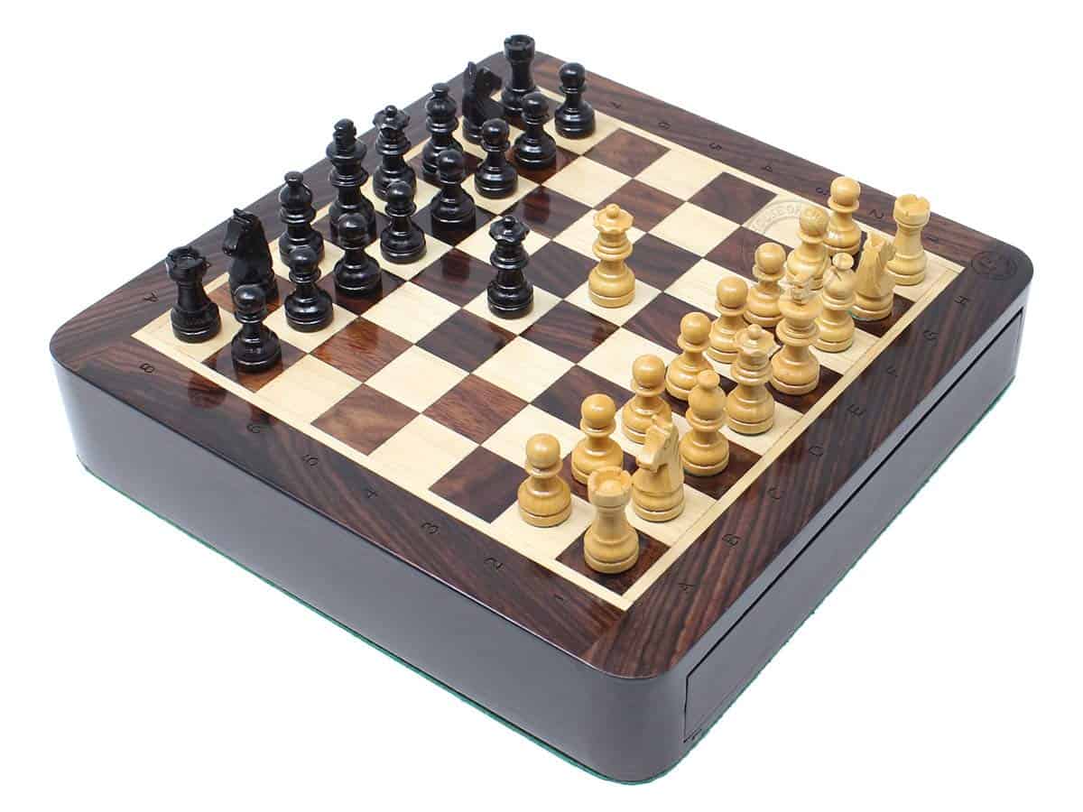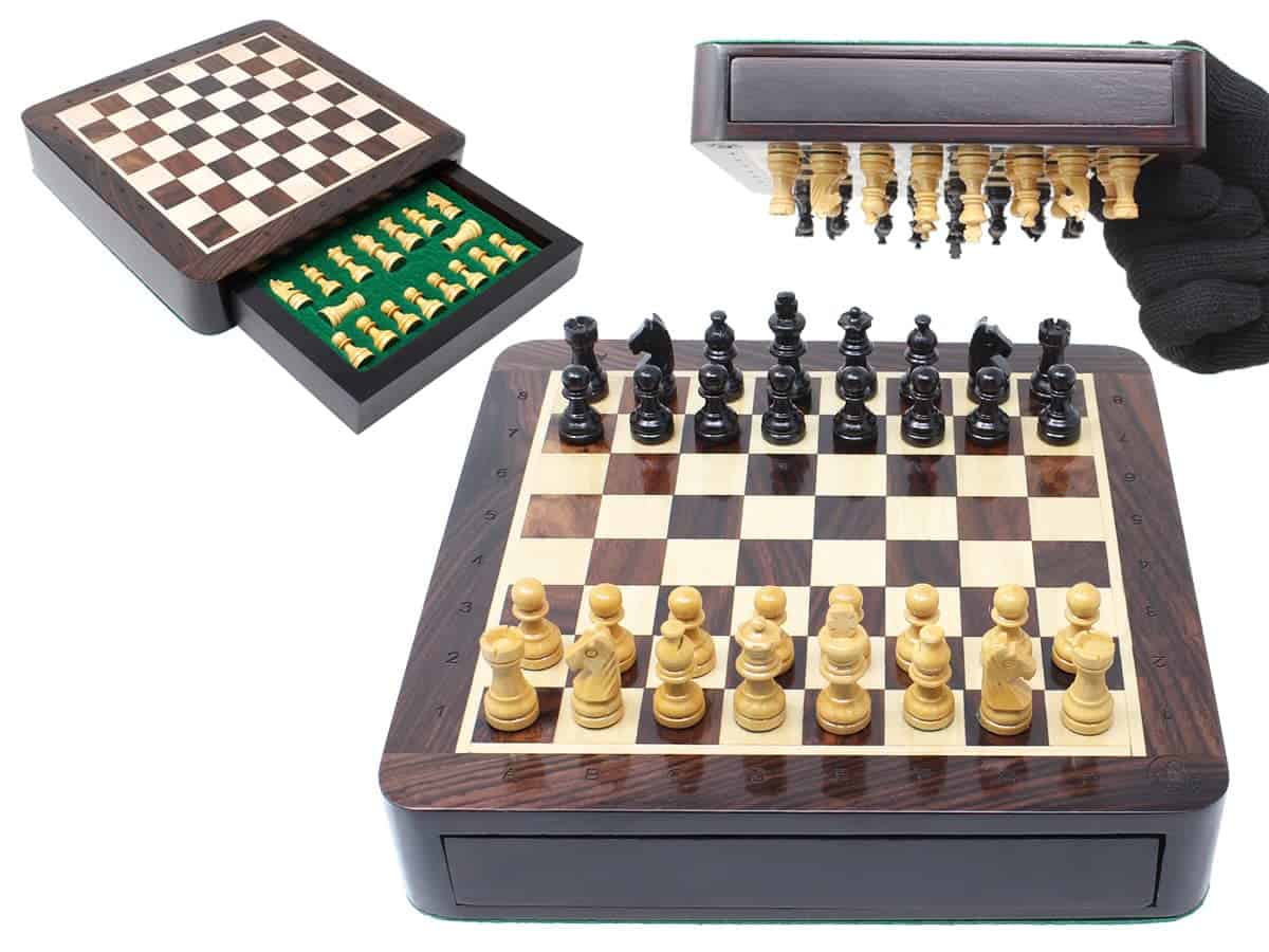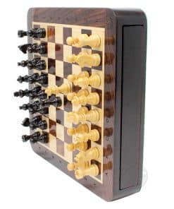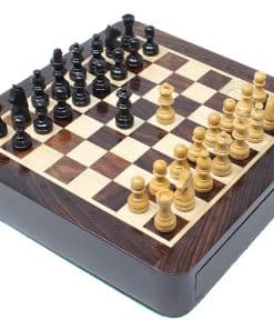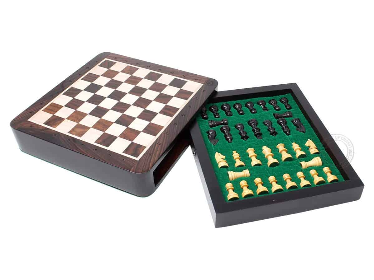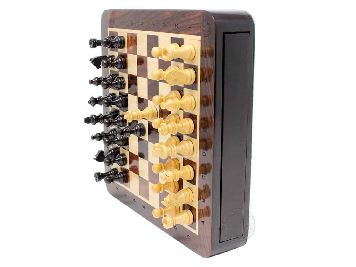 La Casa del Ajedrez presenta un compacto set de ajedrez magnético de viaje en madera de rosa con 2 reinas adicionales, cajones de almacenamiento y notaciones algebraicas. El tablero de ajedrez cuadrado de 7.5″ x 7.5″ (19.5 cm x 19.5 cm) ha sido incrustado a mano en la combinación de madera de rosa y arce, mientras que las piezas de ajedrez de diseño Francés Staunton con un tamaño de rey de 1.34″ (34 mm) han sido talladas a mano en auténtica madera de rosa y boj. También se incluyen dos reinas adicionales con el juego de ajedrez.