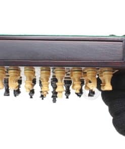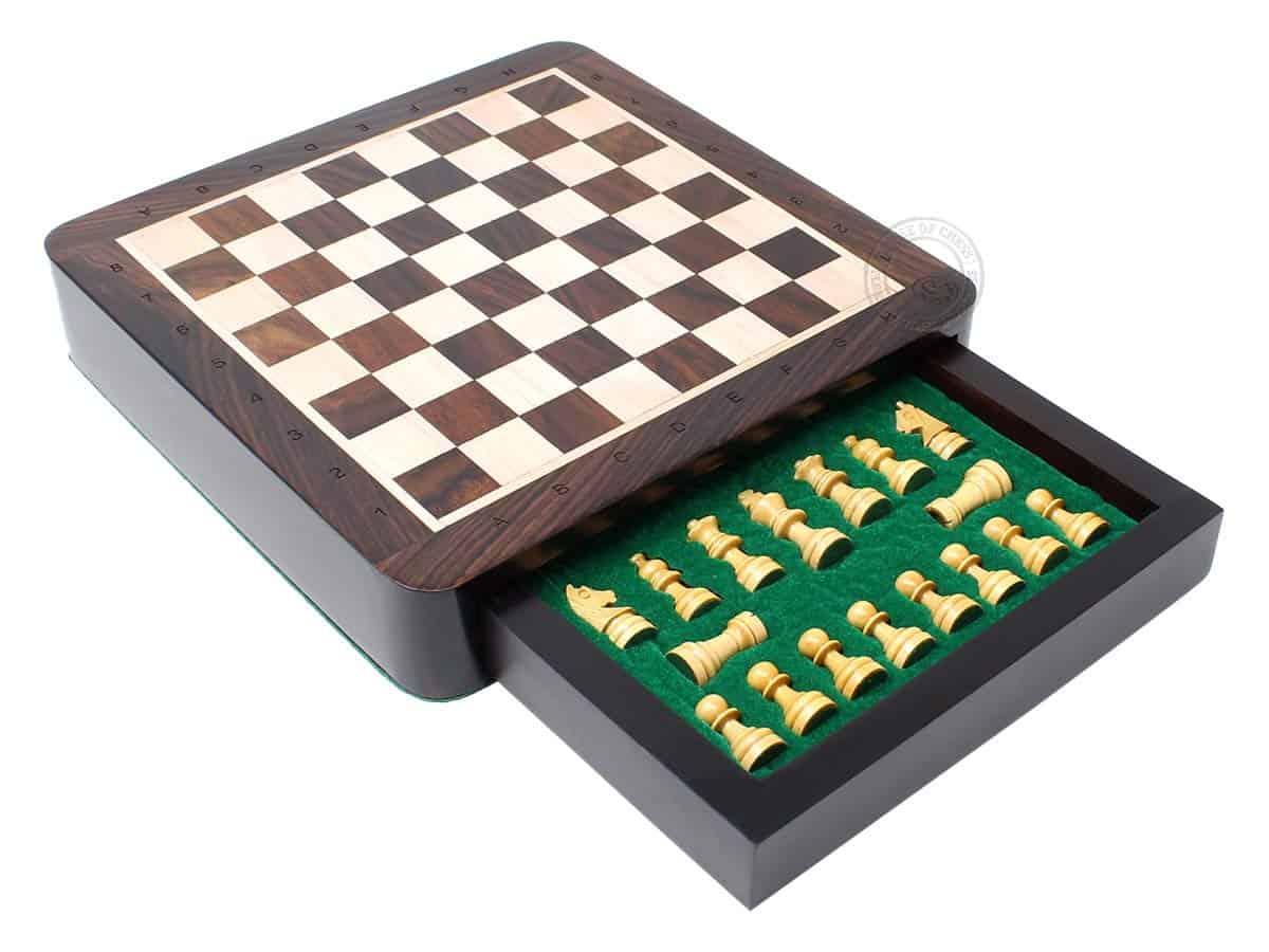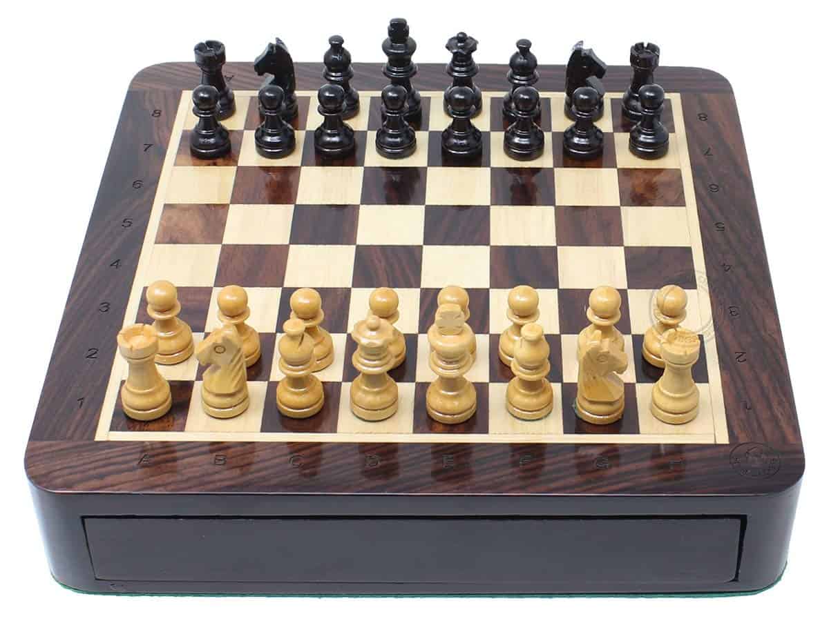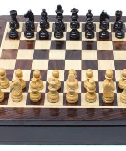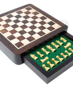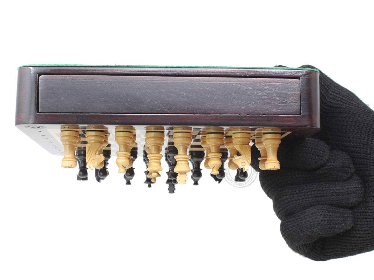 La Casa del Ajedrez presenta un compacto set de ajedrez magnético de viaje en madera de rosa con 2 reinas adicionales, cajones de almacenamiento y notaciones algebraicas. El tablero de ajedrez cuadrado de 7.5″ x 7.5″ (19.5 cm x 19.5 cm) ha sido incrustado a mano en la combinación de madera de rosa y arce, mientras que las piezas de ajedrez de diseño Francés Staunton con un tamaño de rey de 1.34″ (34 mm) han sido talladas a mano en auténtica madera de rosa y boj. También se incluyen dos reinas adicionales con el juego de ajedrez.