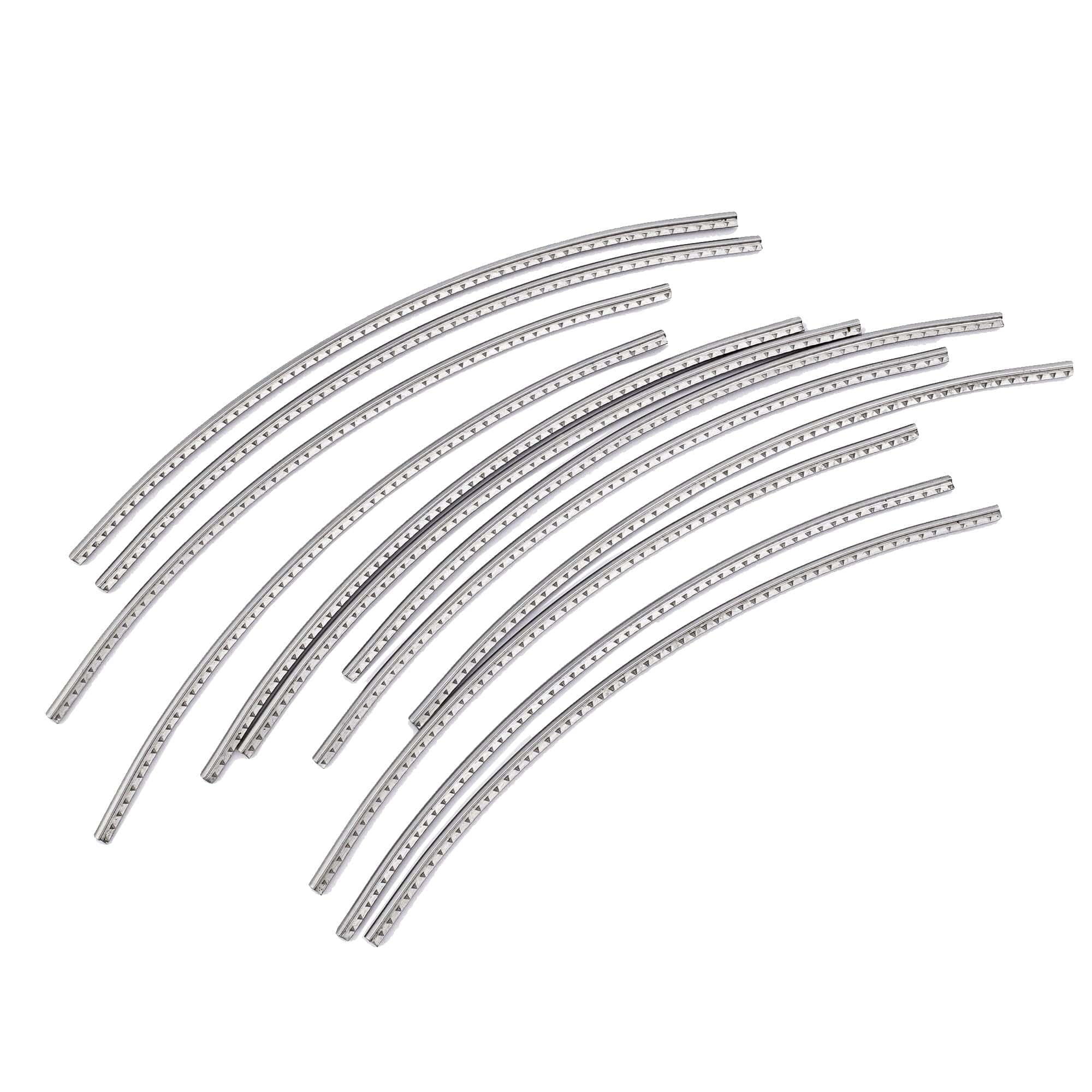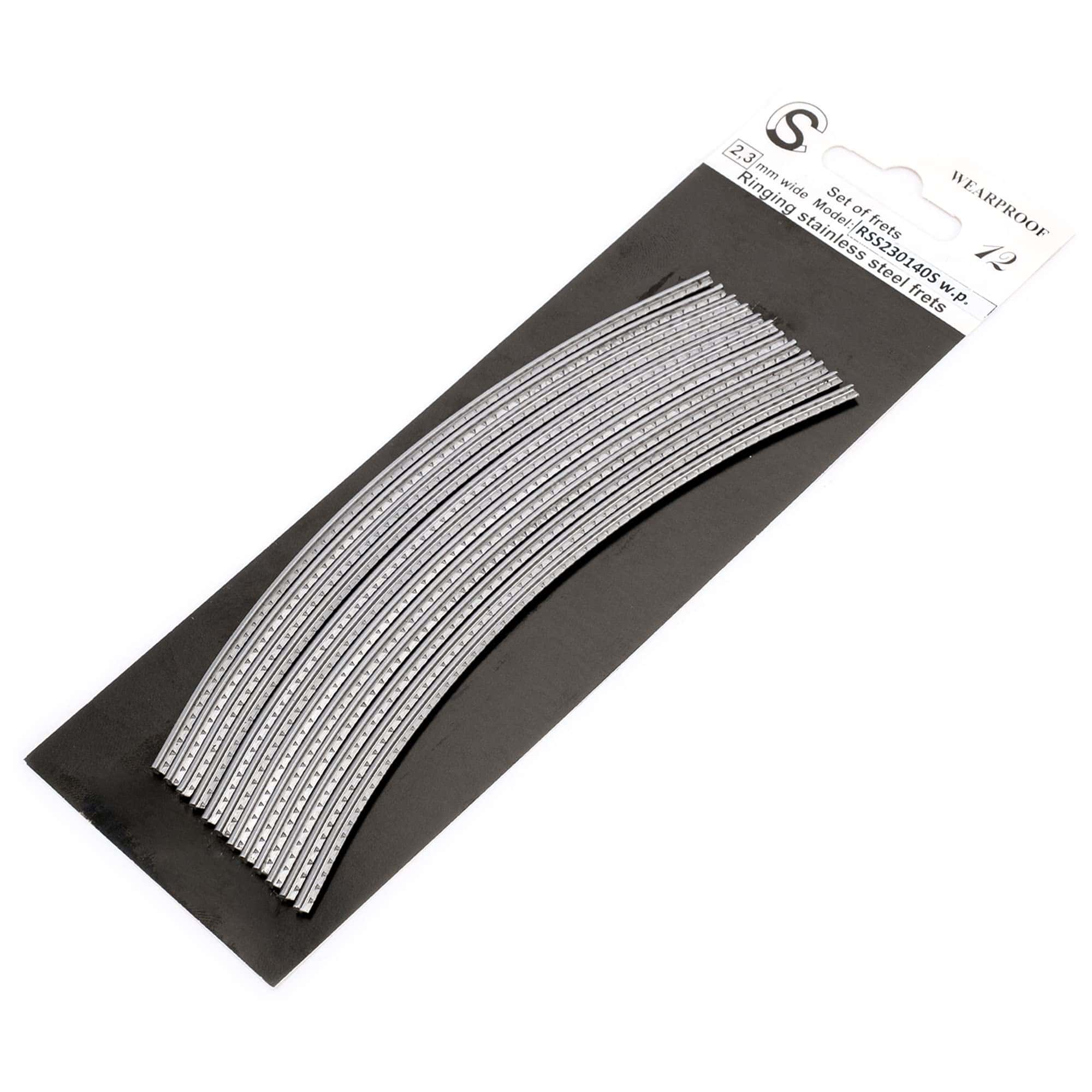 Set de alambres para trastes medianos de acero inoxidable Sintoms RSS230140 para guitarra eléctrica. Fabricados en Bielorrusia, estos trastes son comúnmente utilizados en guitarras eléctricas. Están hechos de acero inoxidable ringing mejorado, con una dureza de 400HV, lo que les otorga una mayor durabilidad y sustain, así como una mejora en la calidad del sonido, proporcionando a los instrumentos musicales un sonido más suave y natural. El ancho de la corona es de 2,30mm (0,091 pulgadas), la altura de la corona es de 1,40mm (0,055 pulgadas), la altura del traste es de 2,79mm (0,110 pulgadas) y el ancho del tang es de 0,50mm (0,020 pulgadas). Vienen empaquetados ligeramente curvados. Cada traste mide 13cm (5,118 pulgadas) de largo, con un total de 12 piezas por set, lo que equivale a 156cm (5,1 pies) de longitud, suficiente para cualquier guitarra estándar. El paquete incluye: 1 set de alambres para trastes (12 piezas).