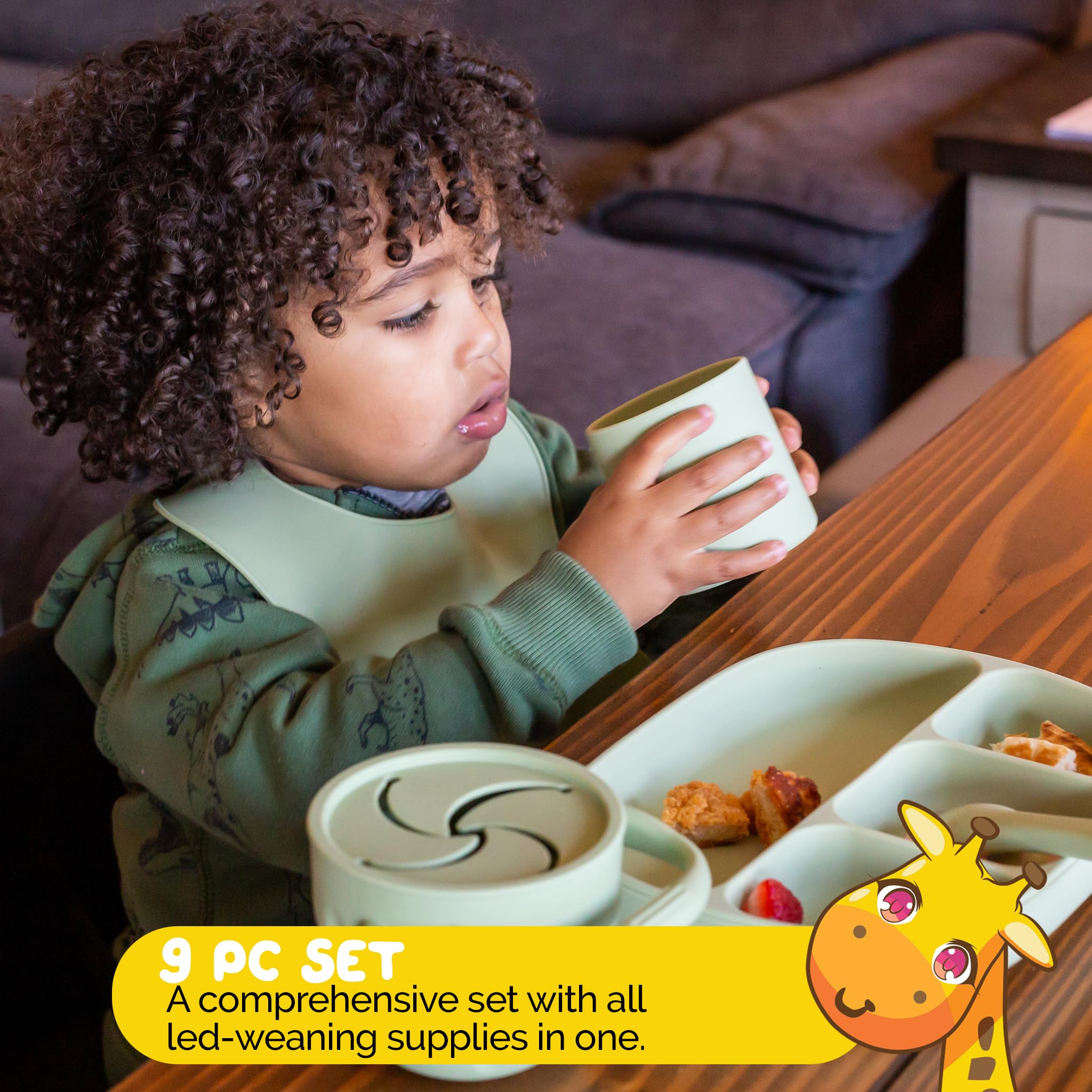 3. Alimentación sin Desorden: Nuestro set incluye una Taza de Aperitivos Plegable y un Plato Redondo con Ventosa y borde elevado, asegurando que los derrames se reduzcan al mínimo.