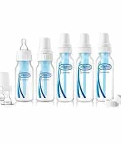 Las botellas estándar de Dr. Browns Natural Flow ofrecen una maravillosa experiencia de alimentación con tecnología de ventilación innovadora. Las botellas de Dr. Browns utilizan un sistema de ventilación interno patentado de 2 piezas para la comodidad de su bebé. Este sistema crea un flujo de presión positiva para una alimentación libre de vacío que es similar a la lactancia materna. La leche materna o la fórmula fluyen libremente sin colapso del pezón. A medida que el bebé se alimenta, el aire se canaliza desde el cuello del pezón a través del sistema de ventilación hacia la parte posterior de la botella. El aire nunca se mezcla con la leche materna o la fórmula, por lo que se evita la oxidación, manteniendo así vitaminas esenciales como C, A y E. El sistema de ventilación elimina las burbujas de aire en la fórmula o leche, lo que ayuda a reducir problemas de alimentación como cólicos, regurgitación, eructos y gases. Las botellas de Dr. Browns son completamente libres de BPA, PVC, plomo y ftalatos para la seguridad de su bebé. El Set de Alimentación para Recién Nacido viene con 3 botellas estándar de 8 oz / 240ml, 2 botellas estándar de 4 oz / 120ml, 2 tetinas de silicona nivel dos adicionales, 2 tapas para almacenamiento/viaje y 3 cepillos de limpieza son cepillos pequeños para pezones y están DENTRO de las botellas.