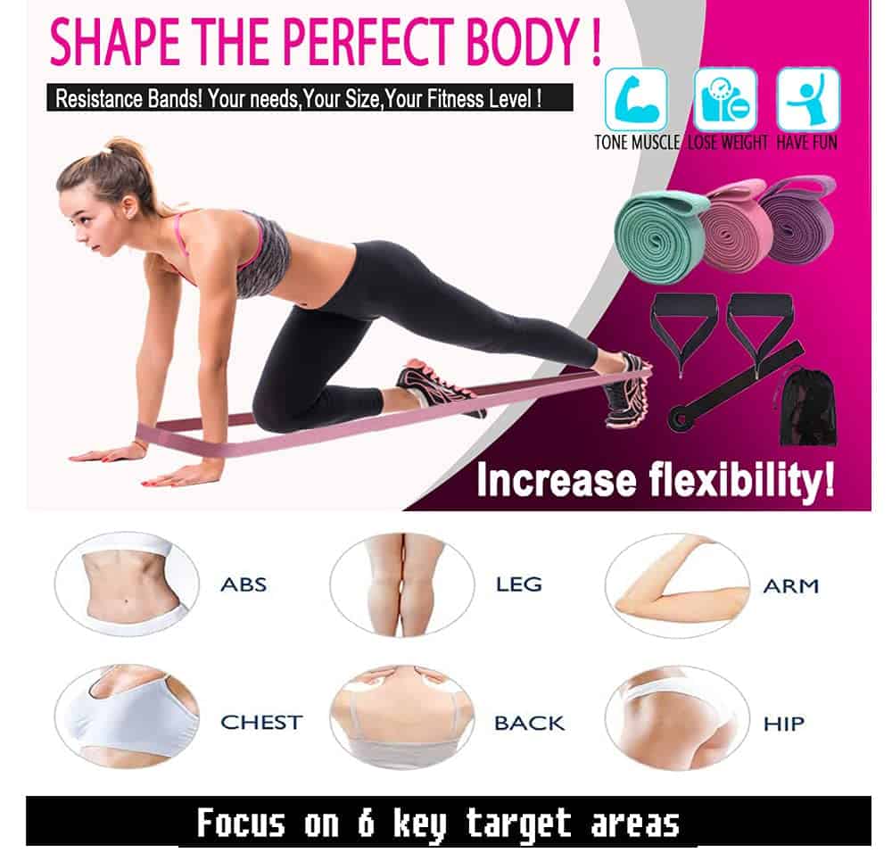 3. Bandas de Ejercicio MultifuncionalesEl set de bandas elásticas para ejercicio puede ayudarte a realizar diferentes ejercicios, quemar grasa y mejorar la flexibilidad corporal. Estas bandas de resistencia para hombres y mujeres pueden apuntar al cuerpo entero o a grupos musculares específicos para ejercitar los músculos, incluyendo construcción de fuerza, tonificación muscular, terapia física, Pilates, estiramientos, y más.