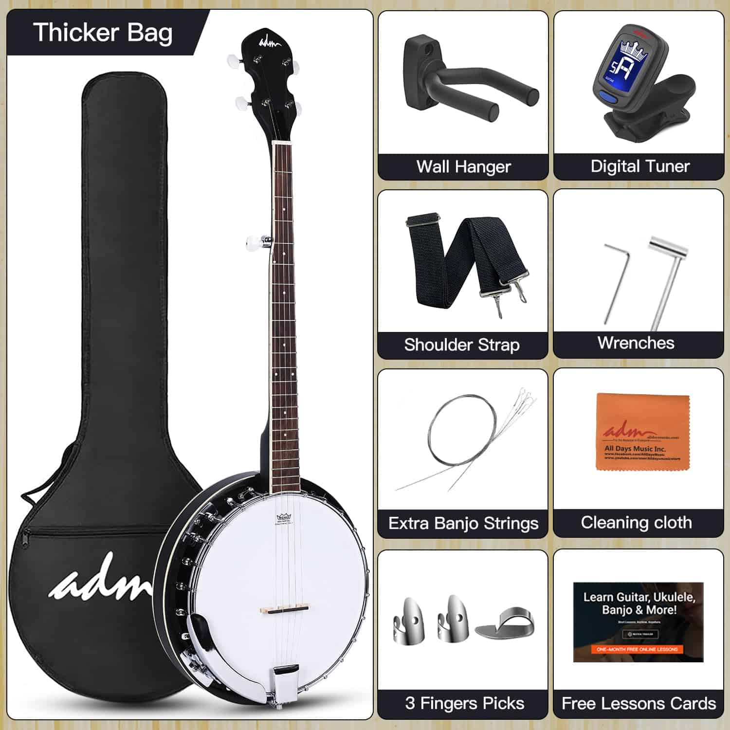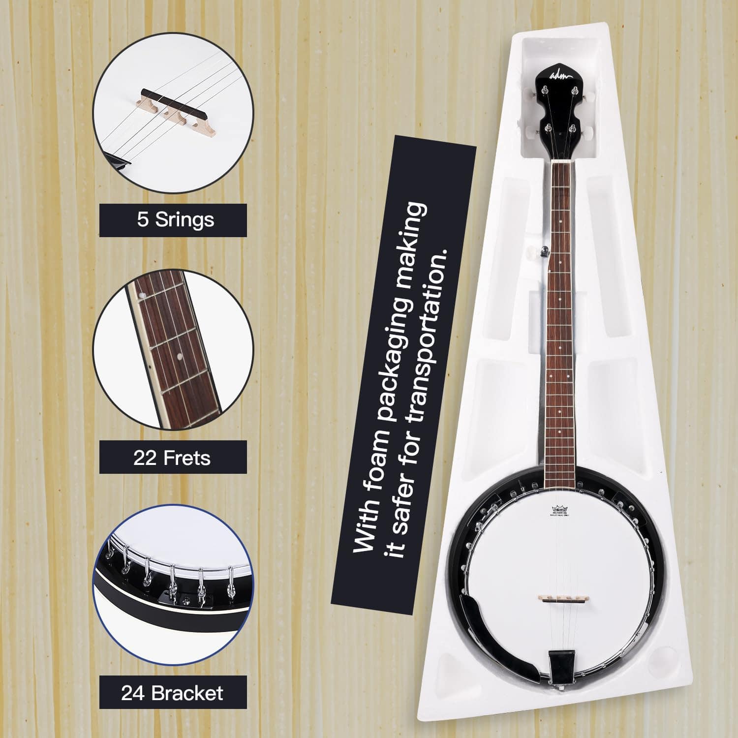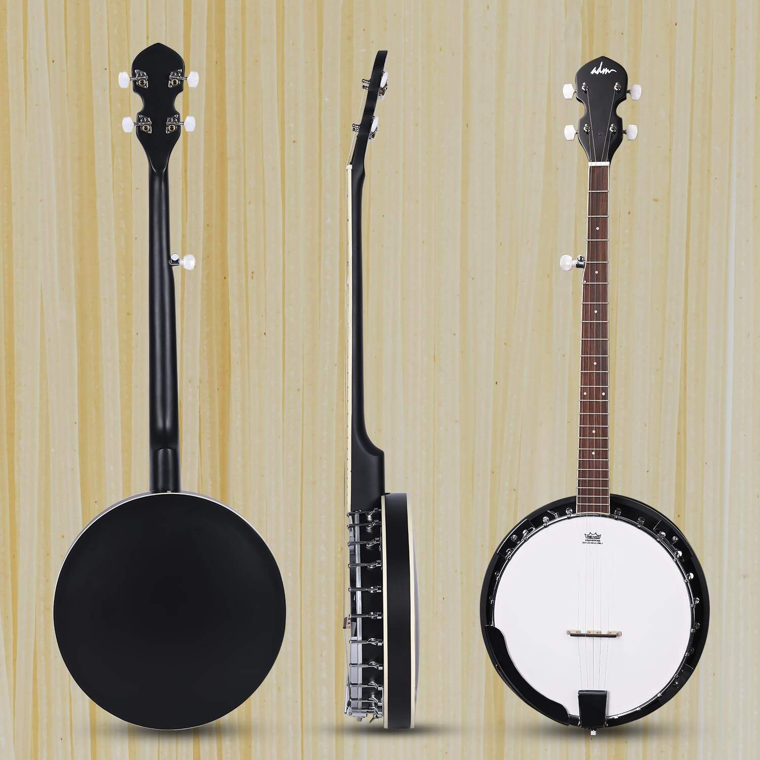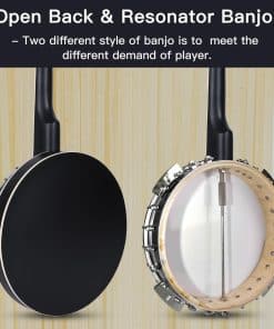 Conoce sobre el Banjo de 5 Cuerdas ADM La parte superior del banjo tiene forma de guitarra, y la parte inferior tiene forma de pandereta. Tiene cuatro o cinco cuerdas y se puede tocar con los dedos o una púa. Según la leyenda, el banjo tiene origen en África Occidental. En la era de la trata de esclavos en el siglo XVII, los esclavos lo introdujeron en América. Más tarde, el banjo pasó gradualmente de las plantaciones del sur a los estados del norte de los Estados Unidos y se hizo popular. Cabezal de Tambor Remo 24 Aros Diseño Clásico del Cuerpo Componentes de Calidad Sonido Dulce al Tocar Sensación Cómoda Un buen instrumento de iniciación, vale la pena probar si te interesa. Un gran regalo para los amantes de la música. Perfecto para estudiantes principiantes y viene con un bolso, 3 púas, correa, afinador digital E (batería no incluida), colgador y cuerdas extra, etc.