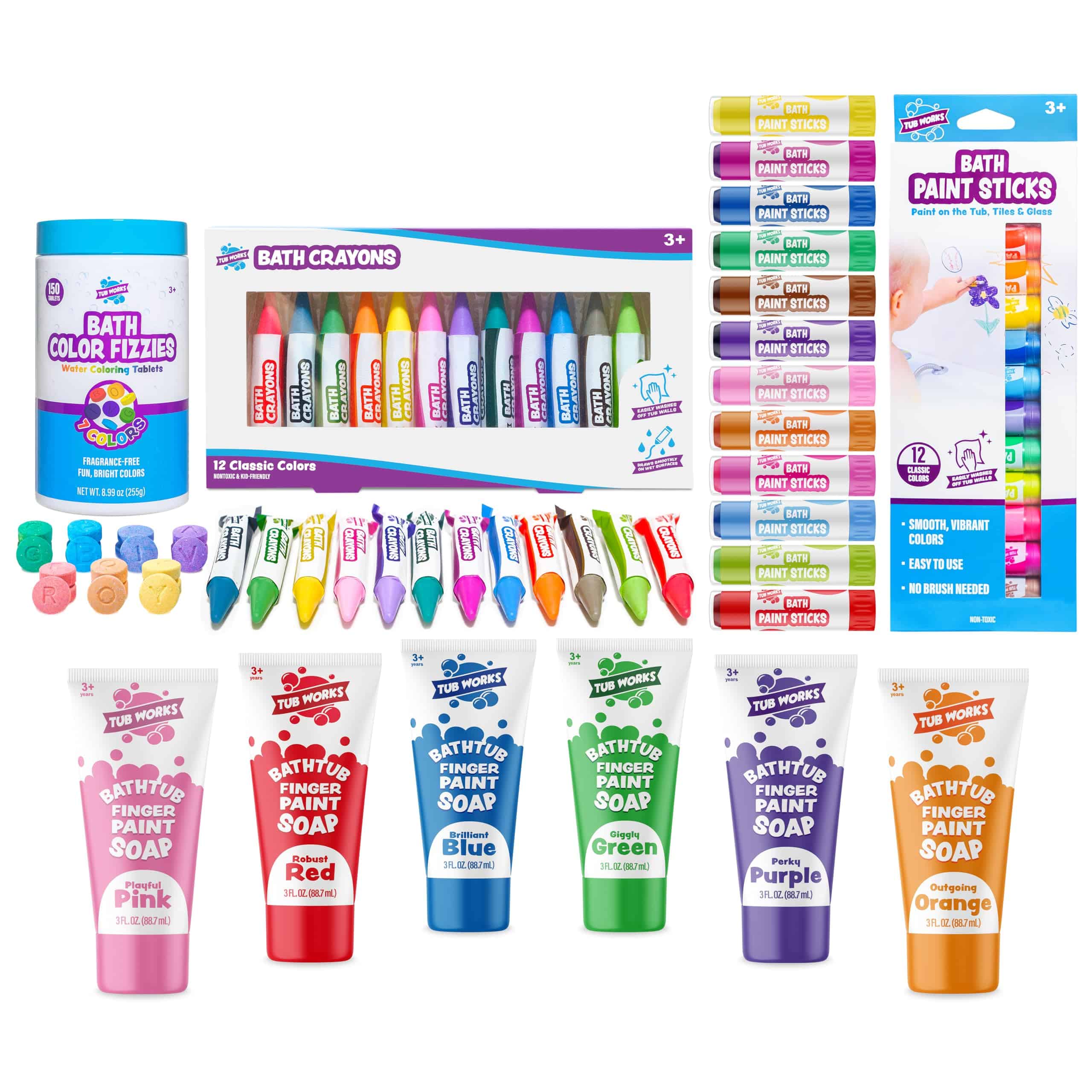 1. ¡Diversión en la bañera: Transforma el baño de tus hijos con colores! Con 4 populares juguetes de baño: Jabón de Pintura para el Baño, Palitos de Pintura para el Baño, Crayones de Baño Smooth y Tabletas de Colores para el Baño Fizzy, los niños pueden disfrutar de colores en el baño.