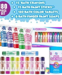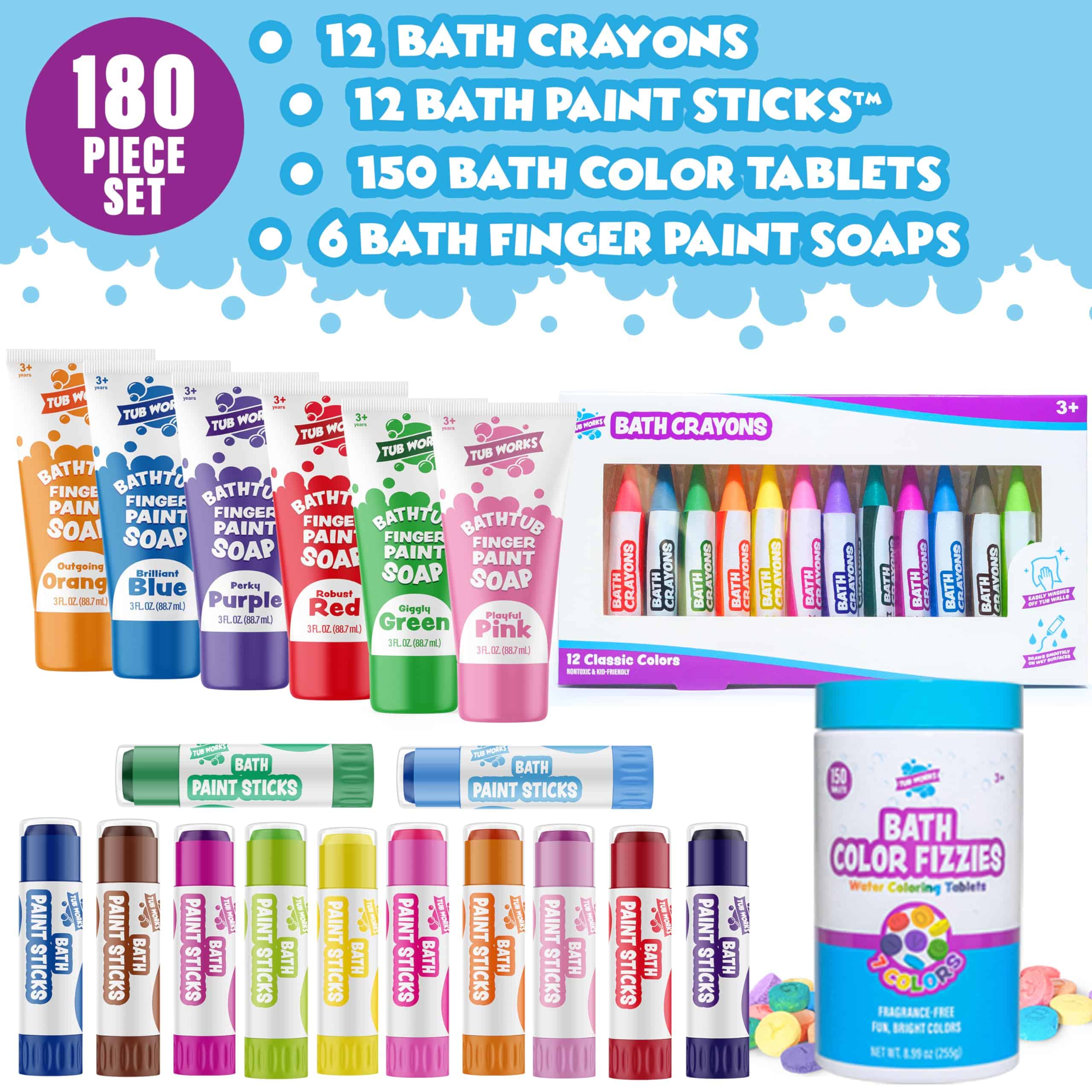 10. SET DE 180 PIEZAS: El set de baño para niños incluye: 150 Tabletas de Colores para el Baño, (6) tubos de tres onzas de Jabón de Pintura Fingertip para la Bañera, 12 Palitos de Pintura para el Baño y 12 Crayones de Baño Smooth en colores clásicos.