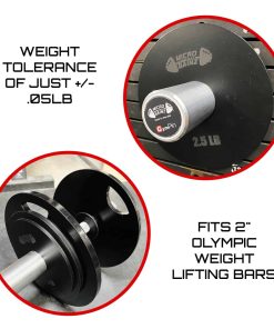 Micro Gainz ofrece este set de 2 placas de barra olímpica de peso de acero diseñado para el entrenamiento de fuerza y la carga de pesas en la barra. El set incluye 2 placas olímpicas de 2.5 lb cada una, ofreciendo la posibilidad de cambiar las placas fácilmente durante el ejercicio.