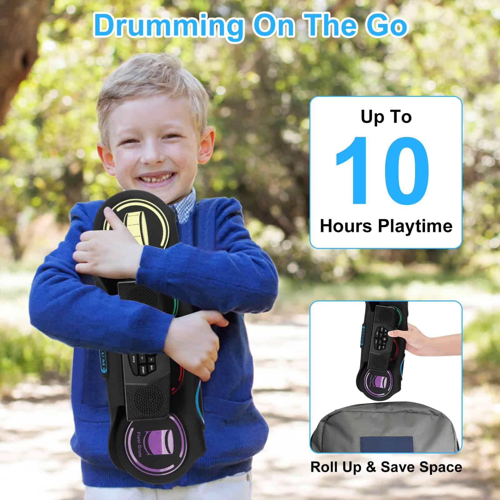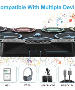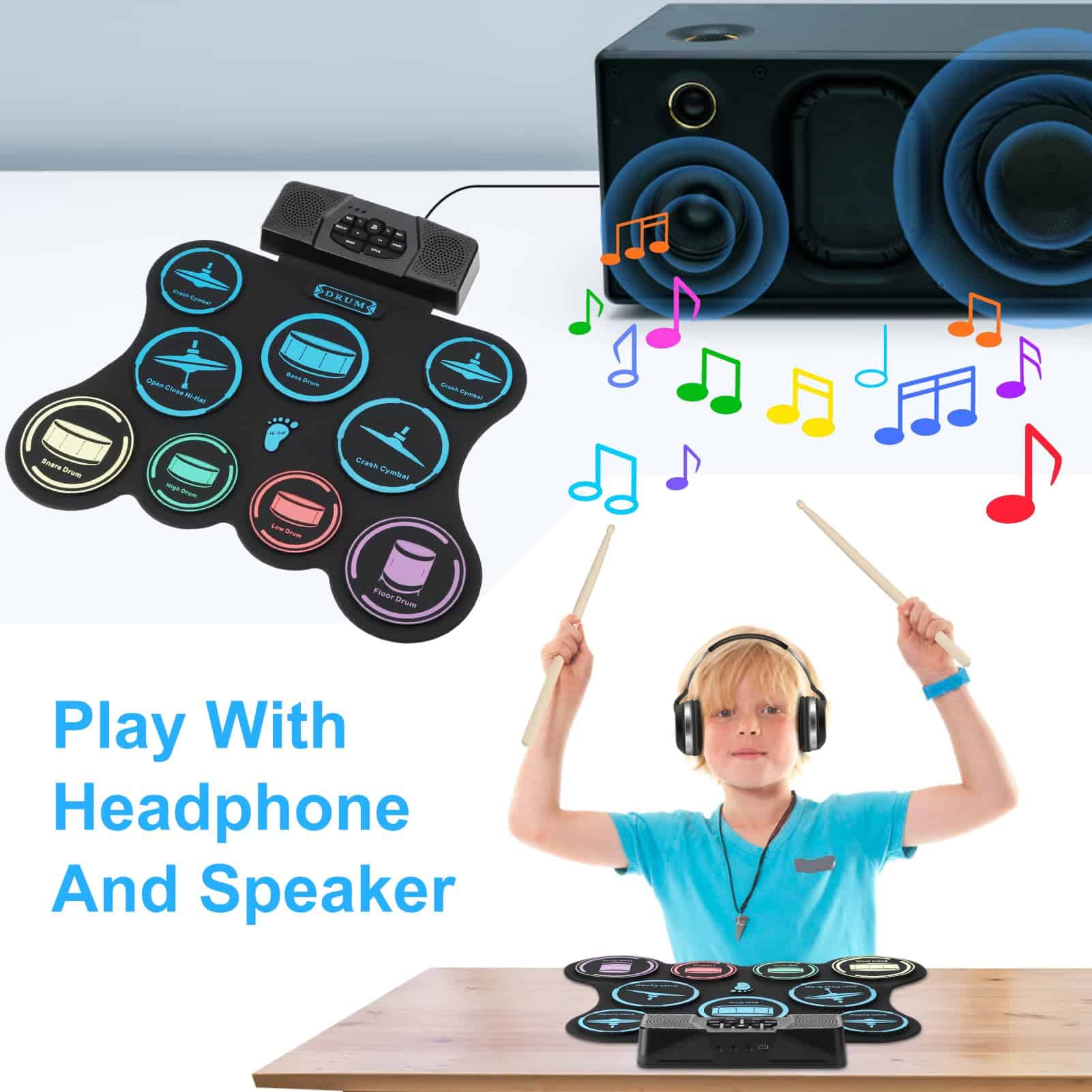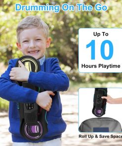 1. Conjunto de batería electrónica mejorado de 9 almohadillas para niños: el set de batería electrónica Marrilley contiene todas las baterías que necesitas para empezar: 3 tambores, 2 platillos de crash, 1 Hi-hat, 1 platillo de Ride, 1 SNARE, 1 bombo. 2 pedales de pie tocan el sonido del bombo; es el set de batería perfecto para niños de 5 a 12 años que quieren practicar y grabar la batería. 2. Altavoces estéreo duales: el sonido de la almohadilla de batería de práctica se emite desde el sistema de altavoces duales de alta calidad con efecto de súper bajo. El volumen del set de batería para adultos se puede ajustar a 10 niveles diferentes, y los pedales de pie pueden brindarte una experiencia de batería más realista. 3. Grabar y conexión para auriculares: soporta salida de auriculares de 3,5 mm, lo que te permite tocar en cualquier lugar donde te sientas inspirado para tocar la batería sin barreras o molestias. 7 tonos de batería, 10 canciones demo y 9 ritmos de batería opcionales para diferentes estilos de música. El botón de grabación te permite grabar tus ritmos, la función de grabación de hasta 180 segundos te permite saborear tu creación. 4. Tocar la batería en cualquier lugar: nuestro set de batería para niños tiene una batería recargable integrada de 1200 mAh, que dura hasta 10 horas de juego por carga. Es fácil de almacenar, no ocupa mucho espacio para que puedas enrollarlo, guardarlo en tu bolsa para llevarlo a cualquier lugar para fiestas al aire libre, prácticas de coro, estudio, lecciones de música/batería. 5. El mejor regalo para tus hijos: la almohadilla de batería eléctrica de 10 almohadillas satisface los intereses musicales de los niños de 3 años o más, convirtiéndose en el regalo perfecto de Navidad o festivo para ellos. Está hecho con materiales respetuosos con el medio ambiente, por lo que puedes garantizar la seguridad. La garantía de un año hace que tu compra sea sin preocupaciones.