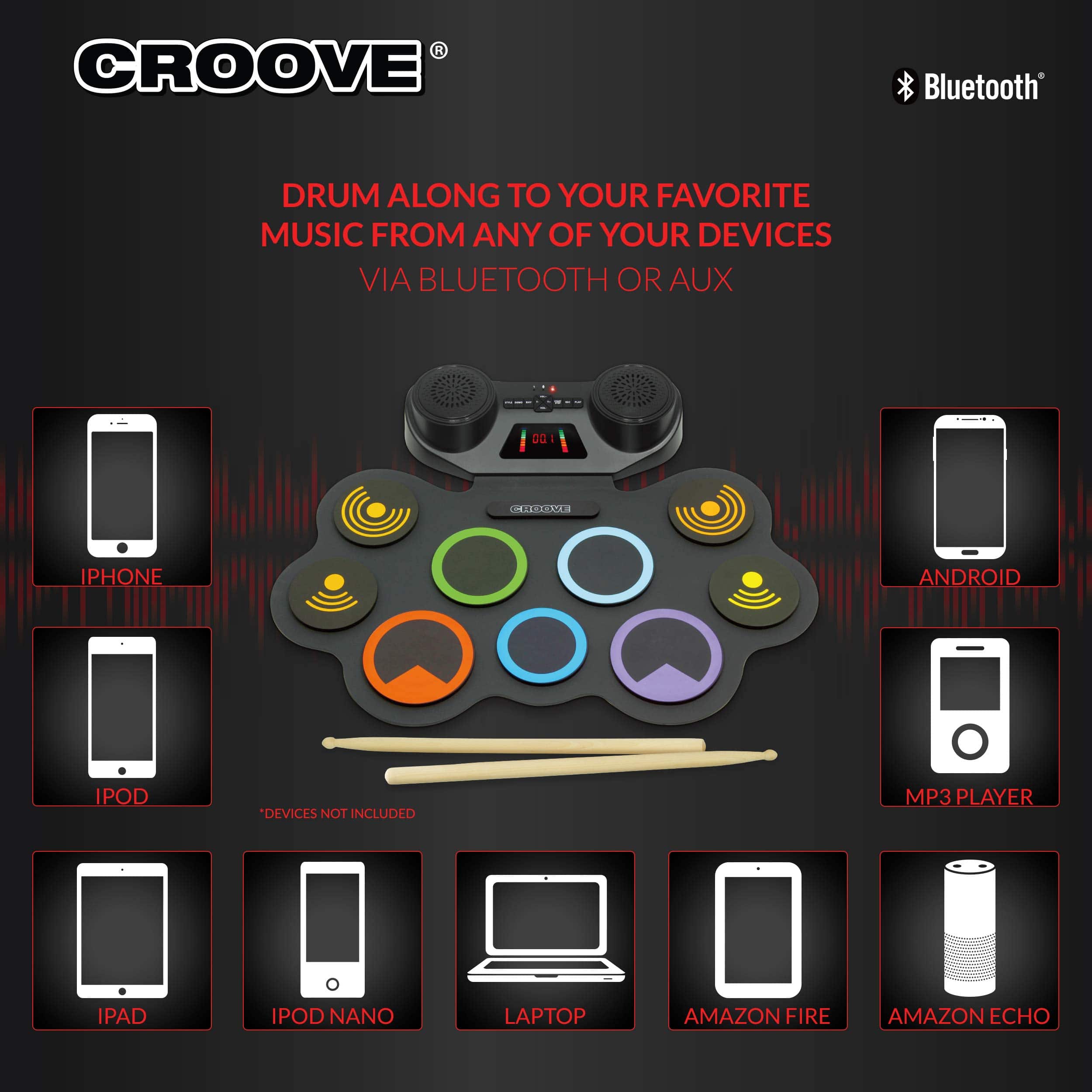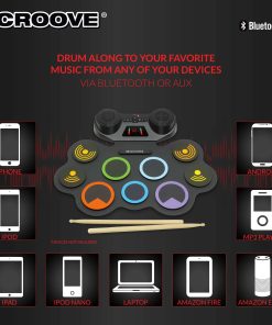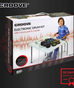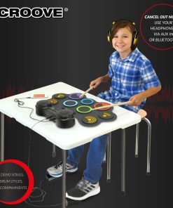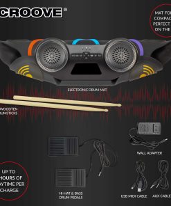 Niveles de todos los gustos disfrutarán al máximo este set de batería eléctrica que cuenta con una amplia gama de ritmos con 9 pads de batería, incluidos pads de caja, tom, bombo y platillos. Acompaña uno de los 10 demostraciones integradas con los palos de batería de madera y agrega sonidos frescos con 7 estilos de batería diferentes y 7 acompañamientos. La pantalla digital y los altavoces estéreo hacen que sea fácil operar esta batería electrónica para niños. Ajusta la música a velocidad deseada con precisión utilizando los 16 controles de velocidad. Este set de batería eléctrica para niños incluye un jack de audífonos. Además, con conectividad Bluetooth, puertos aux in & out, adaptador de pared y un puerto USB MIDI, los niños pueden conectar este pad de batería electrónica. Con su batería recargable, este kit de batería para niños funciona durante 3 horas con una sola carga. Set de Batería Electrónica para Niños y Adolescentes de Croove.