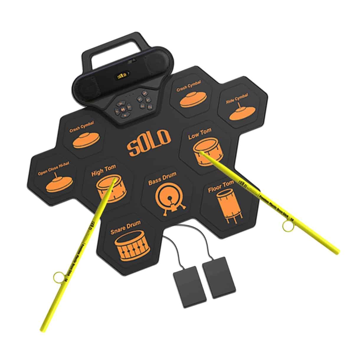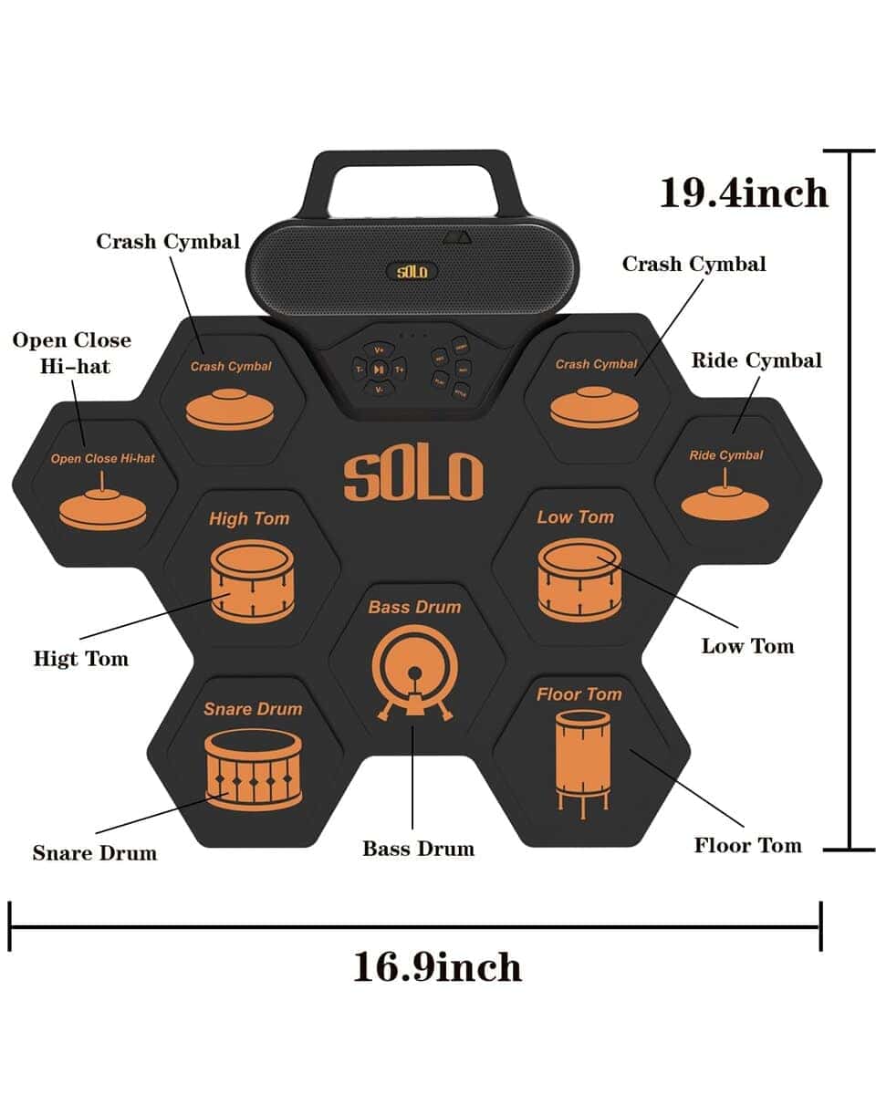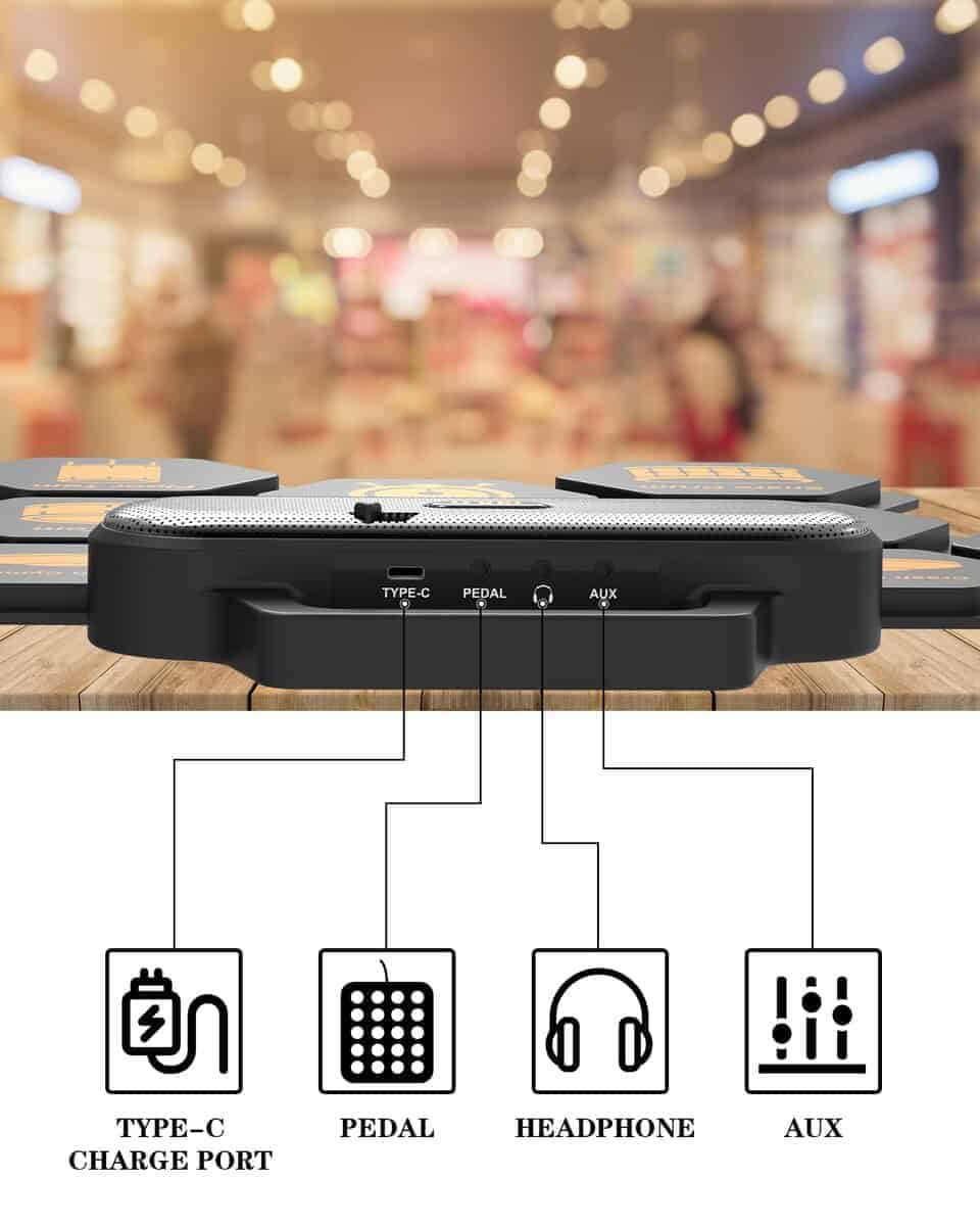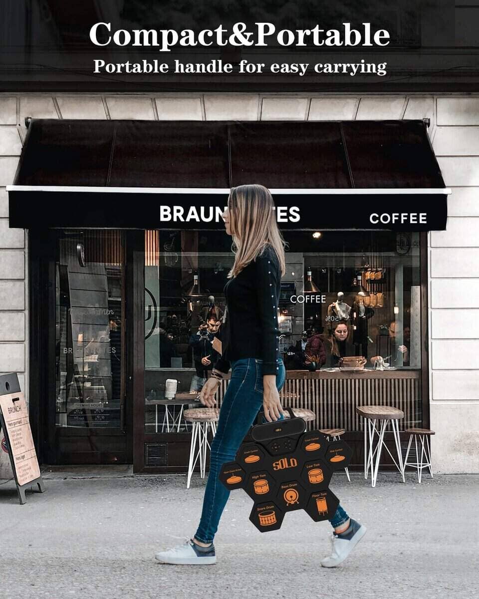 El set de batería electrónica AUPHY cuenta con 9 pads de batería sensibles al tacto, incluyendo crash 2 platillos, Hi-hat abierto-cerrado, Tom alto, caja, bombo, tom de suelo, tom bajo y platillo ride. También incluye 6 canciones DEMO, 7 timbres, 10 ritmos y 2 pedales de batería. El diseño es más profesional y se asemeja de cerca a una batería real, convirtiéndolo en una herramienta de aprendizaje ideal para que los principiantes desarrollen buenos hábitos de interpretación. Nuestro set de batería electrónica está equipado con altavoces estéreo duales y un conector para auriculares. Puedes disfrutar de la música o practicar en silencio utilizando auriculares, sin preocuparte por molestar a los demás. Ajusta el volumen del altavoz para disfrutar de la música con amigos y familiares. La batería electrónica de rollo tiene una función de grabación, lo que te permite grabar tus ritmos y escuchar tu interpretación. Esta función te ayuda a evaluar tu progreso y mejorar continuamente tus habilidades de interpretación. Los sets de batería electrónica AUPHY son ligeros y portátiles, lo que te permite llevarlos a cualquier lugar. Puedes enrollarlo fácilmente y guardarlo en tu mochila, lo que lo hace perfecto para fiestas, viajes y interpretación sobre la marcha. El set de batería eléctrica cuenta con una batería recargable tipo C incorporada, lo que lo hace respetuoso con el medio ambiente. Admite hasta 5 horas de tiempo de reproducción después de una carga completa. Después de muestrear 100 mil baterías, AUPHY utiliza fuentes de sonido puro para recrear sonidos de batería estándar, que se asemejan a las baterías profesionales. Los materiales ecológicos de los pads hacen que el aprendizaje sea cómodo y sencillo, convirtiéndolo en un regalo genial para vacaciones o cumpleaños, adecuado tanto para niños como para adultos.