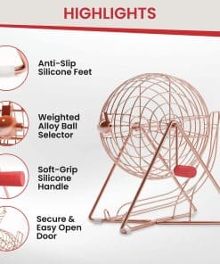 ACERCA DE NOSOTROS: MR CHIPS es un fabricante líder de bolas de bingo de uso profesional, juegos de césped al aire libre, etc. Con una amplia variedad de juegos disponibles para jugar de manera profesional, ¡seguramente encontrarás el set perfecto para tu juego! Mr. Chips, Inc ofrece el único juego de calidad en el mercado que presenta una tecnología increíble. ESPECIFICACIONES: Nuestras pequeñas bolas de bingo profesionales de vinilo de colores impresionarán en todo momento. Este set de jaula de bingo es perfecto para eventos pequeños o reuniones familiares y se almacena fácilmente en espacios más reducidos. El diseño resistente hace que este set de bolas de bingo a granel sea perfecto para toda una vida de diversión. Este gran set de bolas de bingo presenta nuestra nueva jaula de bingo rodante de 7/8″ pulgadas de fácil lectura con 5 colores cada uno. No te dejes engañar por otros vendedores que afirman tener la misma calidad. ¡Asegúrate de comprar a Mr. Chips, Inc. para recibir estas bolas de bingo de alta calidad y nunca antes vistas! DETALLES DEL PRODUCTO:
