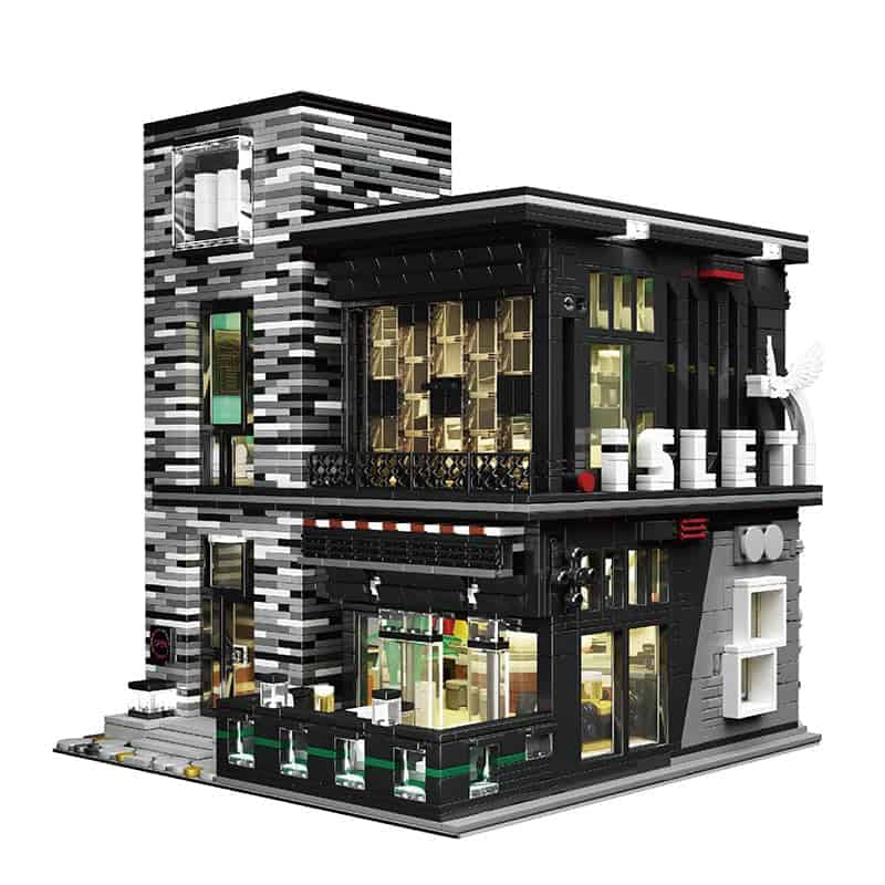 Set de bloques de construcción de Pub y Restaurante con iluminación LED Este conjunto de bloques de construcción de pub y edificio está inspirado en un edificio moderno. Desde la luz exterior, puedes capturar la atmósfera de bares y restaurantes. El set de Pub y Restaurante viene con componentes de iluminación LED que se pueden encender de noche para iluminar todo el edificio. El diseño interior del edificio es bastante rico, incluyendo cocina con varios utensilios de cocina, mostrador de bar, área de cócteles, área de mascotas, terraza y varias plantas. Algunas otras características incluyen un toldo retractil, ventanas giratorias y persianas. Mide más de 29.6 cm de altura, 27.7 cm de largo y 26 cm de ancho. Contiene más de 3,992 piezas de bloques de construcción de calidad. Los bloques de construcción de General Jim son compatibles con Lego, Cobi, Wange, Sembo y todas las marcas principales de bloques de construcción.
