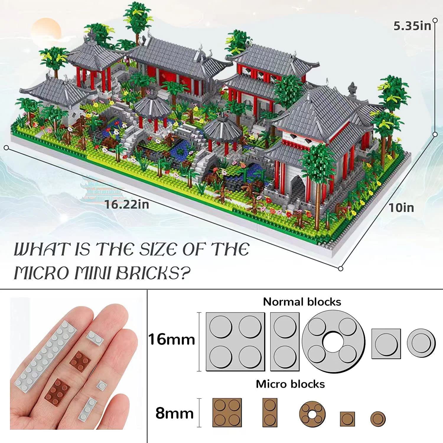 El Jardín Clásico de Suzhou es un icónico edificio en China conocido por su belleza arquitectónica. Con nuestro set de bloques de construcción de micro mini bloques de 3988 piezas, podrás recrear este maravilloso jardín en casa. El set es más desafiante que los bloques de construcción tradicionales, lo que lo convierte en una actividad perfecta para mejorar la paciencia y la destreza de las personas de todas las edades. Fabricado con plástico ABS de alta calidad, el set es seguro y duradero, y cuenta con detalles increíbles a un precio asequible. Con medidas de 5.4 pulgadas de alto, 10 pulgadas de ancho y 16.3 pulgadas de largo, este set es ideal para exhibir en cualquier lugar, desde tu hogar hasta tu oficina. Además, ayuda a mantener a los niños alejados de las pantallas electrónicas y fomenta la creatividad y la concentración. ¡No esperes más y disfruta de este entretenido juego de construcción!