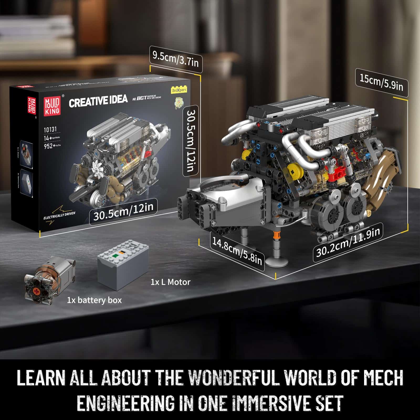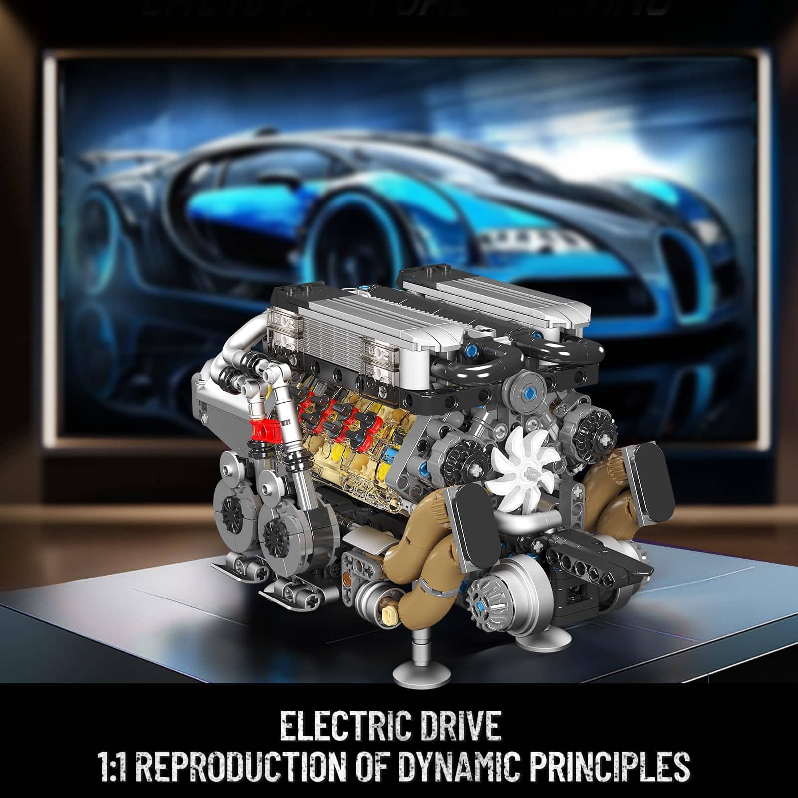 2. MODELO REALISTA QUE FUNCIONA El set de motor W16 de Mould King contiene muchos detalles realistas. Como cabeza de cilindro transparente, simulación del movimiento del pistón, turbocompresor y sistema de escape refinado. Diseñado específicamente para fanáticos de los autos de carrera. ¡El regalo perfecto para amantes de los autos e ingenieros futuros!