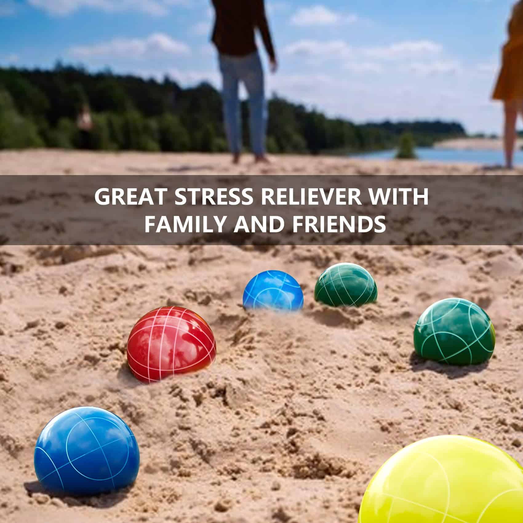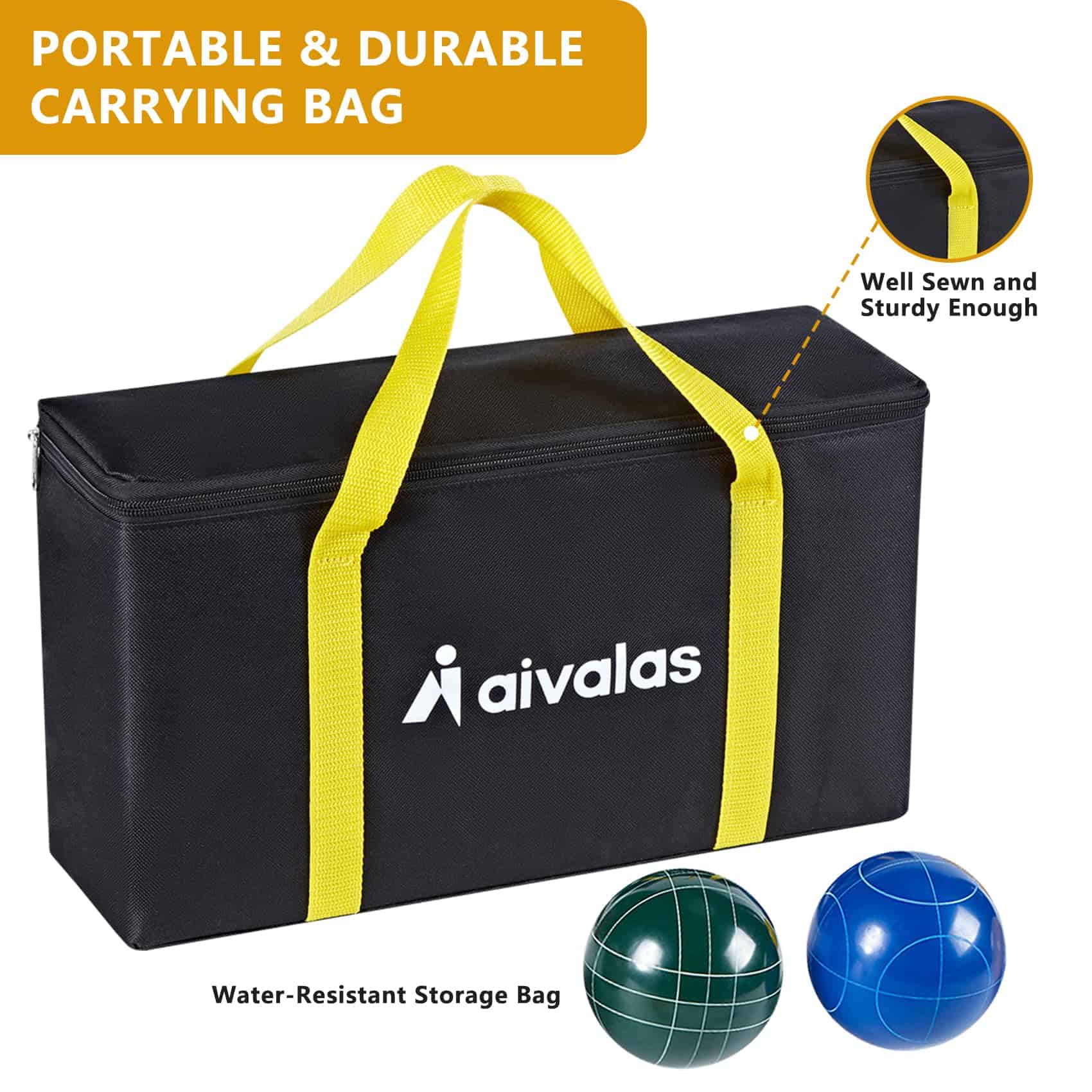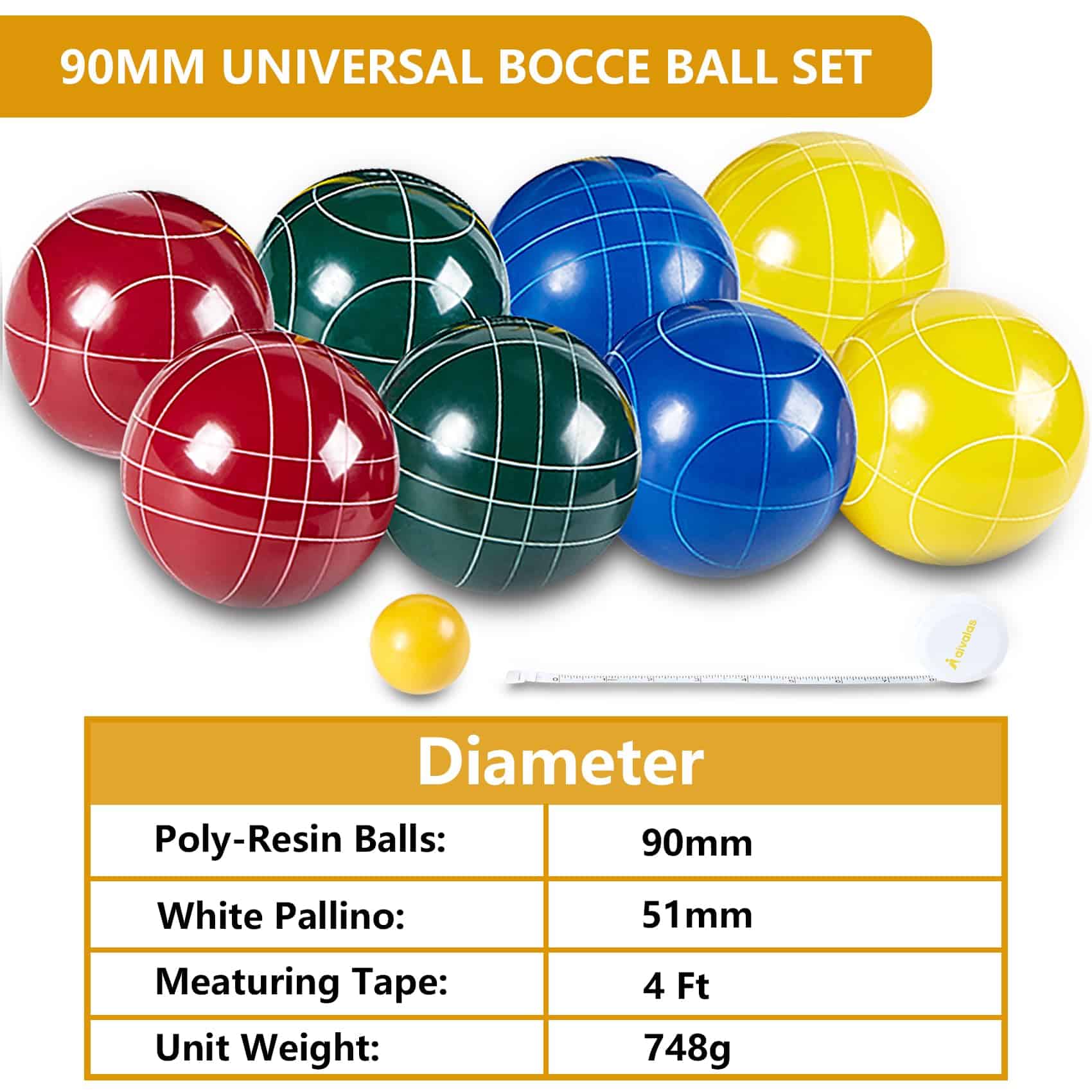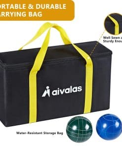 1. El Set de Bolas de Bocce de Aivalas incluye 8 Bolas de 90mm de Poli-resina, 1 Pallino de 51mm Amarillo, 1 Cinta Métrica, 1 Bolsa de Transporte Duradera y 1 Instrucción. Hay cuatro colores (Azul, Verde, Rojo, Amarillo) y dos patrones distintos tallados. El peso de cada bola es de 748g. Permite que 2-8 jugadores se unan a los juegos de patio trasero. 2. Cada Bola de Bocci está hecha de material compuesto de poli-resina de alta calidad para un equilibrio y durabilidad consistentes, y se puede jugar en cualquier clima o superficie diferente. Un juego de patio tan agradable para adultos y niños. 3. Los juegos de Bocce al aire libre son los mejores deportes de ocio que pueden ser jugados por personas de todas las edades y niveles de habilidad. Es interactivo y social, puedes jugar el set de juego con tu familia, amigos. Es un juego al aire libre fantástico para pasar las tardes de vacaciones. 4. La Bolsa de Transporte con asas ofrece un almacenamiento y portabilidad convenientes, hace que el set de bolas de bocce de 90mm reglamentario sea perfecto para juegos de césped, puedes llevar el set de bolas clásicas a la playa, césped, asado, barbacoa en el patio trasero, tailgate, camping, parque, etc. 5. Jugar a los Juegos de Bocce en la Playa puede mejorar tu competencia, juicio y habilidad comprensiva, un gran juego en equipo para personas que aman los deportes. Es muy fácil de jugar, simplemente turnos para lanzar las bolas de bocce más cercanas a la Bola Pallino, brindando horas de diversión para los jugadores. 6. Es fácil de montar y puede ser disfrutado por todo el grupo. Nuestros Sets de Bocce son un regalo perfecto para cumpleaños, Día de Acción de Gracias, Navidad o Día del Padre y Día de la Madre, y más. Ideal para reuniones familiares, picnics, cumpleaños