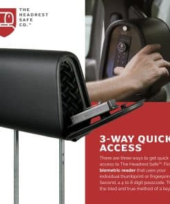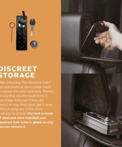 La Caja de Seguridad para Cabecera tiene un diseño universal que le permite adaptarse a todos los vehículos. Hay tres formas de acceder rápidamente a la Caja de Seguridad para Cabecera: primero, un lector biométrico que utiliza su huella dactilar; segundo, un código de 4 a 8 dígitos; tercero, el método confiable de una llave. Tire hacia abajo de la costura invisible para revelar el cerrojo. ¡No hay forma de que alguien pueda saber que está ahí! Y aun si lo supieran, ¡no podrían abrirlo sin usar uno de los tres métodos para desbloquearlo! Solo utilizamos los mejores materiales: cubiertas de grado automotriz, caja de seguridad de acero calibre 18, puerta de acero calibre 16 y un cerrojo de acero. Nuestros productos son fáciles de instalar por uno mismo y una vez instalado, su Caja de Seguridad para Cabecera se bloquea en su lugar para que solo tú puedas quitarlo. Dormirás tranquilo sabiendo que tus pertenencias están seguras.