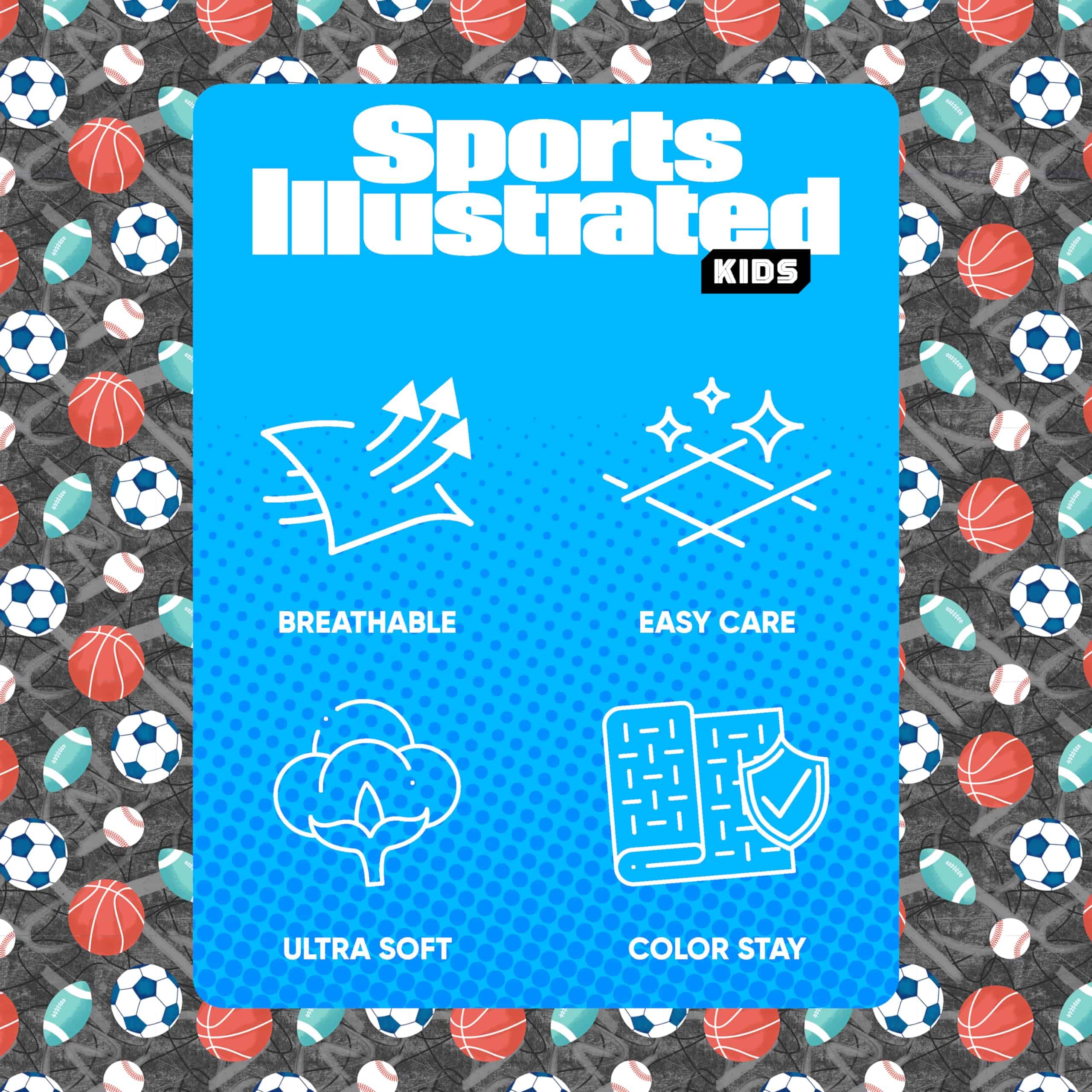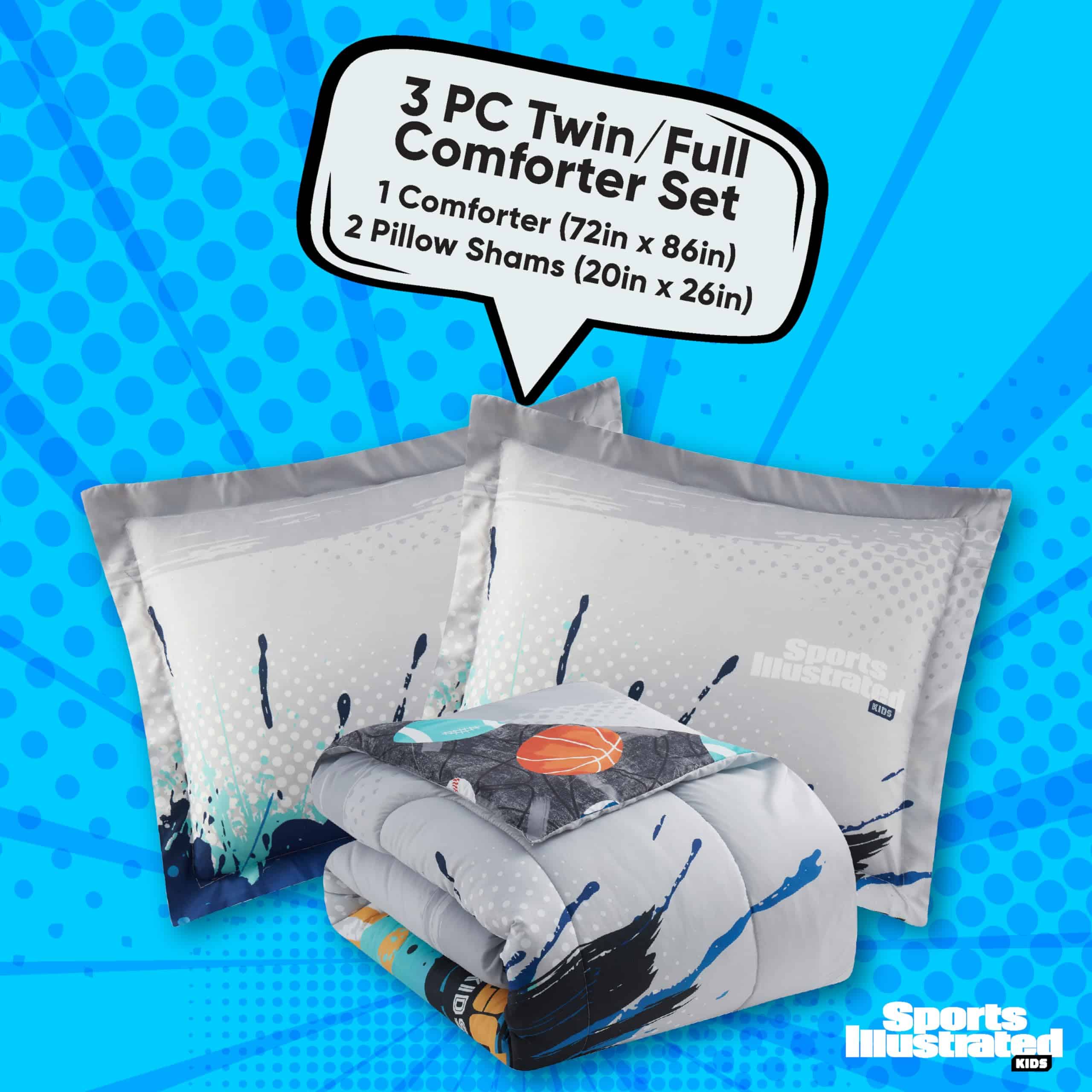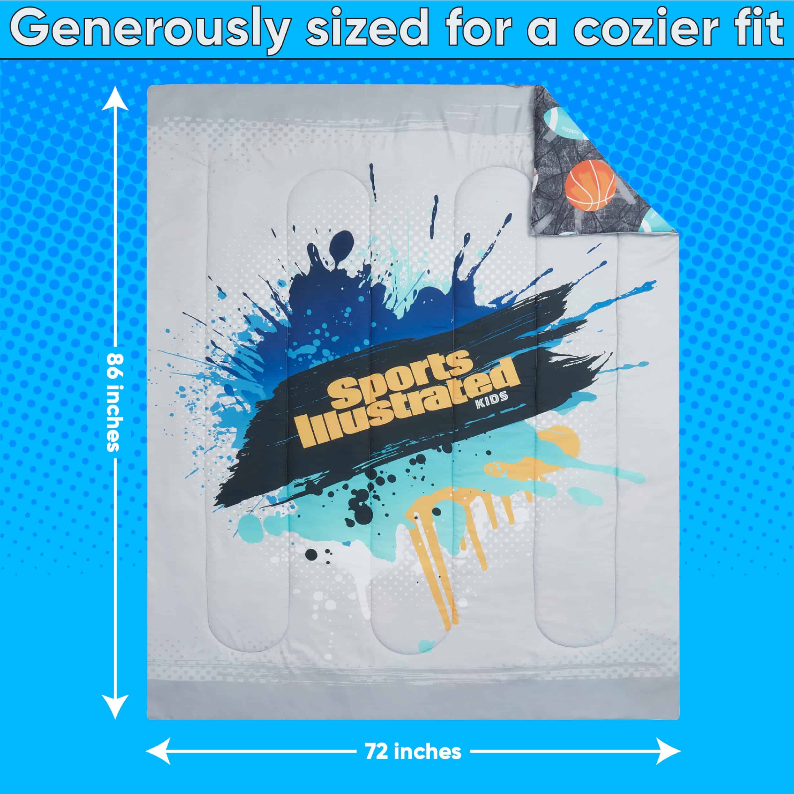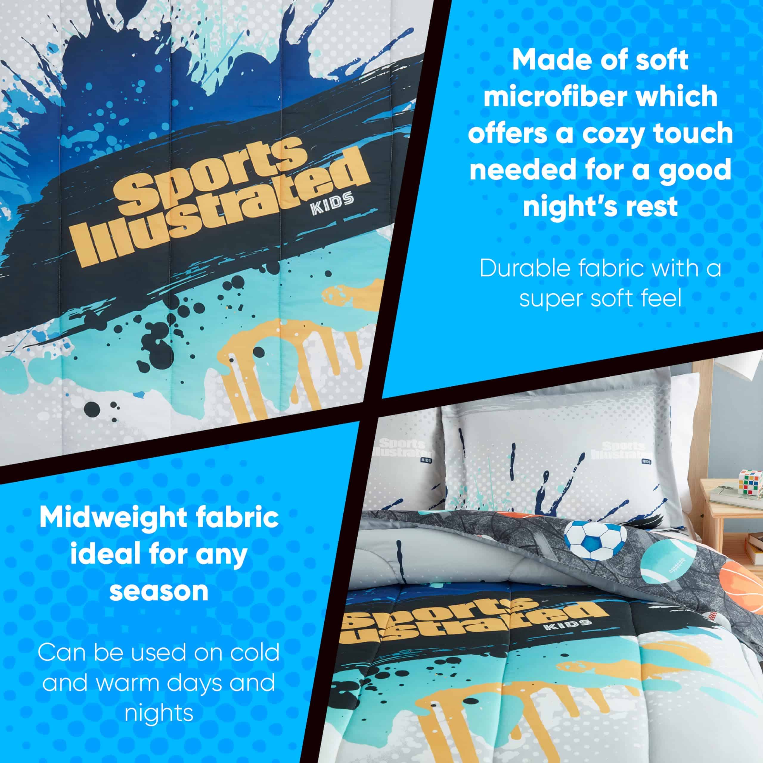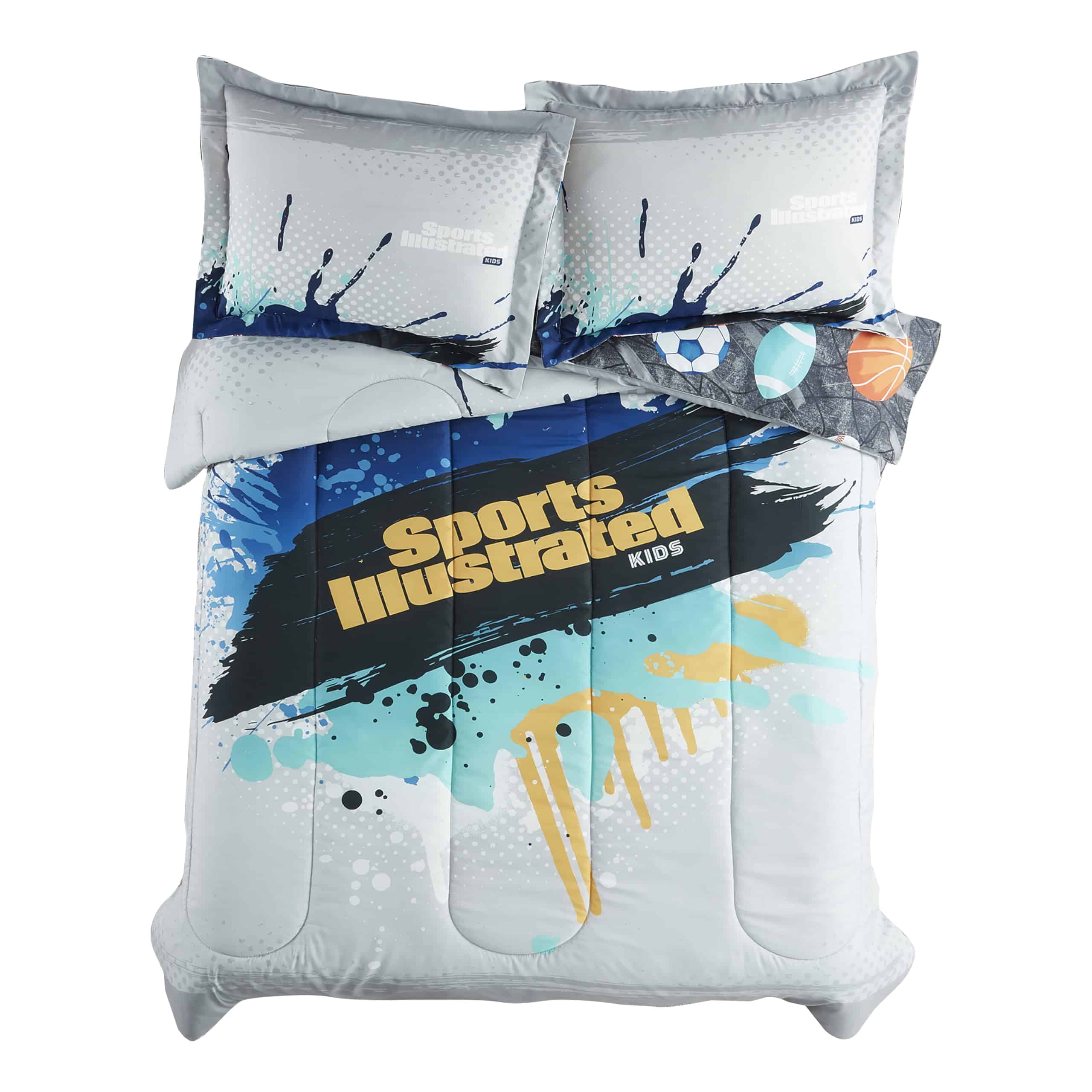 Sports Illustrated Kids, establecido en 1989, es una propiedad de larga data que ha sido reavivada para los niños de hoy, proporcionando un punto de entrada para los niños en el mundo del deporte y los juegos, transmitiendo un mensaje de activarse, divertirse y descubrir tu mejor versión personal. ¡Todos los amantes del deporte! Añade diversión al dormitorio de tus hijos con este set de edredón reversible de 3 piezas. Hecho de microfibra 100%, este set de edredón para niños está diseñado con un estampado de salpicaduras de pintura de la marca Sports Illustrated en un lado y un estampado de deportes múltiples en el lado reverso para que obtengas dos looks súper geniales en uno. El tamaño individual/matrimonial es un set de 3 piezas que incluye dos fundas a juego. El estampado audaz es perfecto para los verdaderos fanáticos del juego. Este set de ropa de cama es súper suave y acogedor para que tus pequeños puedan tener una noche de descanso.