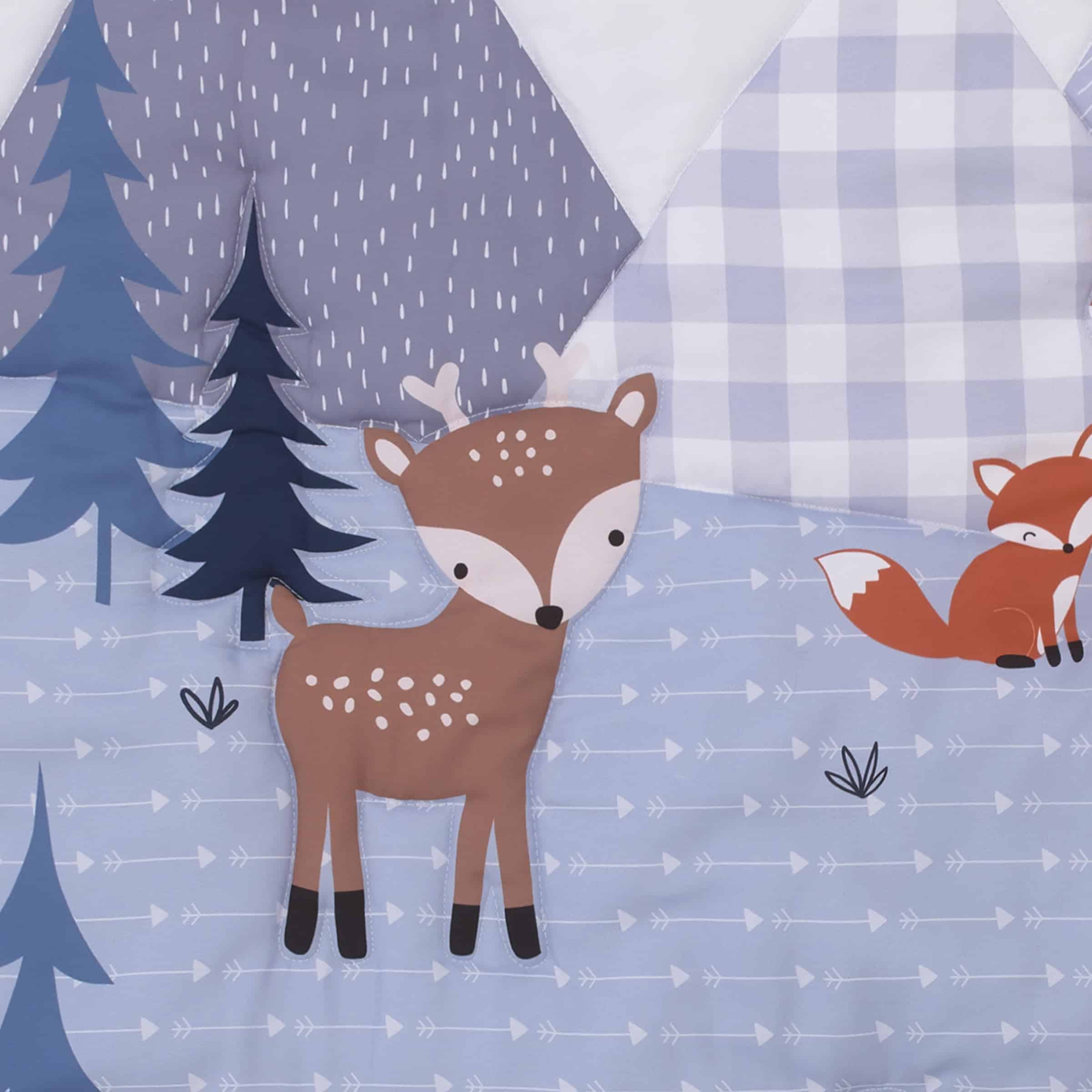 El conjunto de 3 piezas de cama de mini cuna NoJo Little Love National Park incluye un edredón y dos sábanas ajustadas de mini cuna. Este edredón presenta una divertida escena forestal con una familia de osos, ciervos y zorros acampando en el bosque rodeados de montañas y árboles. Diseñado en un patrón de cuadros buffalo en azul marino y blanco con colores de acento en gris, azul claro, marrón y beige, se reversa a un patrón de amigos del bosque en gris y blanco. Mide 30″ x 38″, ¡perfecto para el tiempo boca abajo! Las sábanas ajustadas de mini cuna a juego tienen un patrón de amigos del bosque en gris y blanco. Miden 24″ x 38″ x 5″ y tienen bordes elásticos completos para un ajuste seguro y cómodo. Se ajusta a un colchón estándar de mini cuna. ¡Coordina con la colección de ropa de cama para bebés National Park!