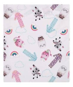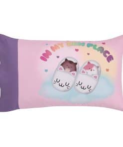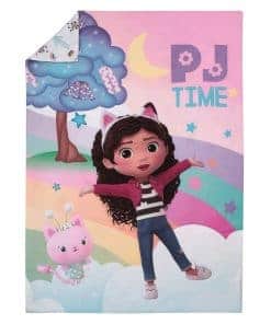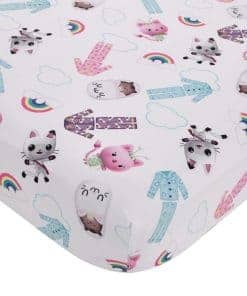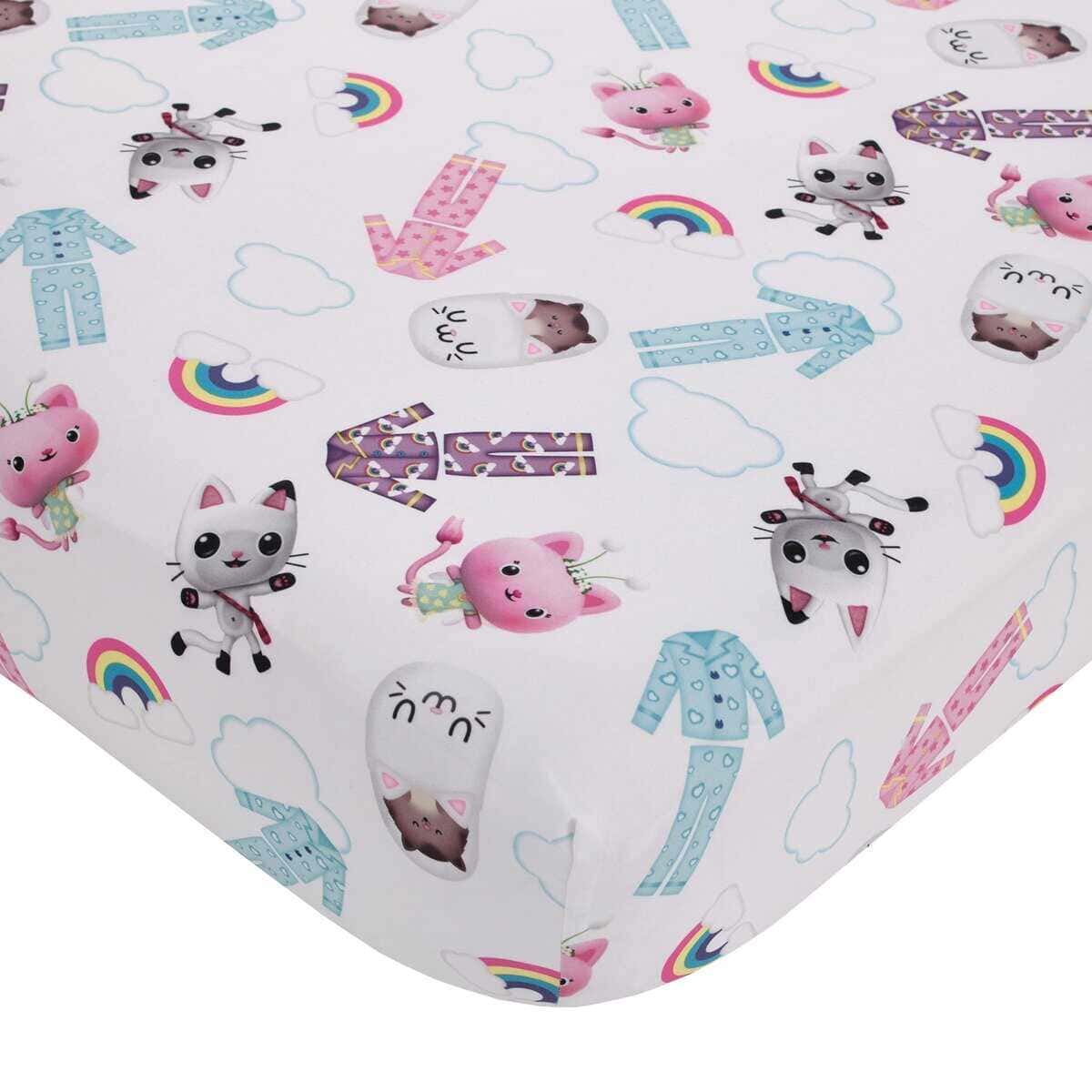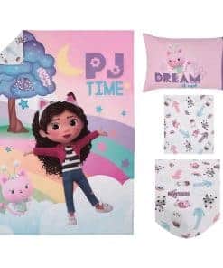 Dream It Up con el Set de Cama para Niños NOJO DreamWorks Gabby’s Dollhouse de 4 Piezas. Incluye un edredón, sábana bajera ajustable, sábana superior plana y funda de almohada reversible. Este edredón soñador mide 42″ x 57″ con coloridos arcoíris, nubes y un árbol de pijamas con Gabby y Kitty Fairy en tonos de rosa, morado, aqua, amarillo y blanco. La sábana ajustable y la sábana plana tienen un divertido patrón de fiesta de pijamas en colores rosa, morado, aqua y blanco. La sábana superior mide 45″ x 60″ y la sábana ajustable mide 28″ x 52″. Esta última incluye bordes elásticos completos para un ajuste seguro y ceñido. Este set se adapta a un colchón de cuna/toddler de tamaño estándar. La funda de almohada reversible dice Dream It Up e In My Zen Place con Kitty Fairy y amigos. Mide 20″ x 30″ y utiliza una almohada de tamaño estándar. ¡Hecho con telas súper suaves! ¡Coordina con la colección de ropa de cama para niños DreamWorks Gabby’s Dollhouse Dream It Up!