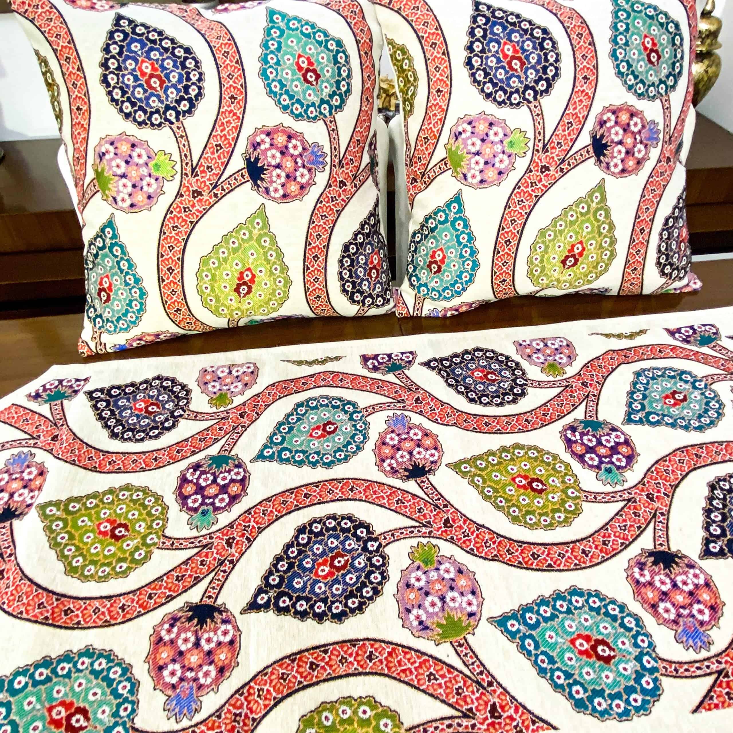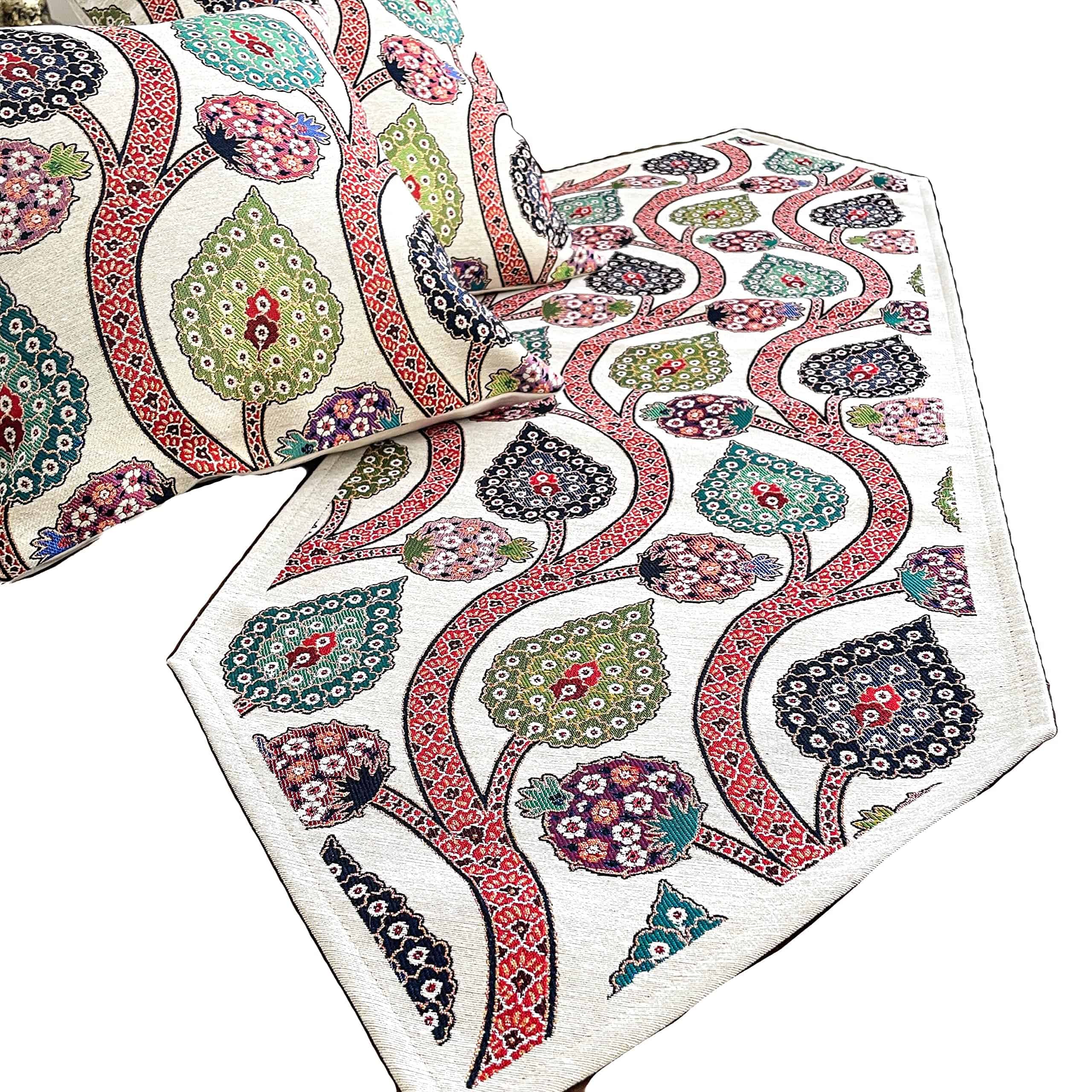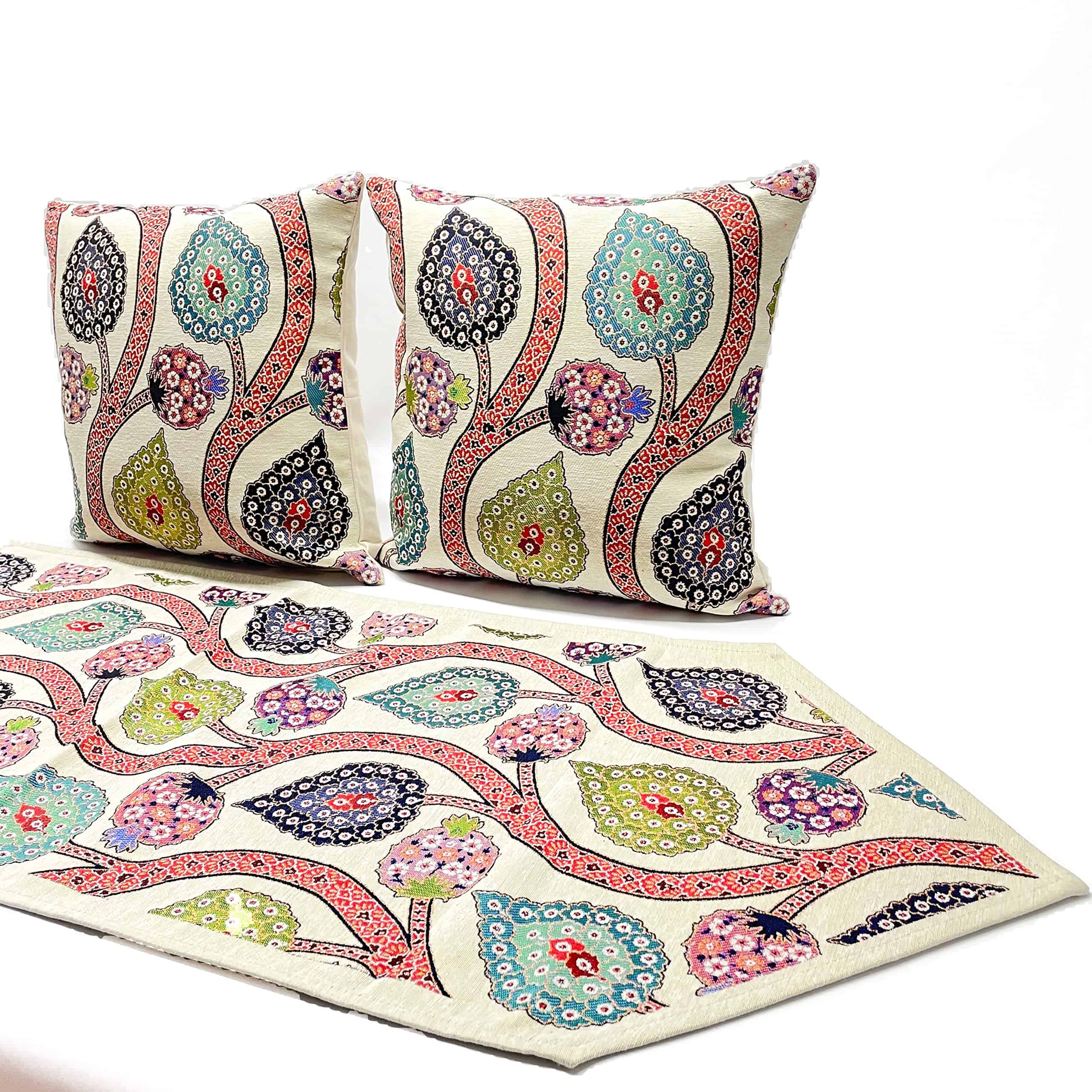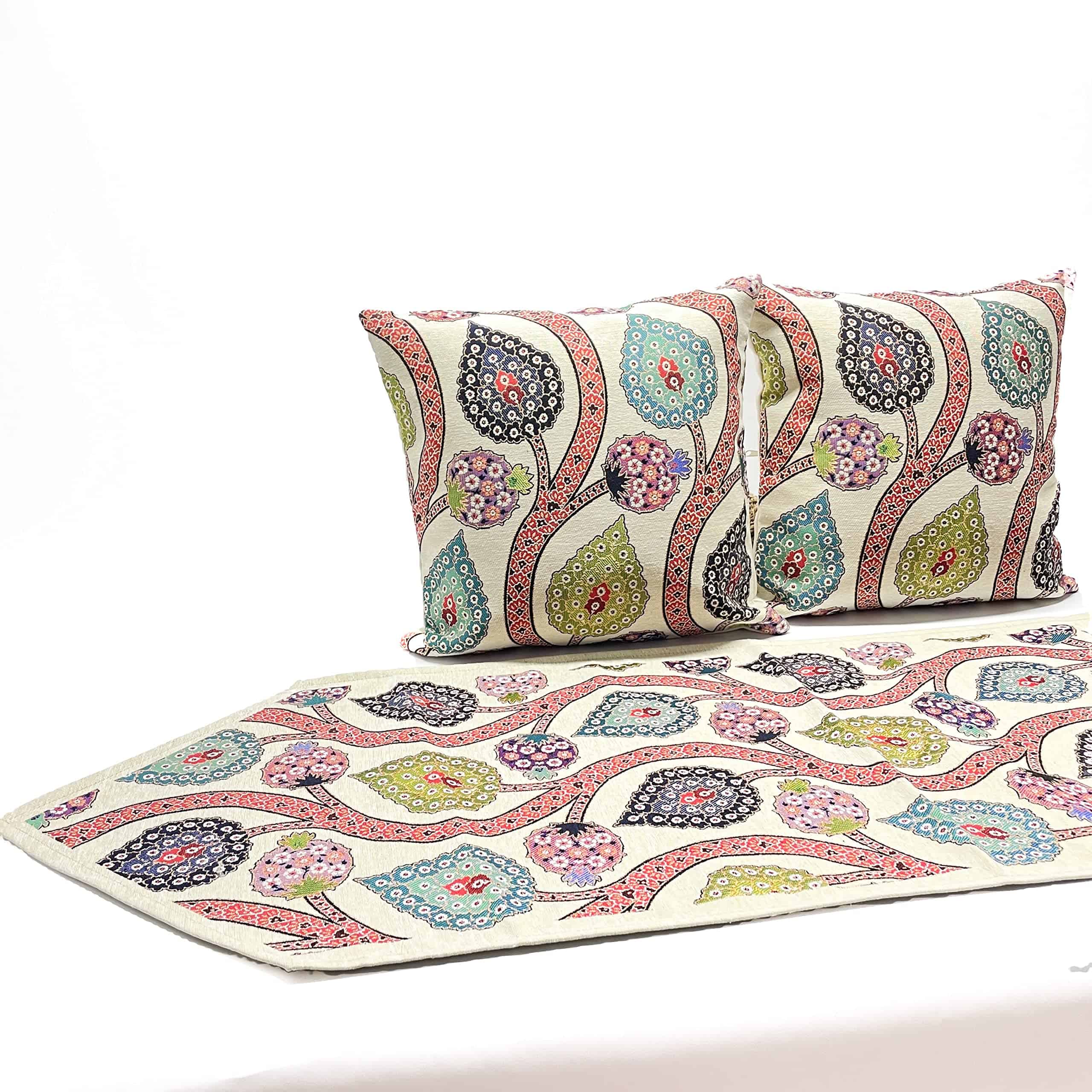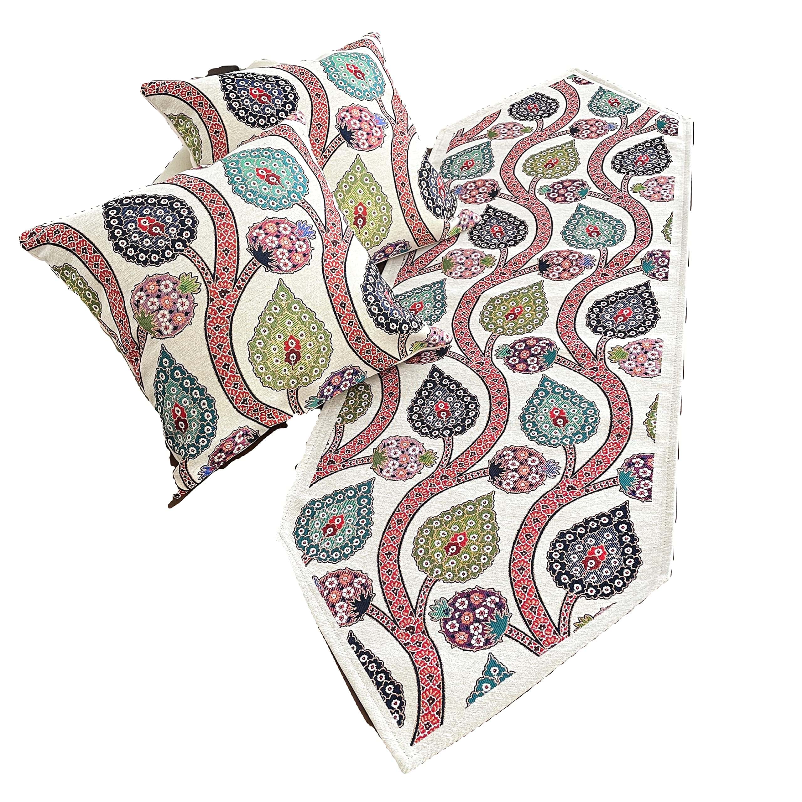 Material: El set de 2 fundas de cojín y 1 camino de mesa de la colección D&D está hecho de tela de tapicería tejida de hilos de algodón. Nuestros productos no están impresos. Nuestros productos se producen en Turquía en máquinas de tejido especiales. Sus patrones están inspirados en motivos históricos del imperio otomano. Si desea hacer una decoración de sala de estar llamativa y única, le recomendamos estos productos. Diseño: (Cremallera Oculta en la Parte Trasera) Como Colección D&D, siempre procuramos ofrecer los productos de mejor calidad y más duraderos para usted. Es obligatorio utilizar un sistema de cremallera muy delgado y débil para ocultar la cremallera en productos con cremalleras laterales. Puede haber casos en los que estas cremalleras fallen muy rápidamente debido a su delicada estructura. En nuestros productos, diseñamos el sistema de cremallera como invisible en la parte trasera y utilizamos cremalleras fuertes. Puede usar estas cremalleras durante muchos años sin ningún problema. Dado que la cremallera está oculta en la parte trasera, nunca es visible desde los lados y desde arriba. Nunca rayará su brazo y cara. El buen punto de costura y la mano de obra exquisita aportan una combinación perfecta de durabilidad y suavidad. Tamaño: Fundas de Cojín: 17″x17″ (43 x 43 cm) Camino de Mesa: 55″x17,7″ (138 x 45 cm) (Todo cortado y cosido a mano. Quizás 1 cm de error máximo) Paquete: 2 Pcs de Fundas de Cojín de Tela Tejida de Algodón, 1 pc de Camino de Mesa de Tela Tejida de Algodón- (Total 3 piezas) Instrucciones de Cuidado: Lavar a máquina en frío en un ciclo suave con colores similares y secar en secadora a baja temperatura. Se recomienda lavar a mano para un uso más prolongado. Planchar a baja temperatura girándolo del revés