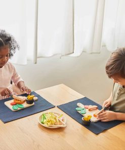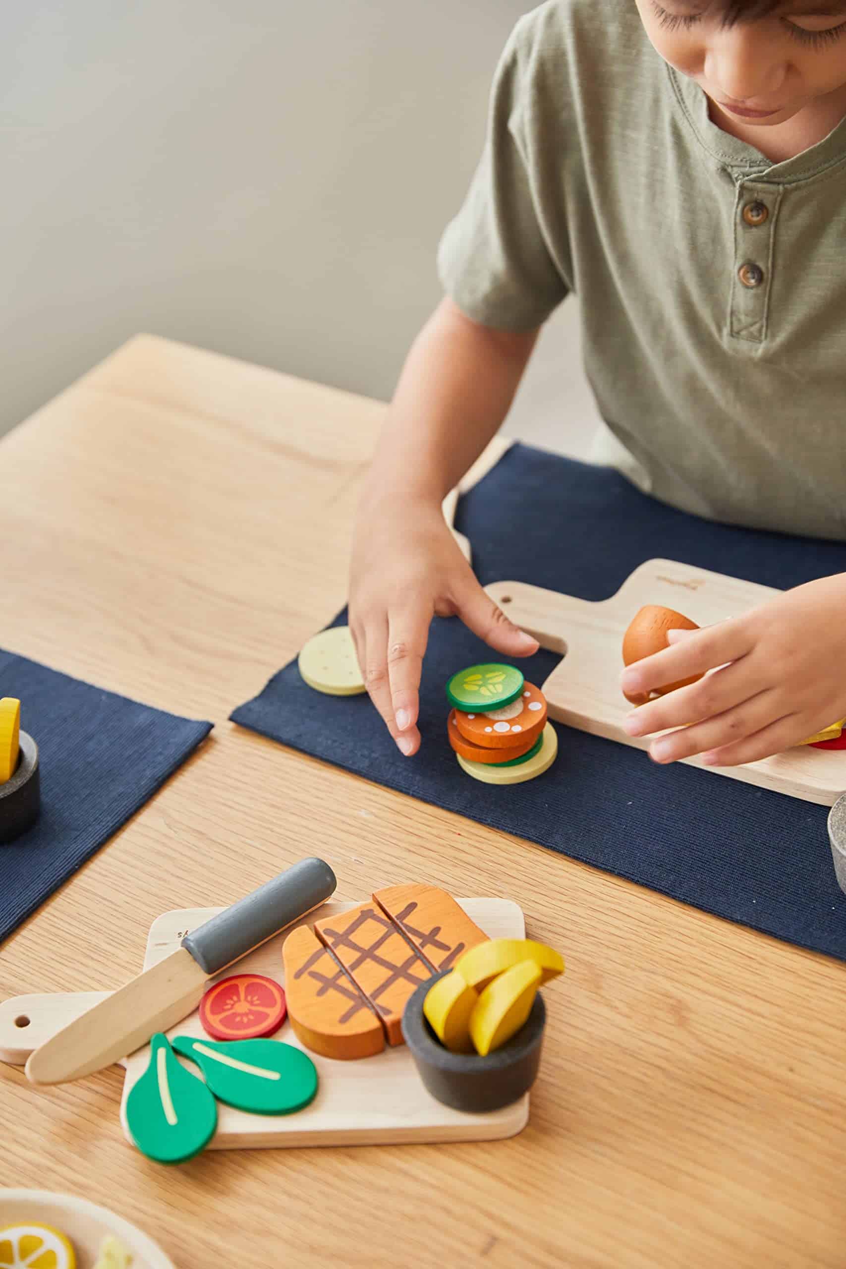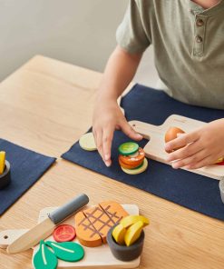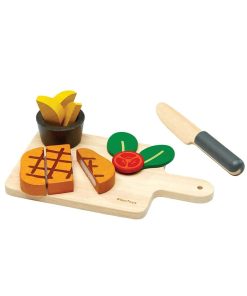 Es importante enseñar a los niños los beneficios de una comida bien balanceada. Con este set, los niños pueden preparar un filete al estilo occidental para ellos mismos o para un invitado. Este set incluye 1 tomate partido por la mitad, 3 gajos de papa, 2 hojas de lechuga, 1 taza de salsa, 1 cuchillo, 1 filete de res rebanable y 1 tabla de cortar. Anima a un joven chef a desarrollar un extenso menú combinando este set con otros alimentos y utensilios de cocina de juguete de PlanToys.