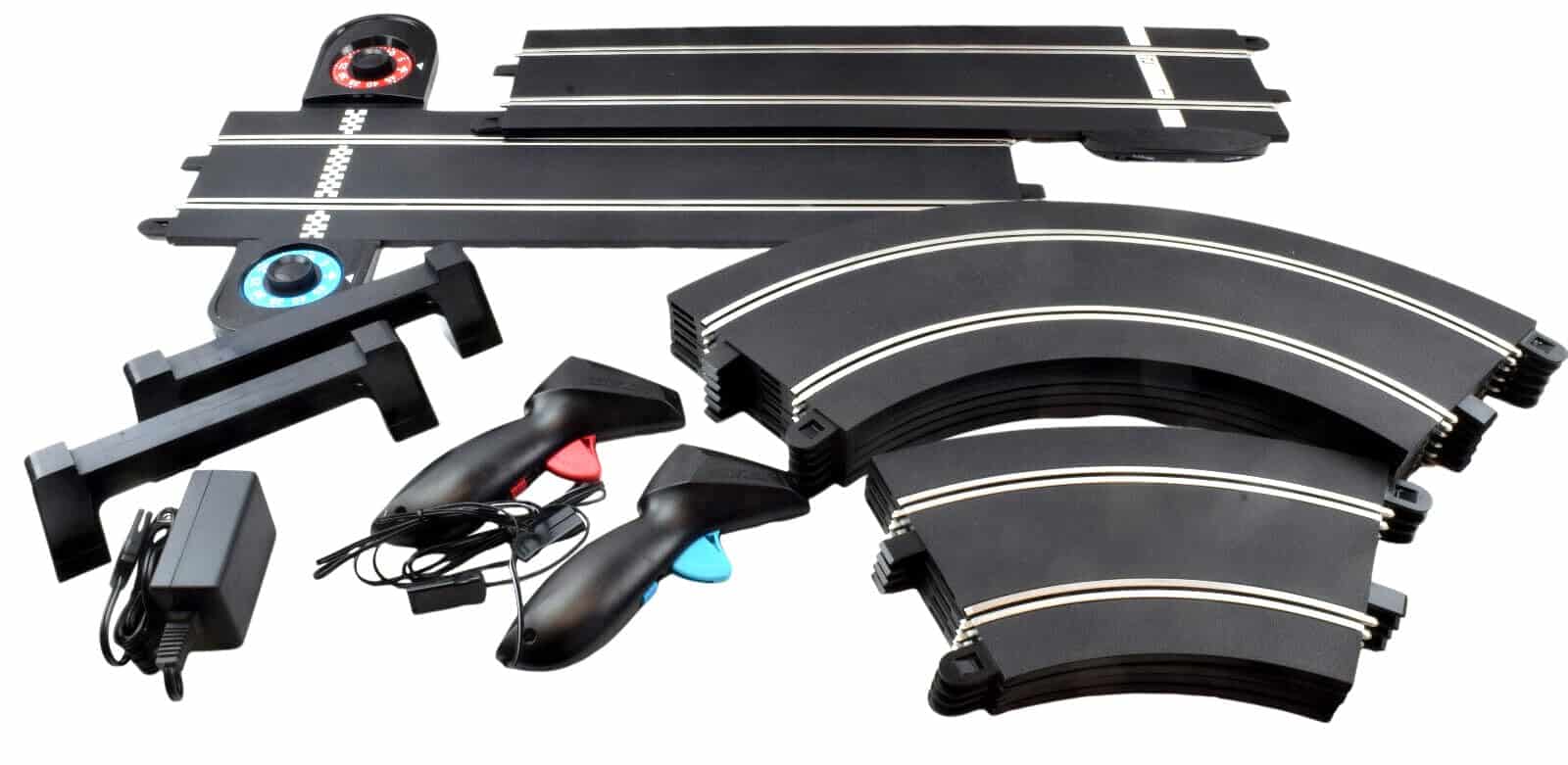 Incluye: 1 Pista Completa (Pista, Transformador y Controles) y 2 Autos