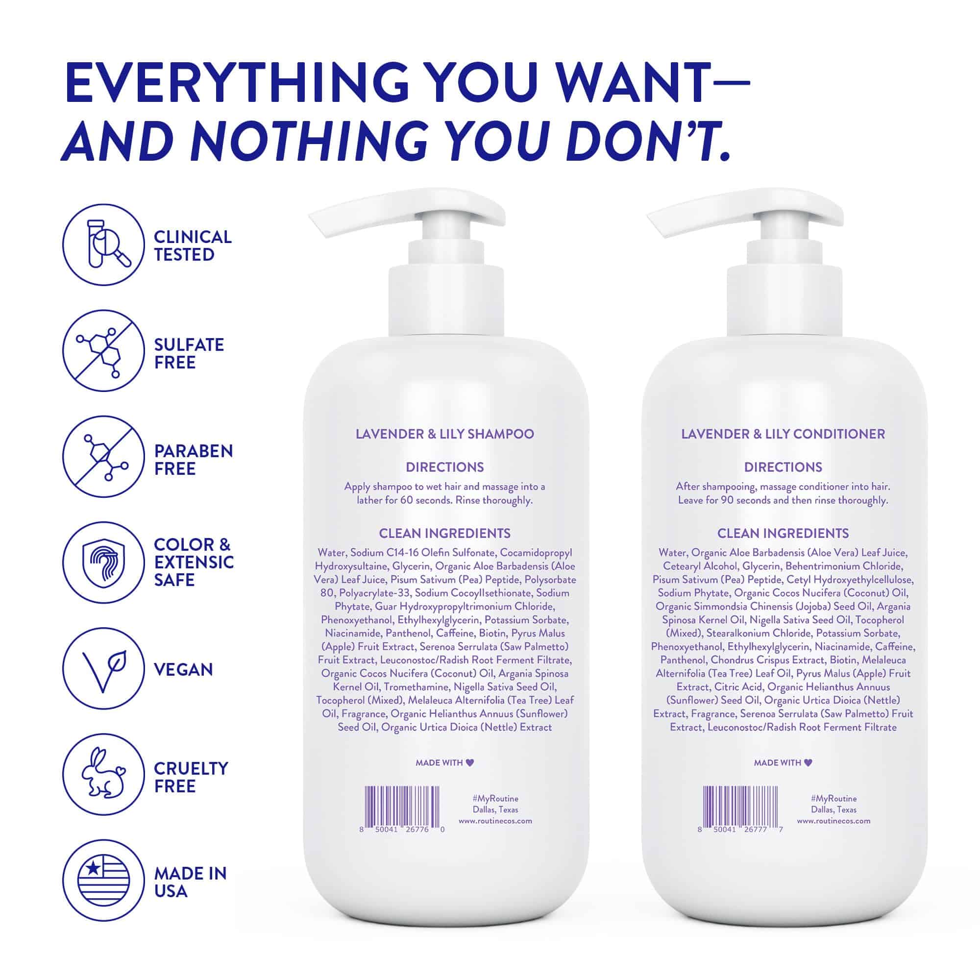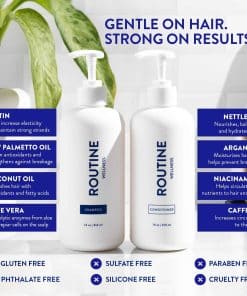 Nuestro set de champú y acondicionador anti-caída Routine Wellness ha sido especialmente formulado para combatir la pérdida de densidad del cabello causada por el quiebre. Con una combinación de ingredientes de alta calidad como biotina, aceite de palma enana (un ingrediente bloqueador de DHT), aceite de argán y aceite de ortiga, nuestro champú y acondicionador proporcionan las vitaminas esenciales que tu cabello necesita para lucir más fuerte y con más volumen.