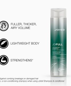 Ofreciendo un impulso de volumen de 24 horas y una espuma lujosa, el Champú Voluminizador Joico JoiFULL enjuaga el aceite y la suciedad que apesadumbran los mechones finos, brindando cuerpo, plenitud mega y brillo, junto con protección contra la humedad. El Acondicionador Voluminizador Joico JoiFULL desenreda instantáneamente mientras agrega cuerpo aireado, volumen y plenitud al cabello fino.