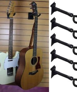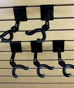 Incluye cinco (5) Ganchos Ajustables para Guitarra e Instrumentos de Cuerda, y cinco (5) soportes de montaje de pared con ranuras. El soporte de cuello está cubierto con almohadilla de espuma suave para evitar daños al instrumento. Construido con acero de alta calidad con acabado negro satinado. Soporta guitarras y otros instrumentos de hasta 60 lbs. (27.21kg). Ajusta horizontalmente hasta 270 grados, a ángulo deseado. Longitud del brazo de soporte varía de 6.125 a 7 pulgadas (15.5cm a 17.75cm) dependiendo del ángulo horizontal. Ancho del soporte de cuello es de 2 pulgadas entre cada brazo. Puede montarse con tornillos o pernos (no incluidos) en casi cualquier superficie. Soporte de pared incluido, permite montaje en panel de ranuras estándar de 3″ OC sin necesidad de otro hardware. Adecuado para uso en tiendas de instrumentos musicales, casas de empeño, tiendas de segunda mano, etc. Funciona genial para Guitarras, Banjos, Bajos, Violines, Violas, Mandolinas ¡incluso para el controlador de Guitar Hero/Rock Band Guitar!