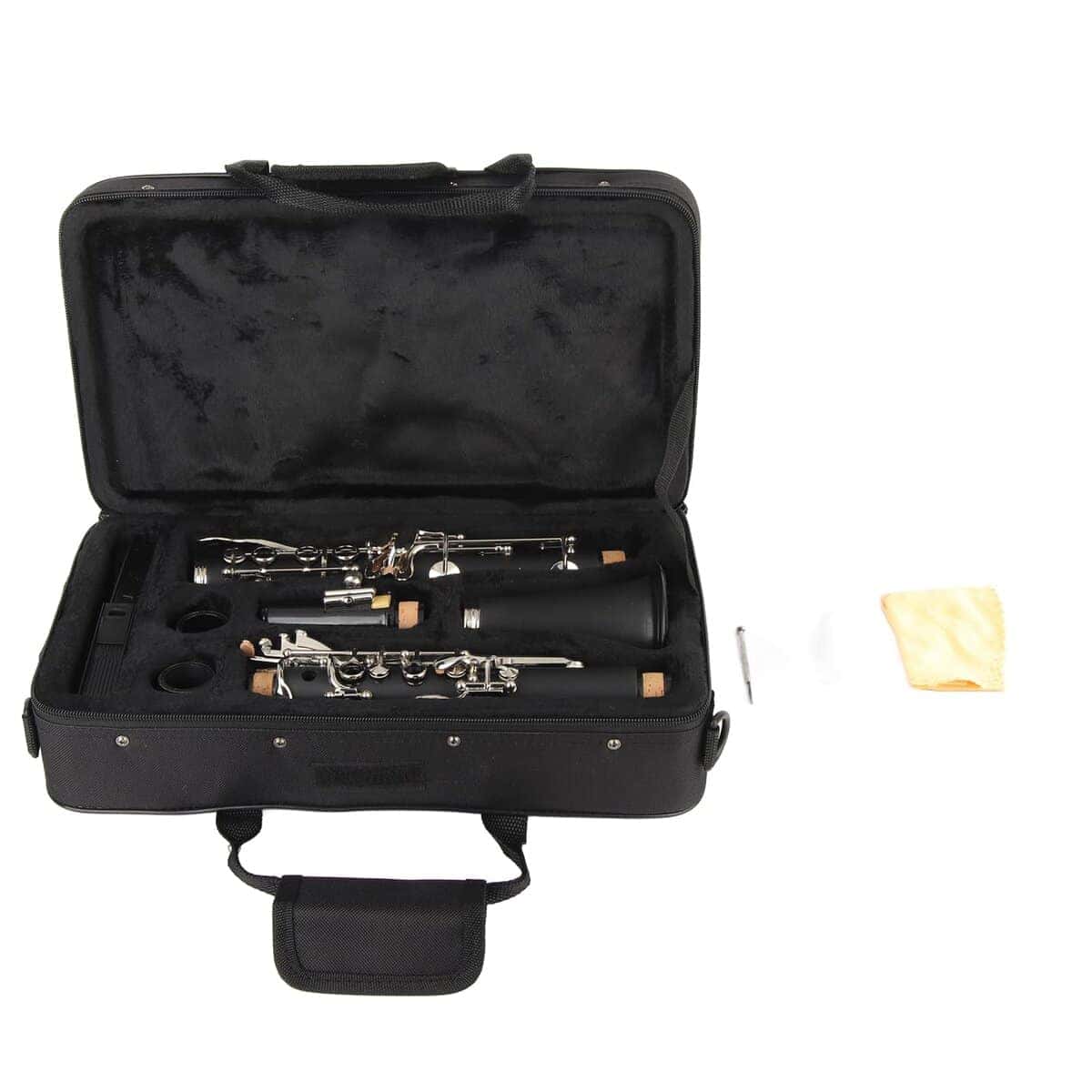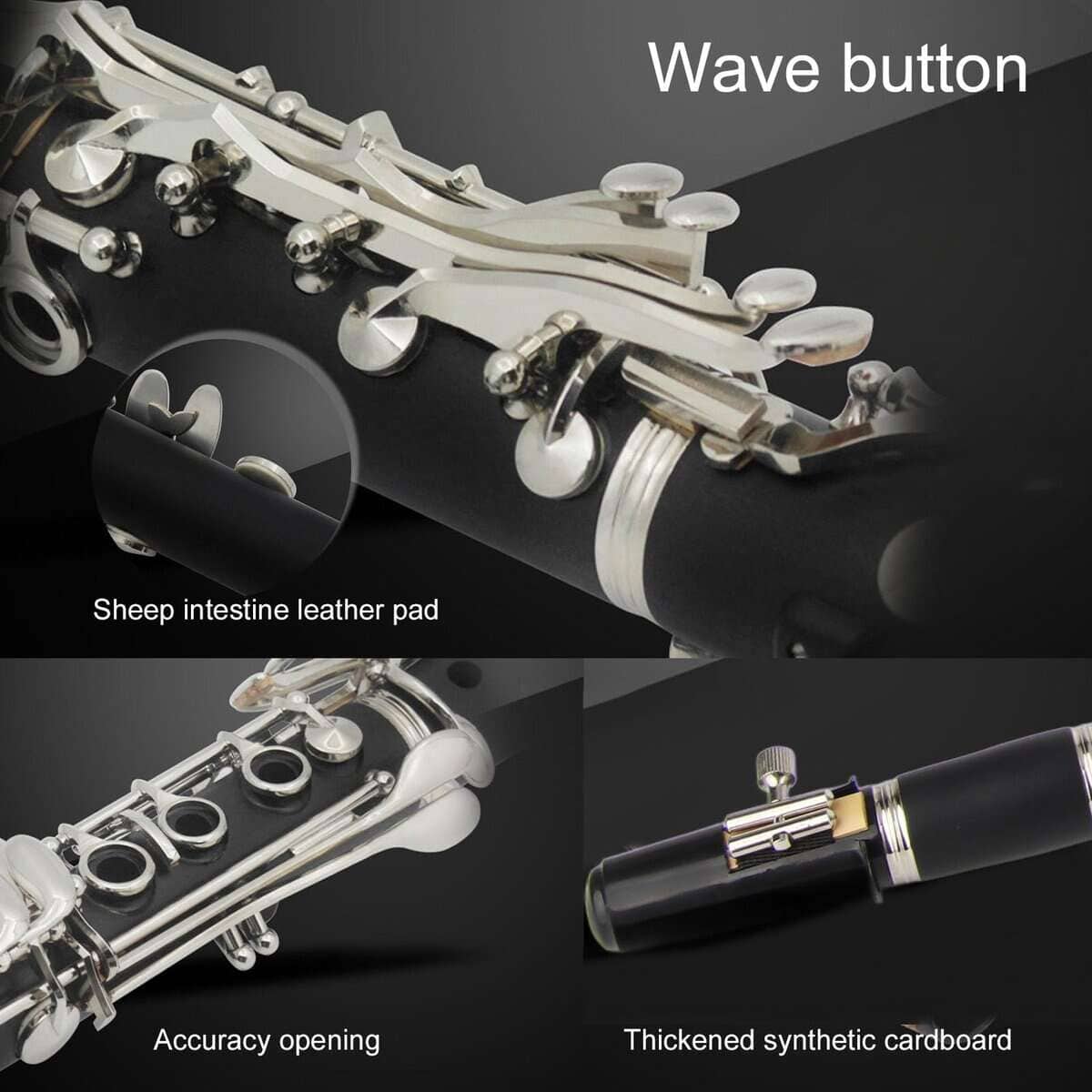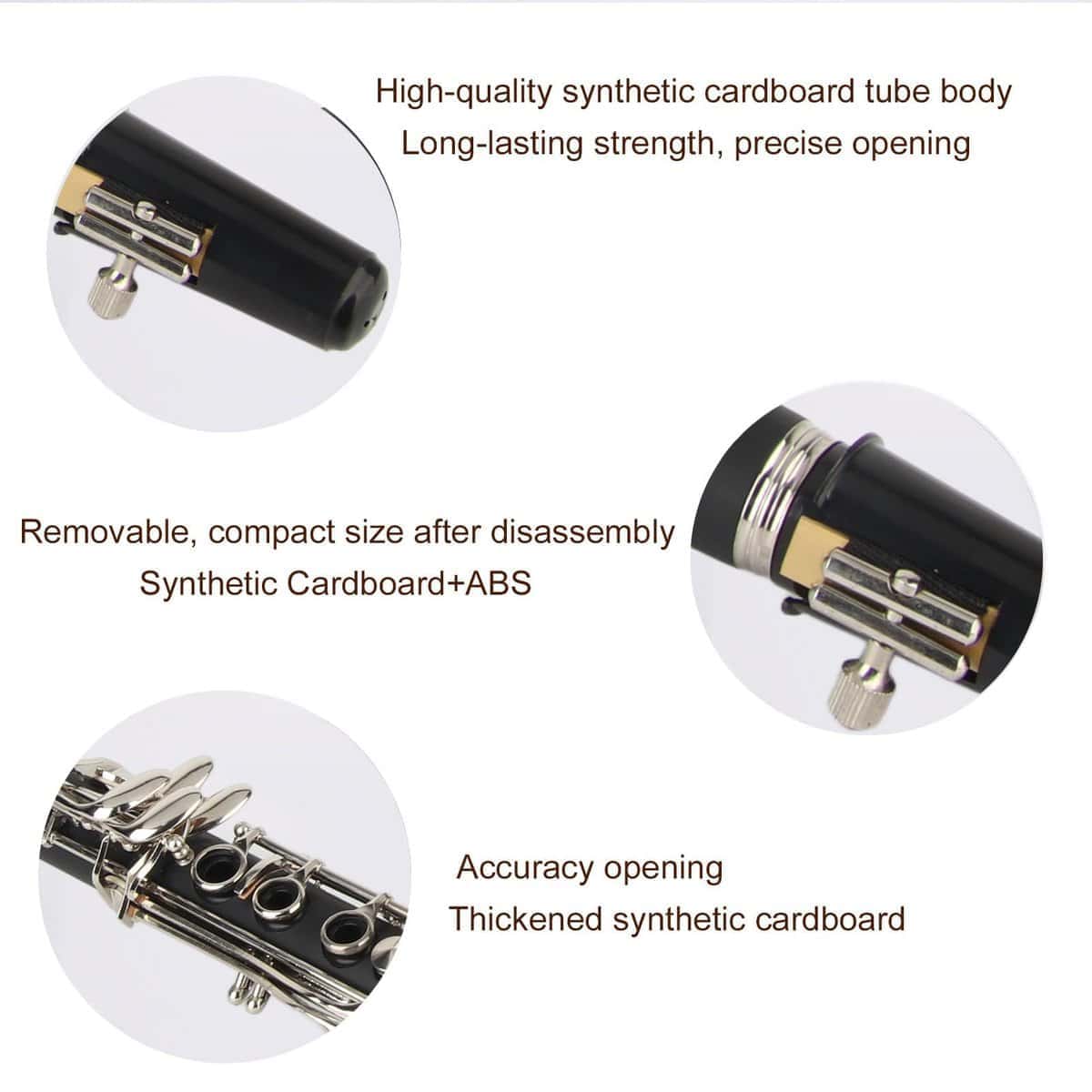 Característica: 1. Cuerpo de tubo de cartón sintético de alta calidad, larga vida útil, fácil de mantener, y no se agrietará debido a los cambios de temperatura y humedad. 2. Resistencia duradera, abertura precisa, creando una calidad de sonido general y también duradera. 3. Este set de clarinete incluye paño de limpieza, caña, destornillador y estuche, todo lo que necesitas está equipado. 4. Hecho de material ABS y cartón sintético, con 17 llaves, que pueden satisfacer tus necesidades y mejorar tu experiencia. 5. Desmontable, tamaño compacto después del desmontaje, fácil de almacenar, no ocupa espacio. Especificaciones: Condición: 100% Nuevo Tipo de Artículo: Set de Clarinete Material: Cartón Sintético + ABS Tamaño: Aprox. 66×7.5cm Paquete Incluye: 1 x Clarinete (6 Segmentos) 1 x Set de Clarinete 1 x Pinza de Caña 1 x Destornillador 1 x Paño Cuadrado 1 x Correa