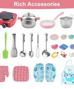Este set de cocina para juego de rol incluye 22 piezas para que los niños puedan jugar a cocinar de forma segura y fácil. Incluye una mini estufa, delantal, manopla de horno, recetas y otros accesorios de cocina para que los niños puedan aprender habilidades culinarias mientras se divierten. Los juguetes de cocina están hechos de materiales de alta calidad y seguros para los niños. Además, son fáciles de limpiar y almacenar, lo que los convierte en el regalo perfecto para cualquier niño que disfrute jugando a cocinar. ¡Adquiere este set de cocina para juego de rol y deja que los niños se conviertan en chefs independientes en su propia cocina imaginaria!