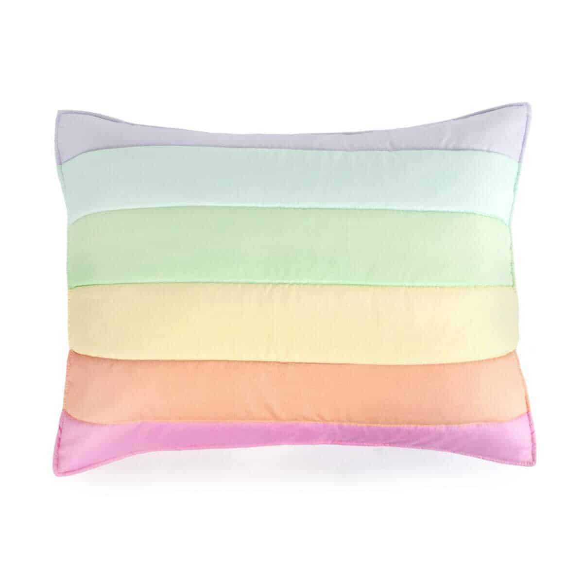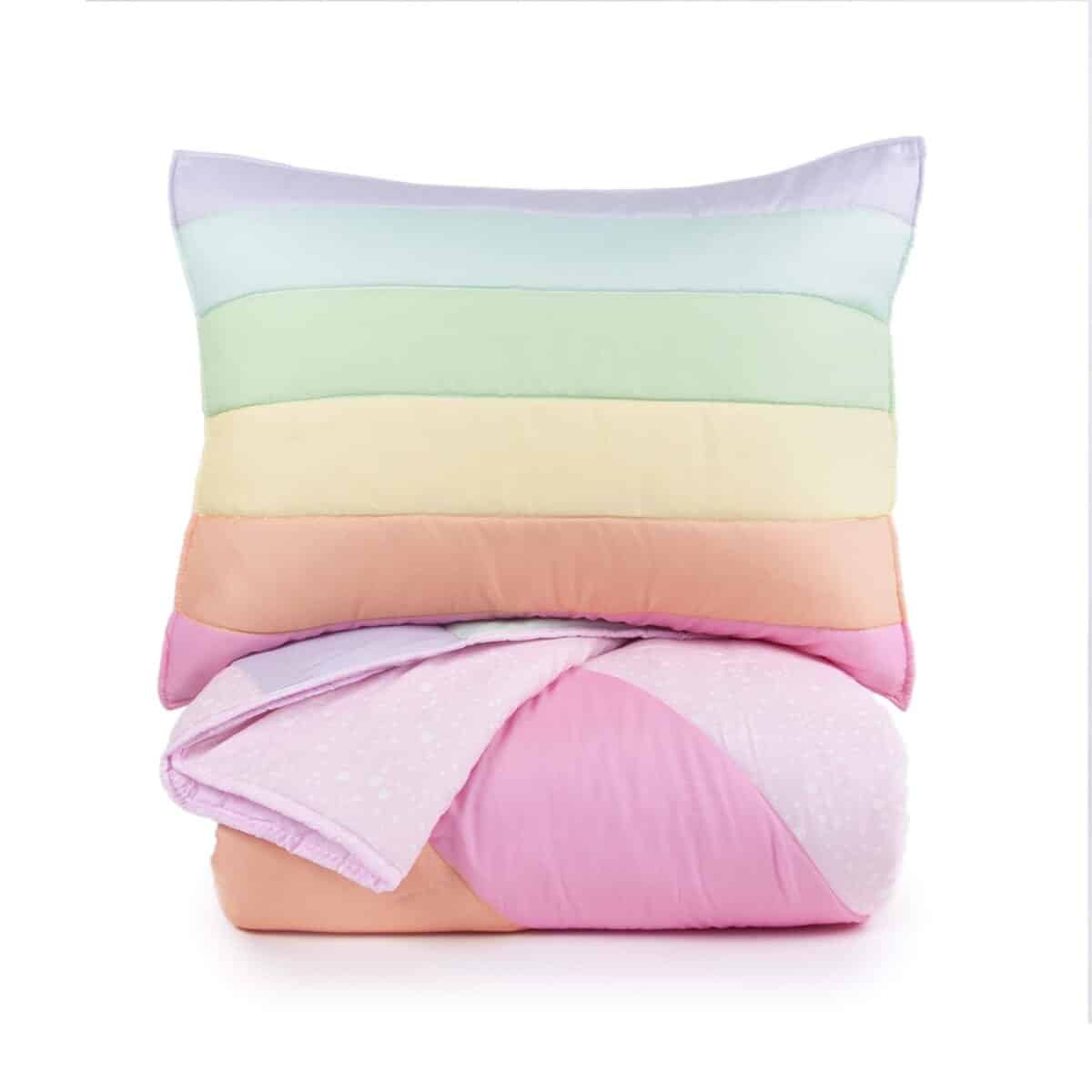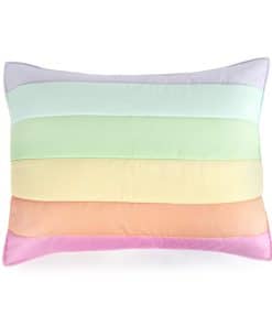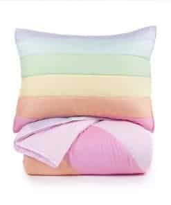 Set de colcha arcoíris de 3 piezas para niños de tamaño completo. El set incluye 1 colcha y 2 fundas a juego. Hecho de fibra de poliéster microdenier 100%, este set es hipoalergénico y resistente a encoger, estirar y arrugarse. Las dimensiones de la colcha son 86″x86″ y las fundas miden 20″x26″ cada una. Fácil de cuidar, este set se puede lavar y secar a máquina sin problemas.