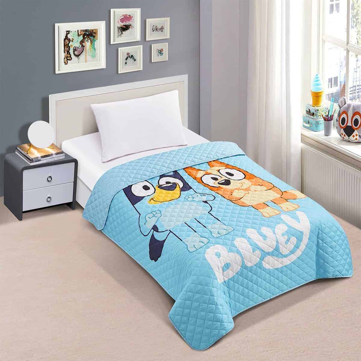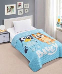 Set de Colcha Bluey para Cama Individual para Niños – Incluye Colcha Acolchada Bluey para Cama Individual más Pegatinas, Más | Juego de Ropa de Cama Bluey para Niños. Este set de ropa de cama Bluey incluye una colcha acolchada para cama individual con una linda y colorida obra de arte de Bluey y Bingo. Hecho de material suave, los niños seguramente amarán dormir con su nueva colcha de Bluey y los padres seguramente amarán que la colcha está hecha para durar. Seguro que será un éxito con todos los fans de Bluey, niños y niñas por igual, este set de ropa de cama es perfecto para regalar a tu entusiasta favorito de Bluey. El set de ropa de cama de tamaño individual oficial de Bluey también incluye pegatinas de Bluey y un colgador de puerta de Barn Bots.