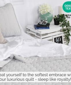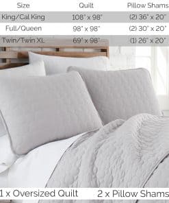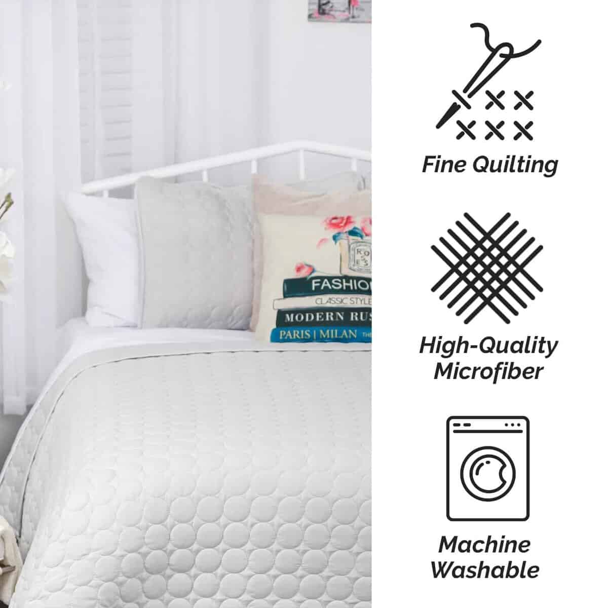 1. RENUEVA TU DORMITORIO: Actualiza tu dormitorio con un juego de colcha Twin de alta calidad. Nuestro juego de cubrecama Twin XL incluye todo lo que necesitas para una estética de decoración de habitación lujosa, desde el cubrecama Twin XL hasta las fundas de almohada coordinadas. 2. FACILIDAD DE CUIDADO, ROPA DE CAMA RESISTENTE AL PELO DE MASCOTAS: Echa la colcha Twin Size / Twin XL en la lavadora y sécala a baja temperatura para una rápida actualización. El cabello de mascota se elimina fácilmente, así que siéntete libre de abrazar a tus mascotas. Nuestra colcha de microfibra se vuelve más suave después de cada lavado. 3. AJUSTE VERSÁTIL PARA CUBRECAMA TWIN Y TWIN XL: Nuestro juego de colchas gris claro Twin tiene una longitud suficiente para colchones Twin XL. La microfibra lavable a máquina y secable al aire hace que estas colchas extragrandes sean suaves al tacto, preciosas y fáciles de mantener con aspecto nuevo. 4. EMPRESA DE PROPIEDAD LOCAL, ENFOCADA EN EL CLIENTE: En Southshore Fine Linens, estamos al 100% enfocados en ofrecerte ropa de cama premium. 5. EL JUEGO DE COLCHA TWIN / TWIN XL INCLUYE: 1 colcha de 69″ de ancho x 98″ de largo; 1 funda de almohada estándar de 20″ x 26″; La microfibra no se encoge asegura que estas colchas mantengan su tamaño generoso, para una cobertura de longitud completa en los lados y pies de tu cama Twin XL o Twin.