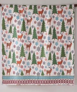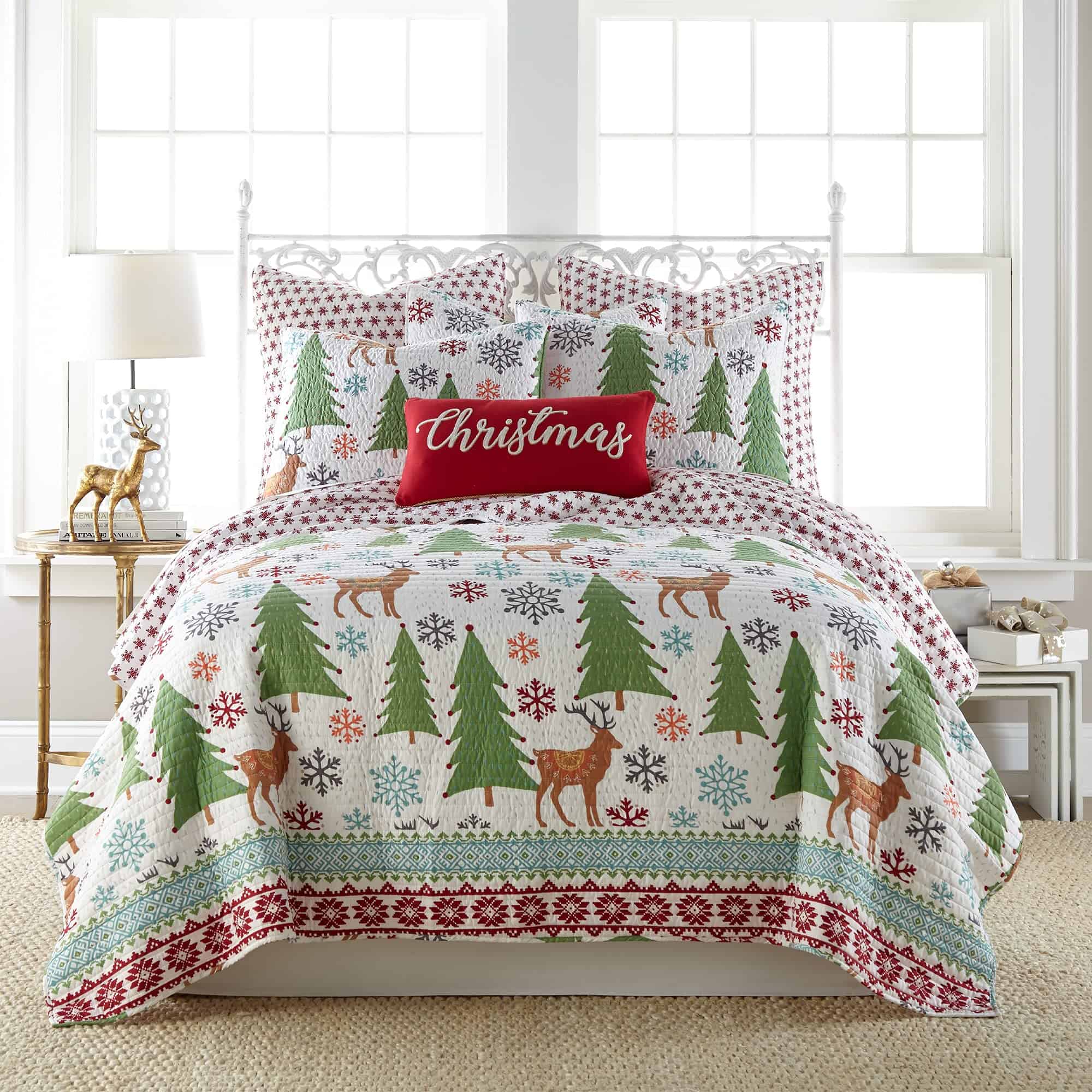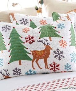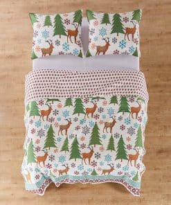 One of our most popular holiday items, Tinsel is inspired by a cheerful and festive forest scene, with a collection of colorful snowflakes, ornaments and decorative reindeer on the front and a charming reverse pattern of red snowflakes on a white ground. A bound border provides contrast and texture to complete the look. Made from a soft, brushed microfiber that will never feel heavy, stiff or uncomfortable, the Tinsel quilt and pillow sham set has an ultra soft feel that you’ll simply love. Our quilt is very generously sized to give your bedroom a feeling of comfort and luxury. Pre washed for your convenience, the Tinsel quilt and pillow sham set is easy to look after. Simply machine wash on a cold, gentle cycle, then line dry or tumble dry at low temperature. Create a festive holiday space with our coordinated reversible Tinsel matching bed set. The traditional red and green, mixed with fun aqua, orange and grey accents design brings colorful, bright, festive fun holiday accents into your home. You can also freshen your room with matching coordinating decorative pillows and quilted throw from the Levtex Home collection.